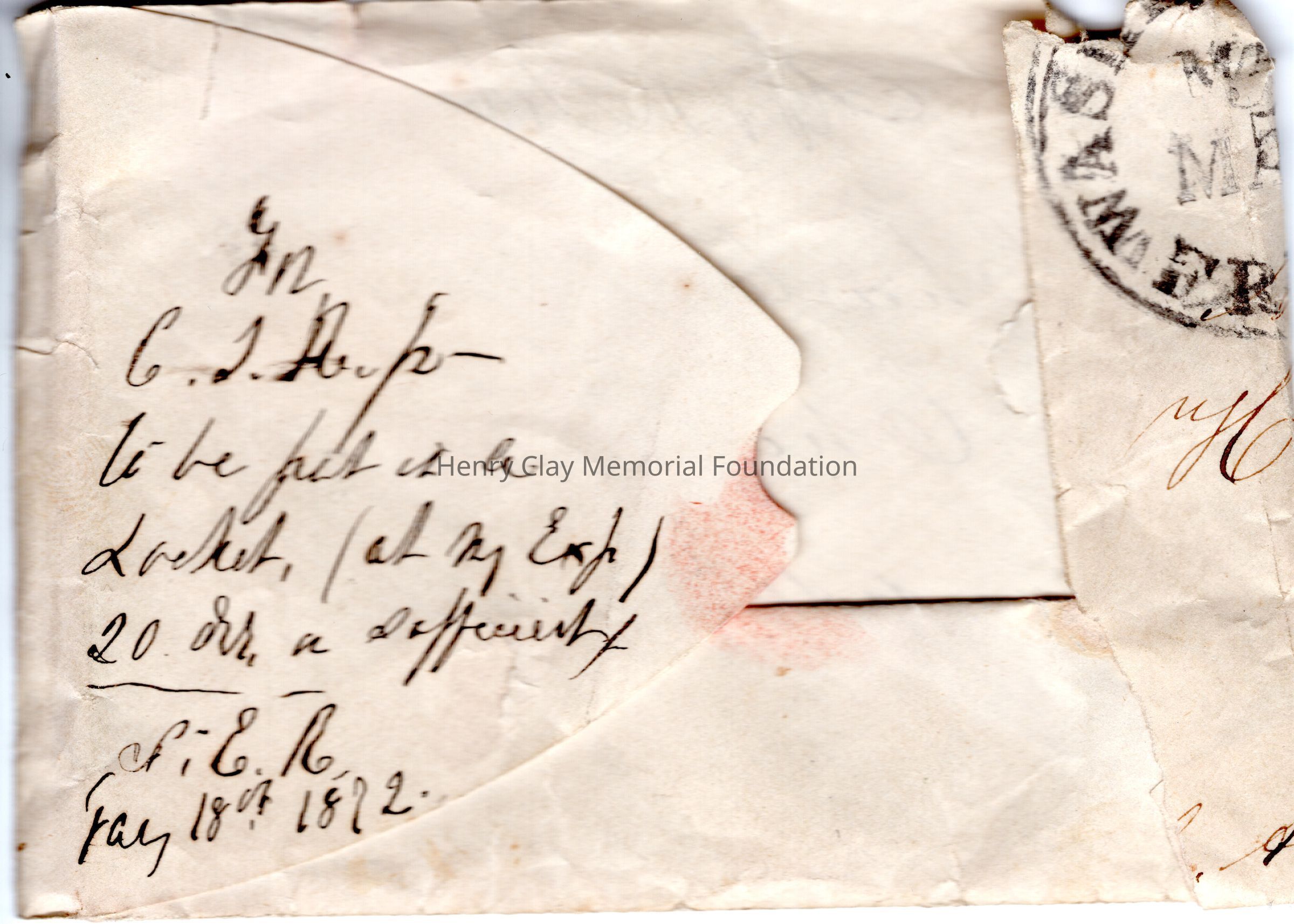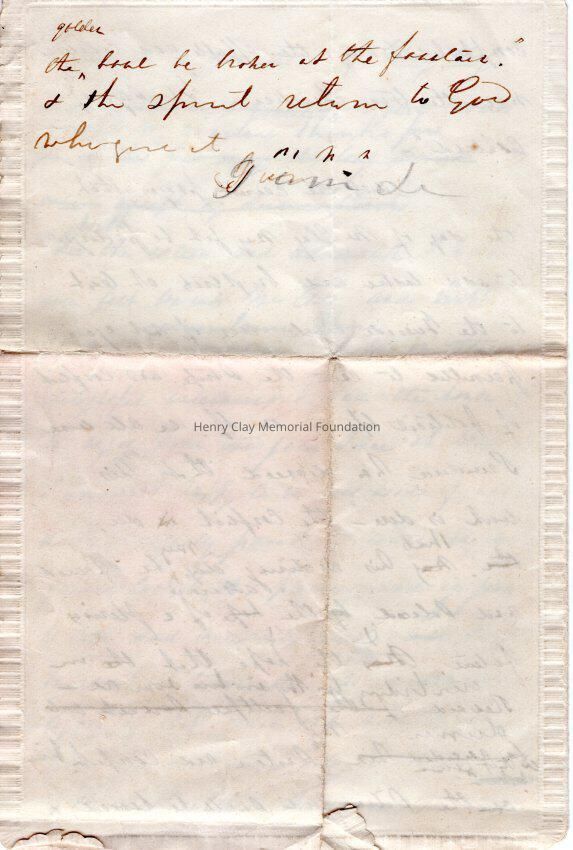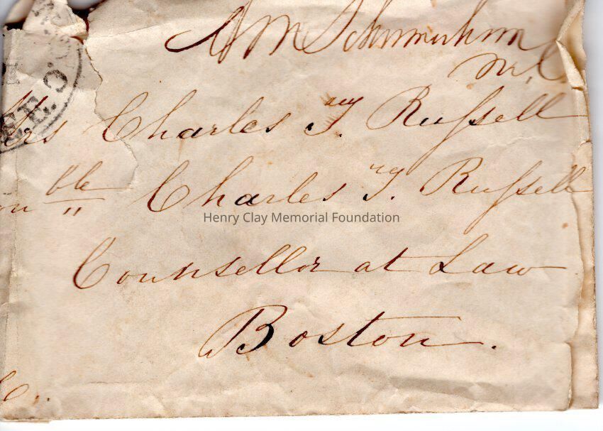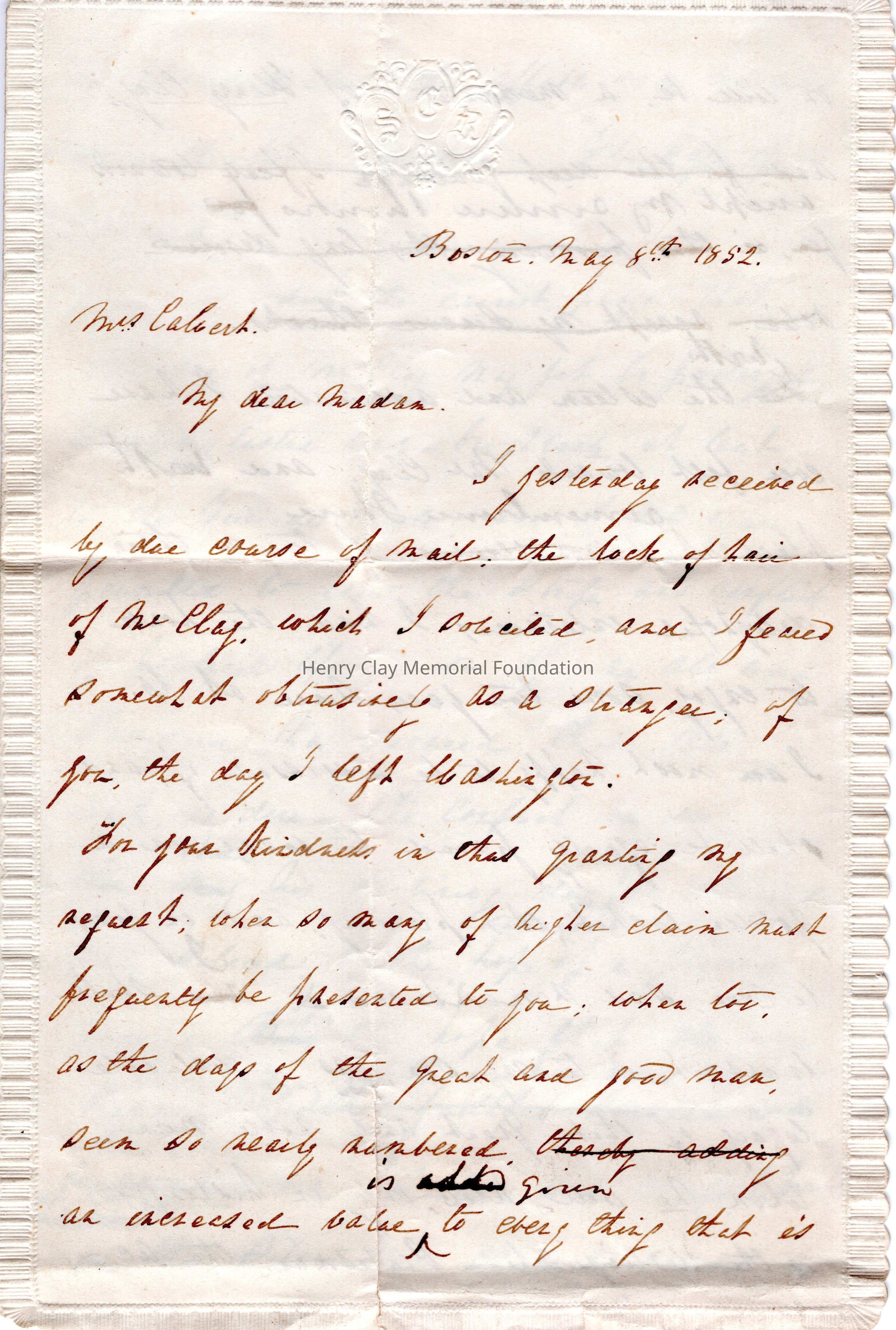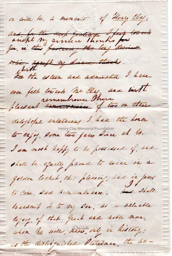 2017.011.0002A - Letter apparently from Charles T. Russell to Mrs. Charles Calvert of Maryland thanking her for a lock of Henry Clay's hair, extolling Henry Clay's virtues and expressing Russell's intent for the lock to be a tangible legacy for his son (born in 1851) who will only know Clay as a historical figure.
