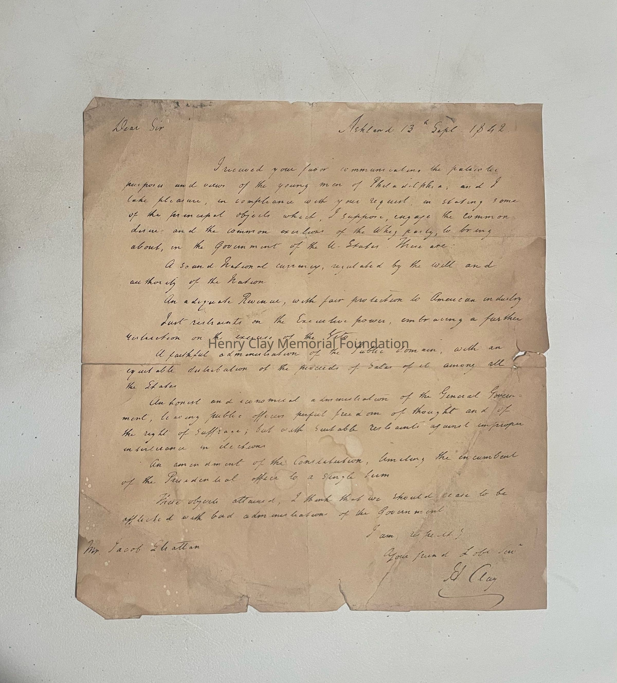 A letter written by Henry Clay, dated September 13, 1842.