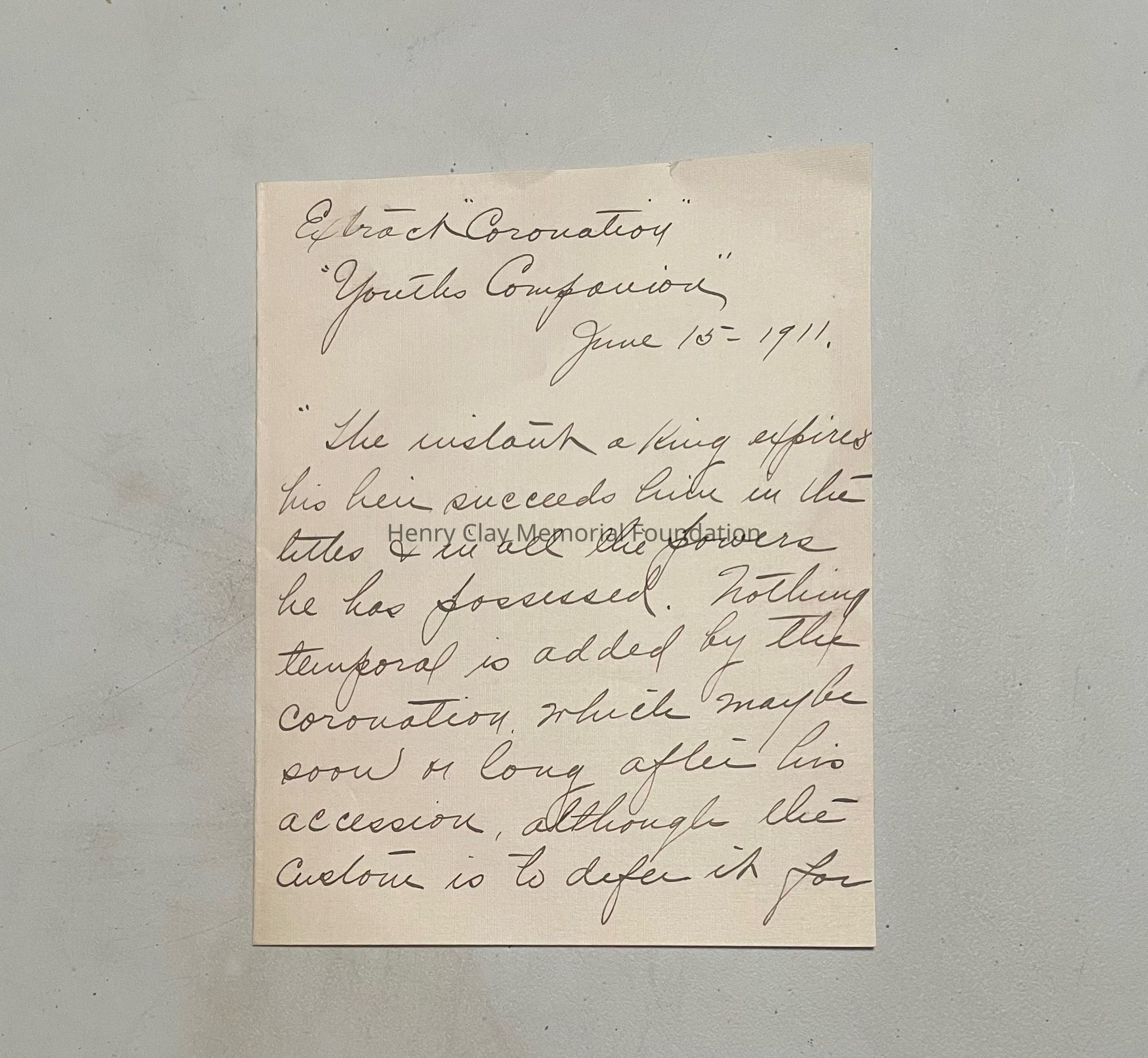 A piece of paper with writing on it. folded in half, writing on the front sides only. Dated June 15, 1911.