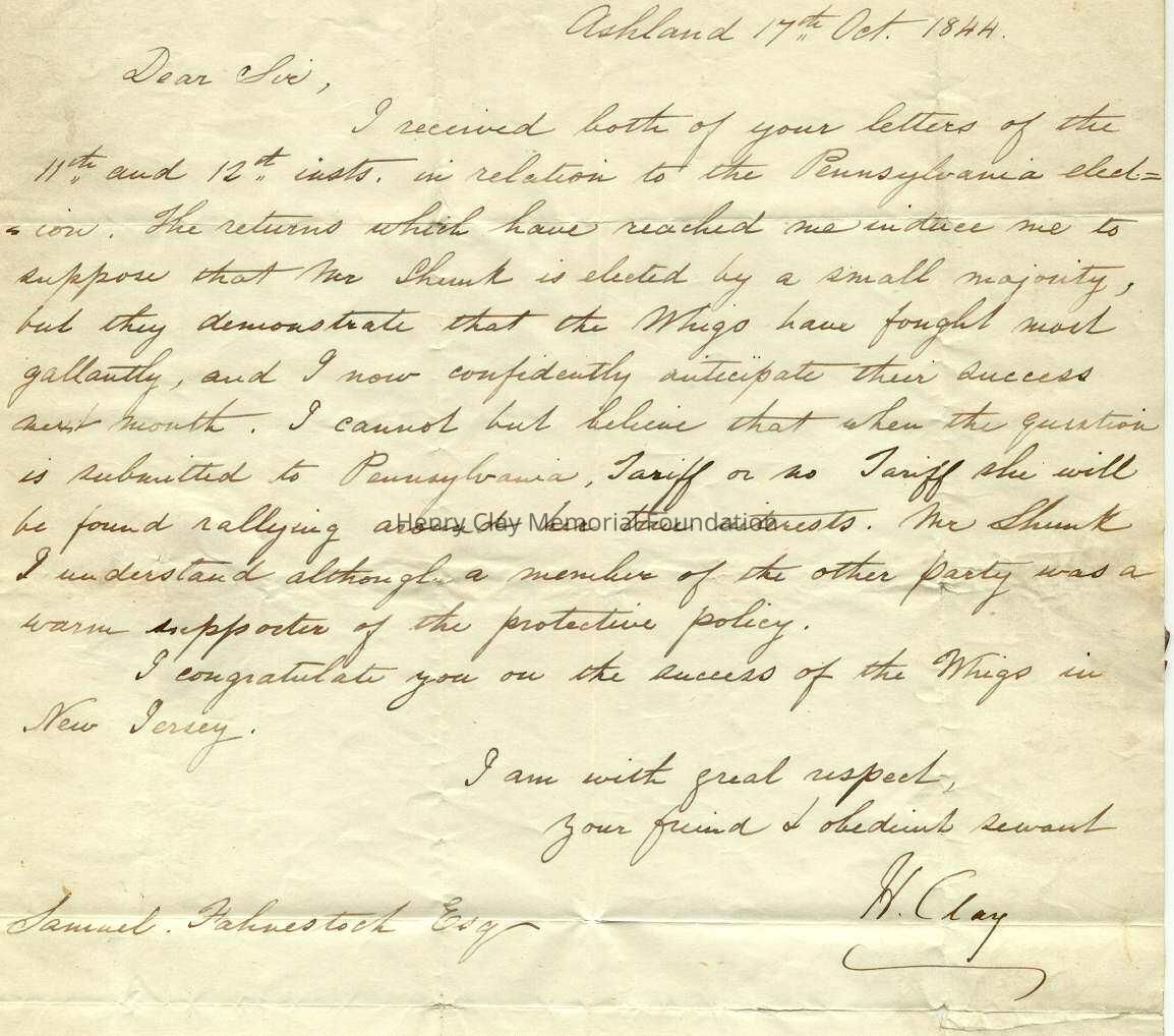 This letter was written towards the climax of the 1844 Presidential campaign and in it Henry Clay discusses the gubenatorial election in Pennsylvania and its ramifications for the national election. This letter is a candid view of Henry Clay's mindset and feelings in the final days of his last and most significant campaign.