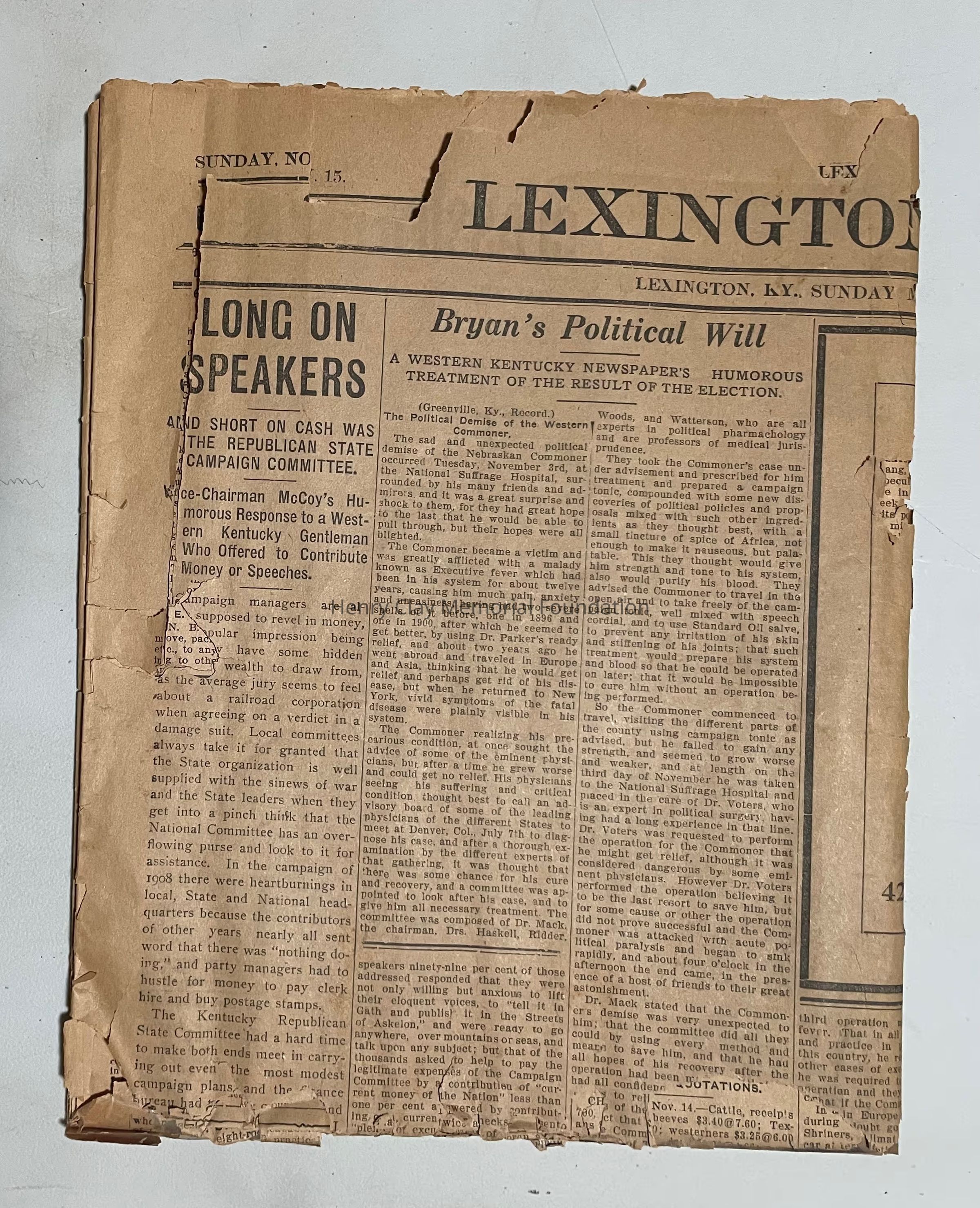 A copy of the Lexington Leader Newspaper from Sunday, November 15, 1908.