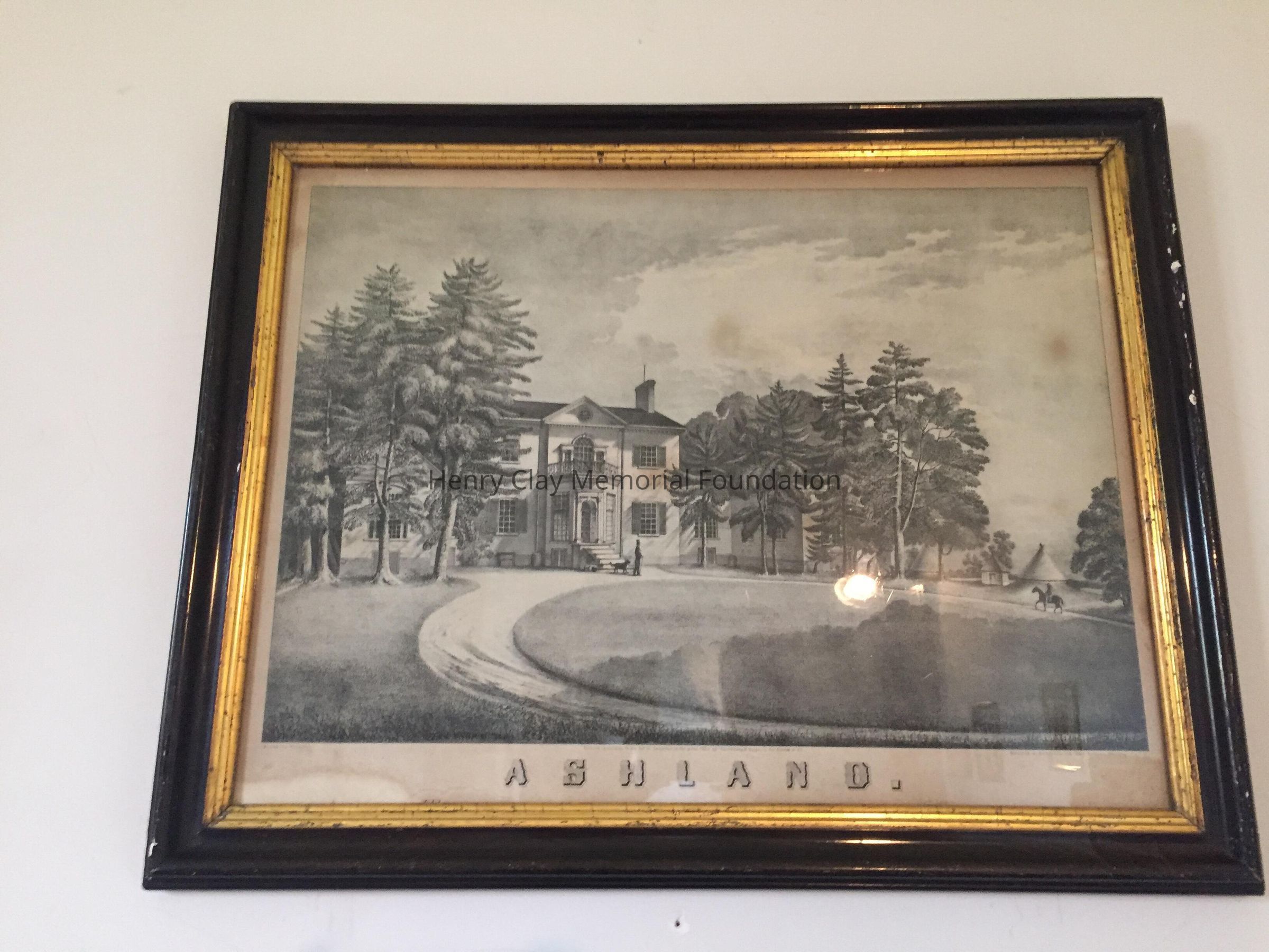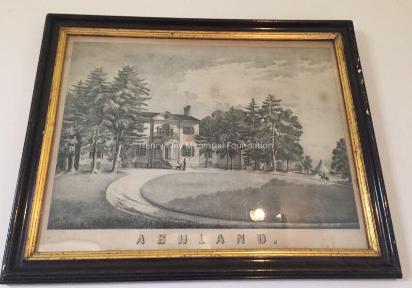 Tinted lithograph, view of the Federal style version of Ashland as viewed from the Northwest, shows Henry Clay, "Drawn by Gorentz. Entered according to an Act of Congress in the year 1852 by Thornburg & Cooper in the district of KY. Middleton & Anderson lith Odd Fellows Building Cinti O. / Ashland / The Residence of the Late Hon. Henry Clay."