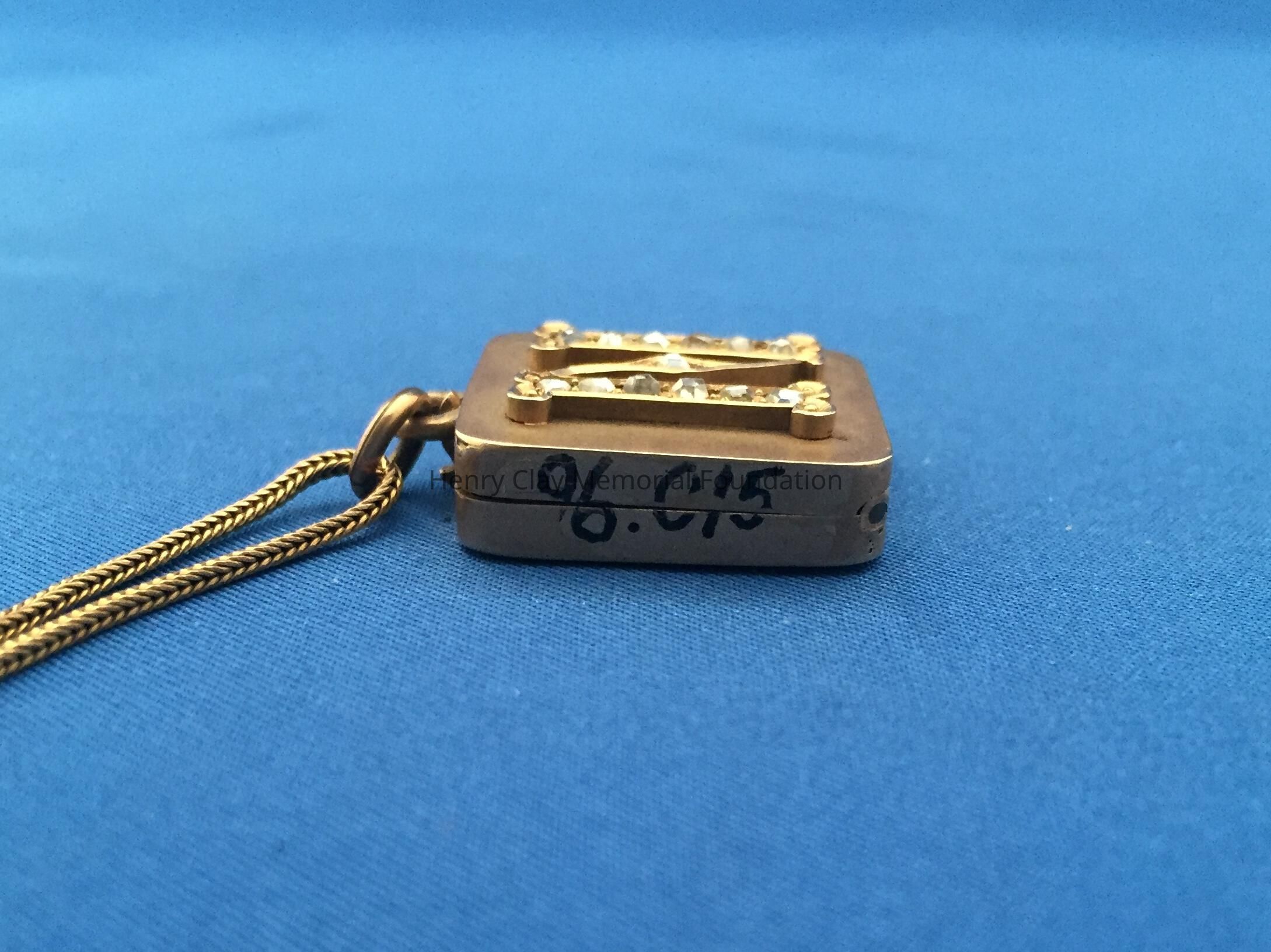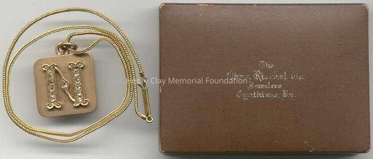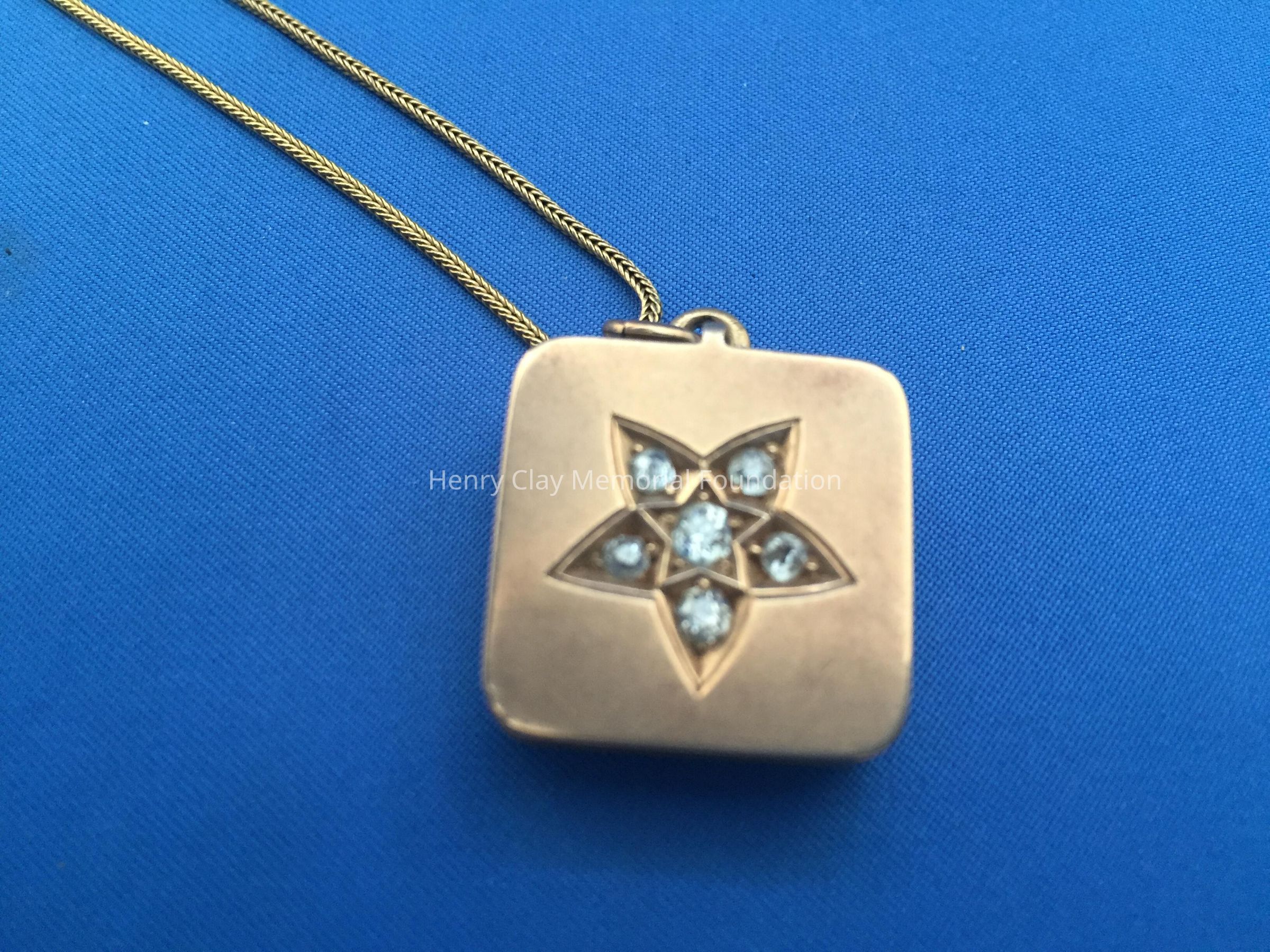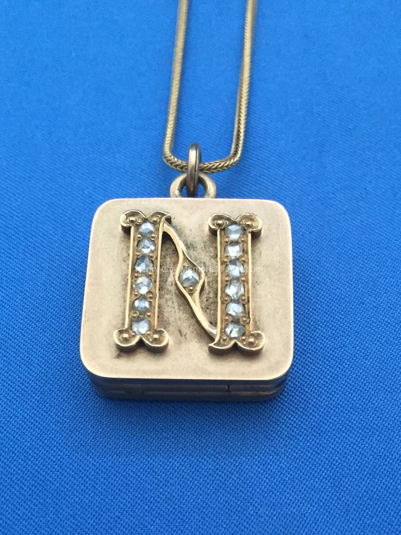 Ladies square, gold locket suspended on 18k yellow gold, thin, fox tail chain. Locket is fashioned in 18k yellow gold on one side with initial "N" designed with 13 rose-cut diamonds (.26 carats). Opposite side of locket is a star design with six "Old Mine" cut diamonds. Locket opens to expose a miniature photo of Dr. Thomas S. Bullock. Locket is contained in original [?] brown jeweler's box. Box stamped with jeweler's name in white letters, partially illegible: "The / [illegible] / Jewelers / Cynthiana, Ky."