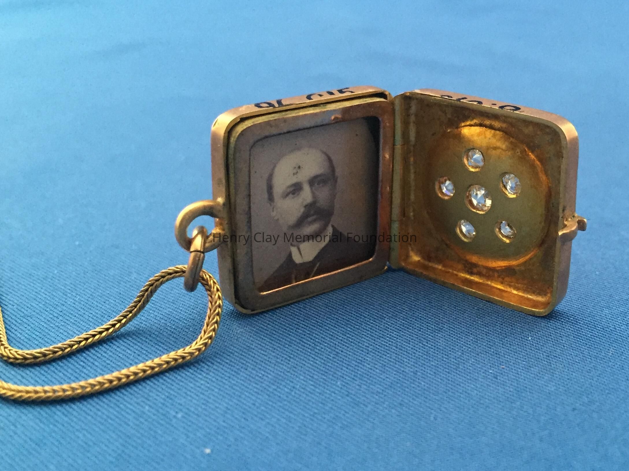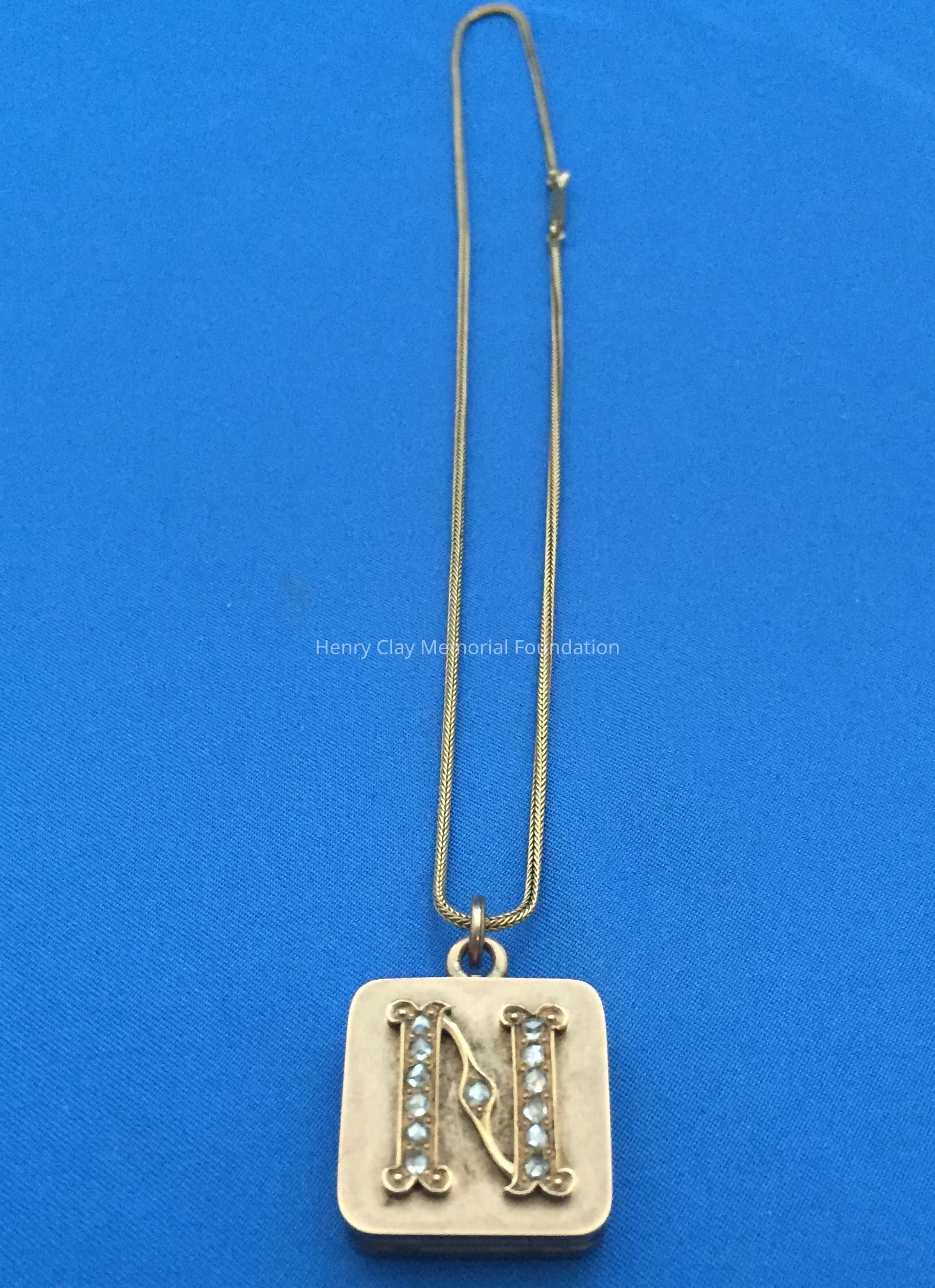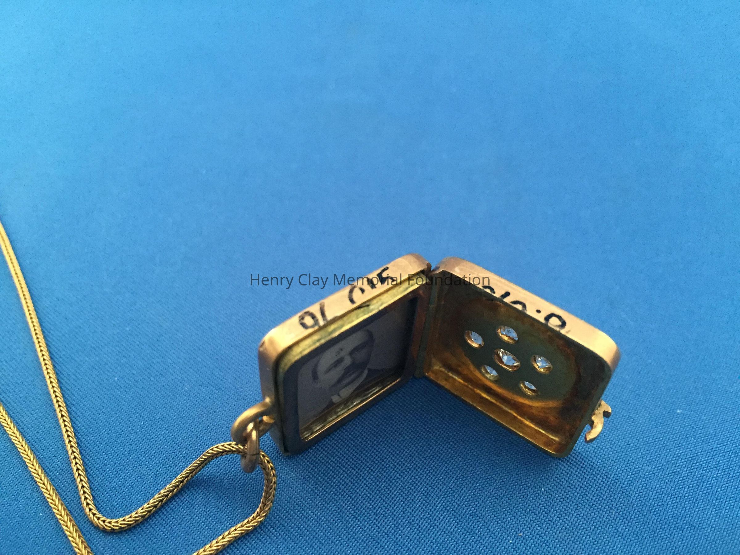 Ladies square, gold locket suspended on 18k yellow gold, thin, fox tail chain. Locket is fashioned in 18k yellow gold on one side with initial "N" designed with 13 rose-cut diamonds (.26 carats). Opposite side of locket is a star design with six "Old Mine" cut diamonds. Locket opens to expose a miniature photo of Dr. Thomas S. Bullock. Locket is contained in original [?] brown jeweler's box. Box stamped with jeweler's name in white letters, partially illegible: "The / [illegible] / Jewelers / Cynthiana, Ky."