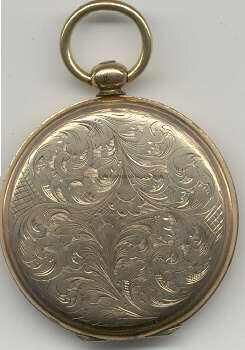 Round gold and silver locket with stem and loop at top. Outside of locket highly engraved. Contains two glass plate daguerreotypes, the one on the left a white-haired young man with high collar and cravat, the other on the right of an old woman wearing a white bonnet.