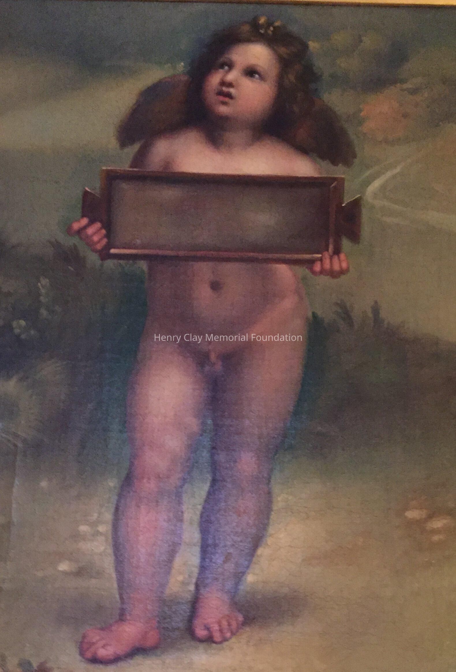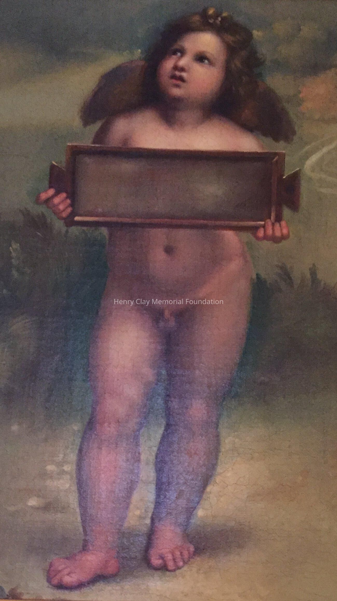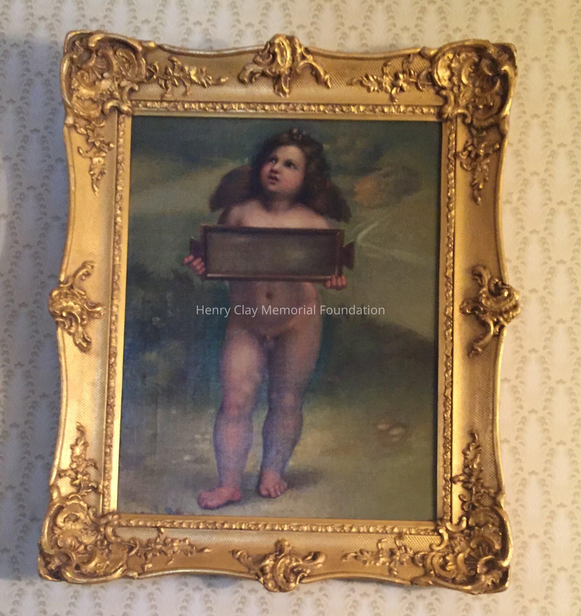 Oil on canvas of angel holding a tablet. Artist unknown. In ornate gilt frame.