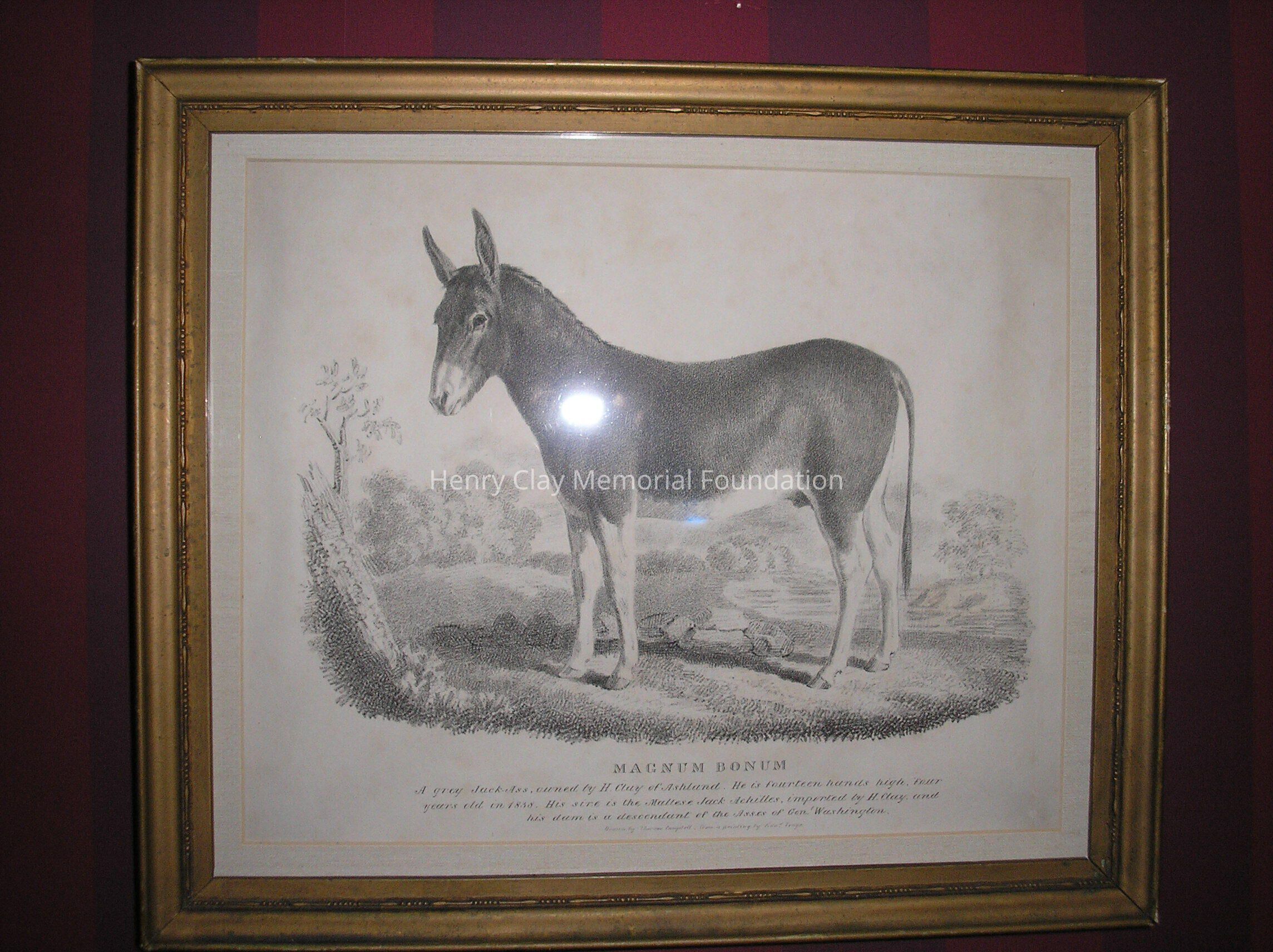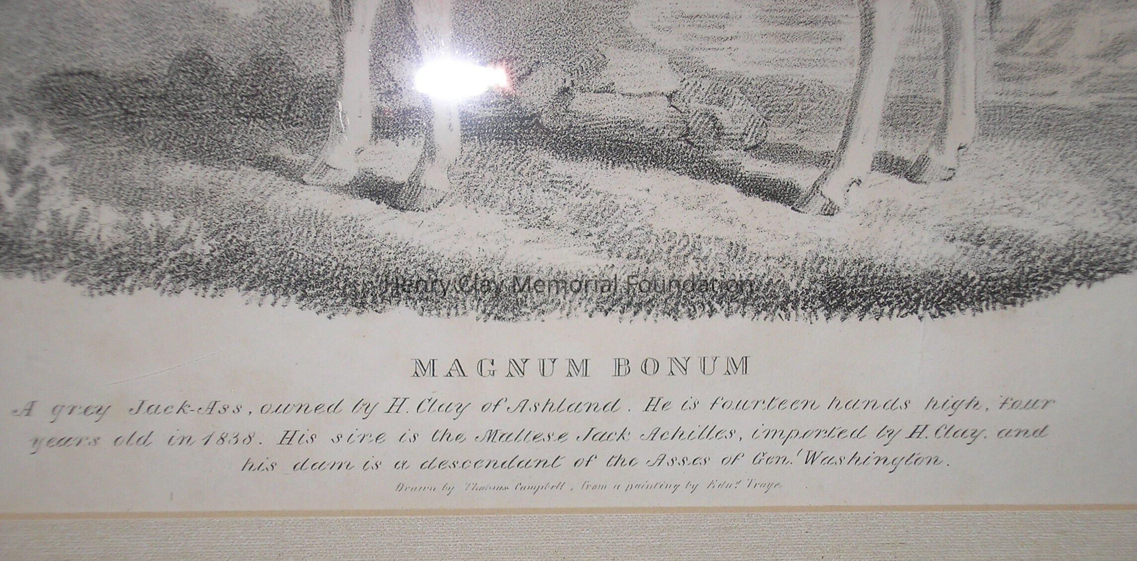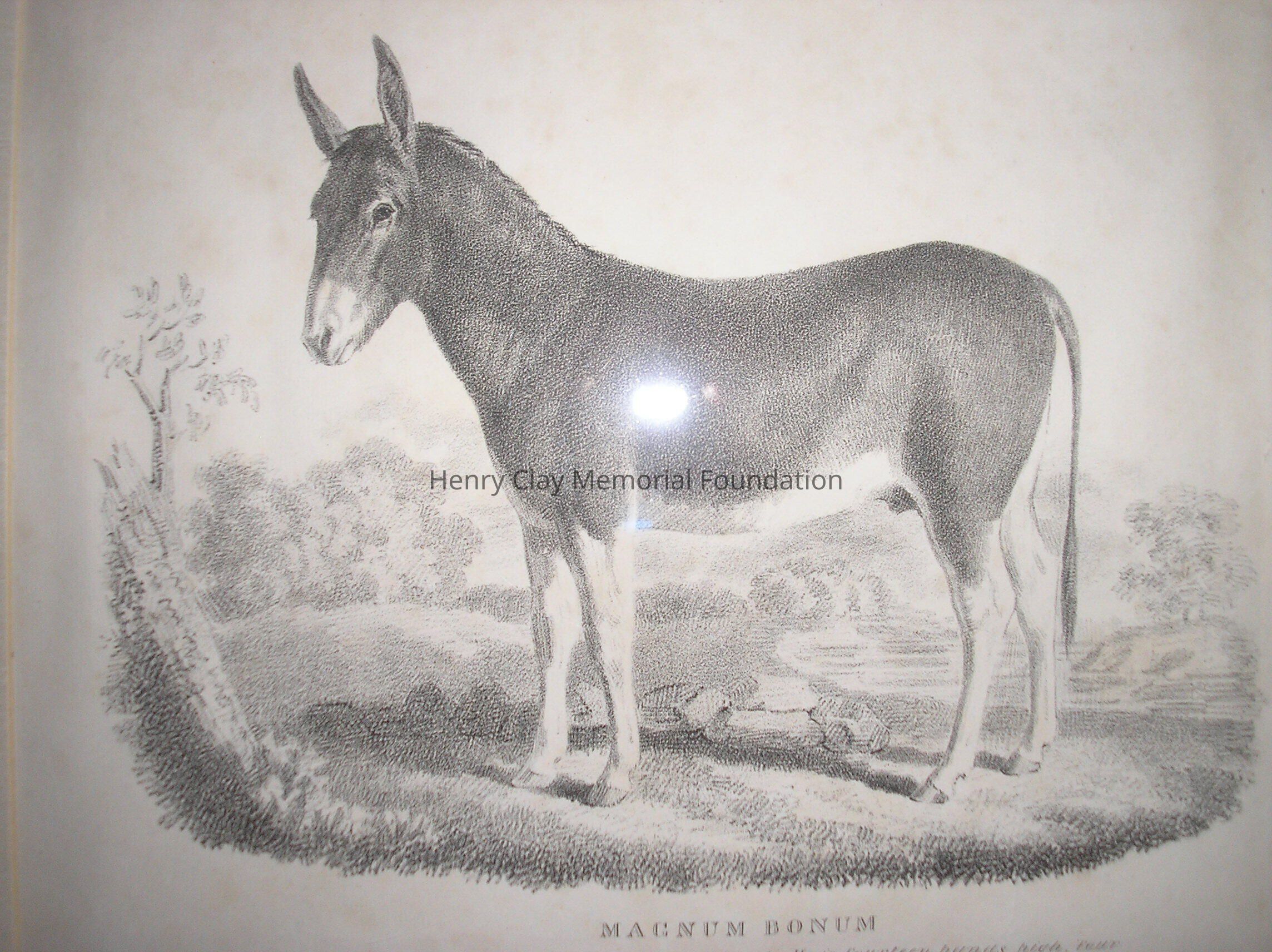Engraving of the jack Mangnum Bonum. At the bottom is the title, "Magnum Bonum" and the inscription, "A grey Jack-Ass owned by H. Clay of Ashland. He is fourteen hands high, four years old in 1838. His sire is the Maltese Jack Achilles, imported by H. Clay, and his dame is a descendant of the Asses of George Washington."Dimensions