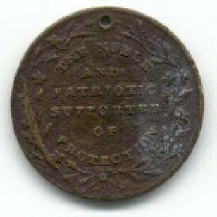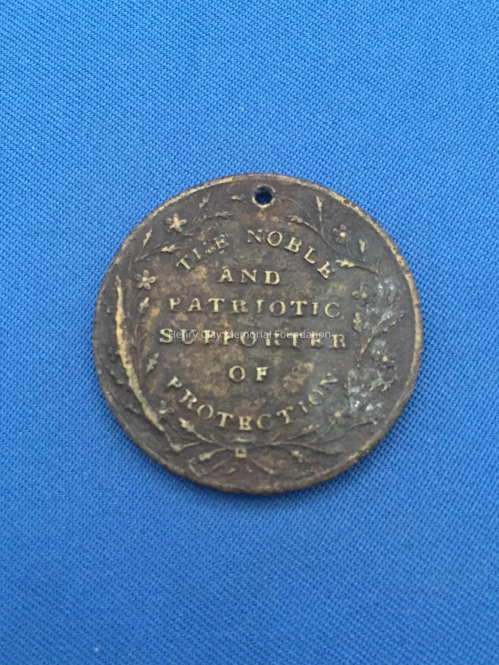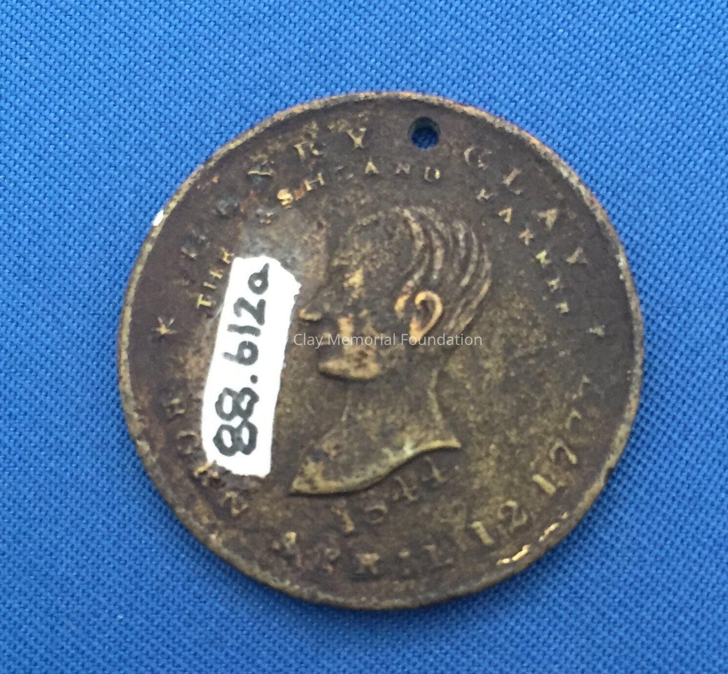 Small round medalet, the size of a coin. On front is left profile bust of Clay with "Henry Clay / The Ashland Farmer" above head, flanked by stars, "1844" below neck and "Born April 12 1777" at bottom. On reverse, "The noble / and / patriotic / supporter / of / protection" enclosed in a wreath. A small hole is drilled through it at the top.