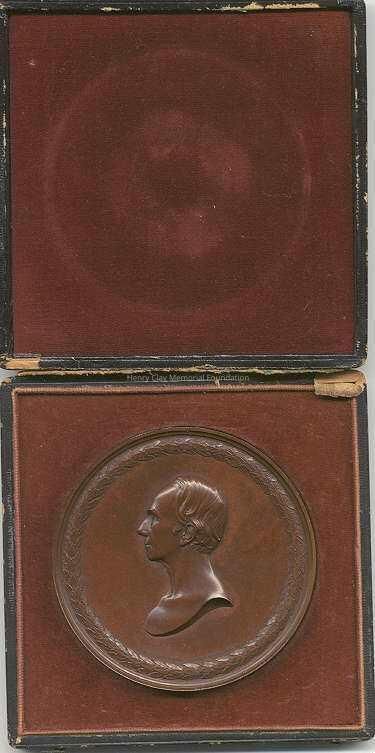 Bronze medal has left profile bust of Henry Clay on front. Around inside perimeter on front is a wreath of leaves. Just inside wreath at bottom in fine print: "T.D. JONES. DEL. -- C.C. WRIGHT. FECIT." [You must examine the T.D. Jones closely -- a slight imperfection makes it look like D.D. Jones.] Back side of medal has a list of Clay's political achievements inside a wreath of wheat, corn, cotton, tobacco, rice and hemp, the six chief American staples, "SENATE / 1806 / SPEAKER 1811. / WAR OF 1812 WITH G. BRITAIN / GHENT 1814. / SPANISH AMERICA 1818-1822. / MISSOURI COMPROMISE 1821. / AMERICAN SYSTEM 1824. / GREECE 1824 / SECRETARY OF STATE 1825. / PANAMA INSTRUCTIONS 1826 / TARIFF COMPROMISE / 1833. / PUBLIC DOMAIN 1833-1841. / PEACE WITH FRANCE / PRESERVED 1835. / COMPROMISE 1850." At bottom in fine print just around inside perimeter, "WM. WALCUTT. DEL. -- C.C. WRIGHT. FECIT." Medal is presented in its original case, a square, black case lined with maroon velvet. Case top is separated from bottom. One of the two original clasps is still on case.
