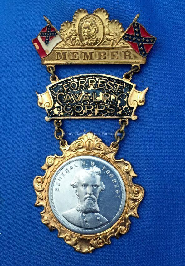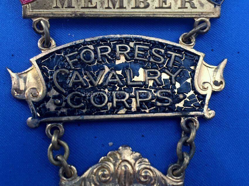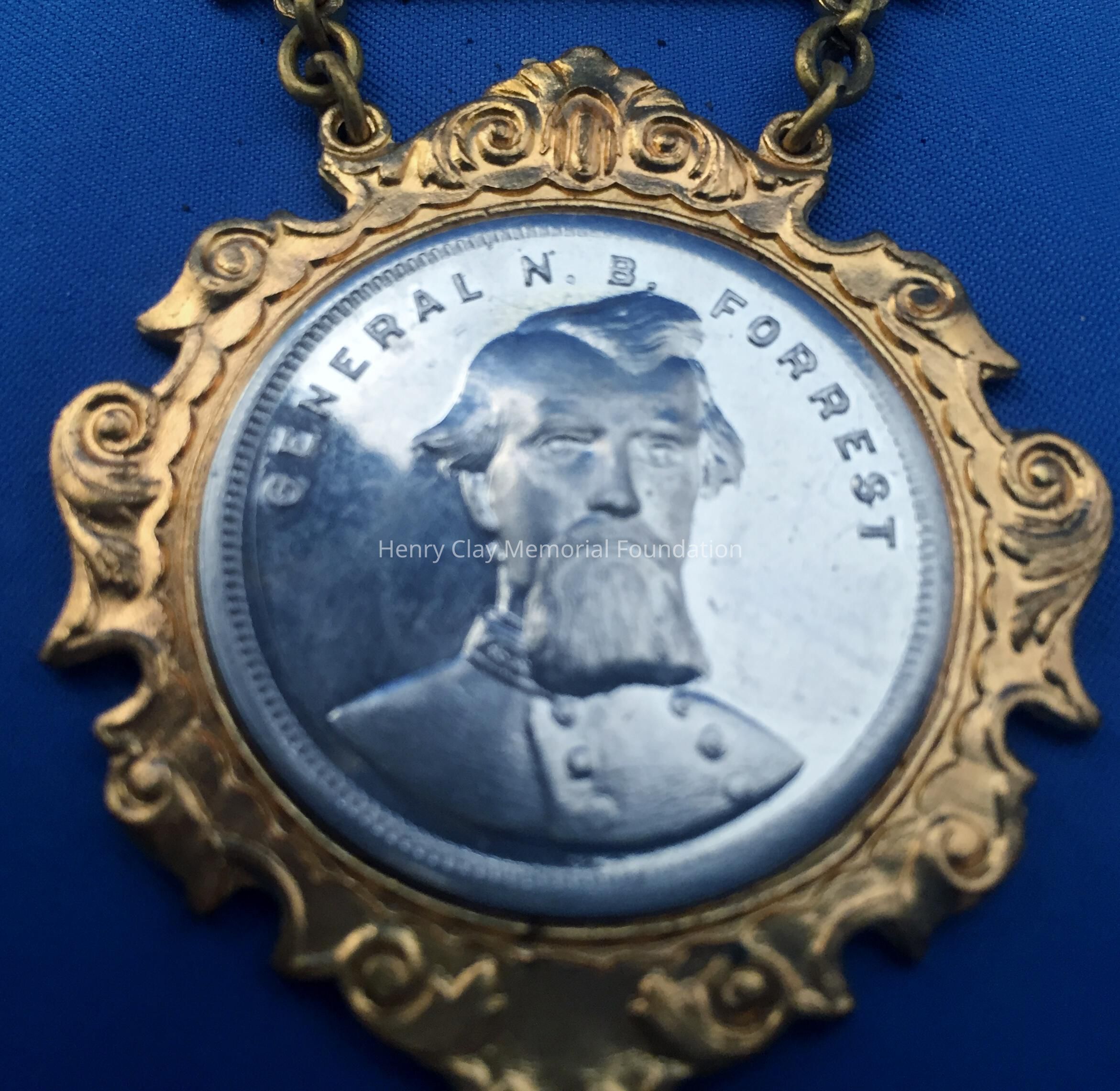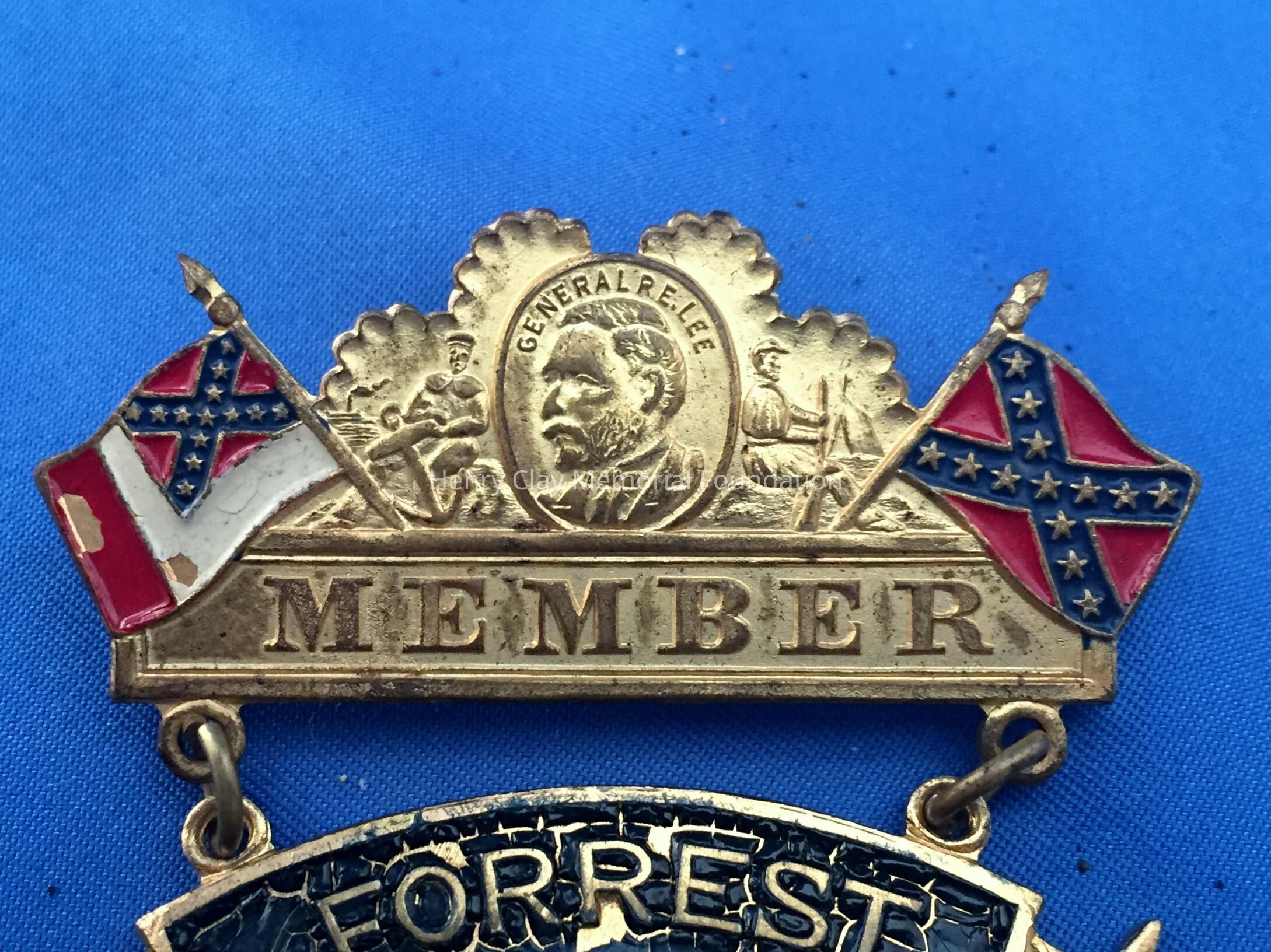 A three-part metal connected by chain links. The top part is gold-color metal with enamelled confederate flags, the national flag, and battle flag flanking an image of "GENERAL R. E. LEE" above the word, "MEMBER." The reverse of this section has a simple pin-clasp. The middle part is gold-colored metal in the shape of a banner with a black enamelled background and the raised letters, "FORREST / CAVALRY / CORPS." The bottom section is gold-colored metal, diamond-shaped with scroll design around perimeter and a silver double-sided coin or medalet in the center. On the front is a raised image identifying, "GENERAL N. B. FORREST." On the reverse is a raised image of a confederate flag. On the reverse of the middle and bottom part, the manufacturer is identified, "Schwaab S & S / Co. / Milwaukee."Dimensions