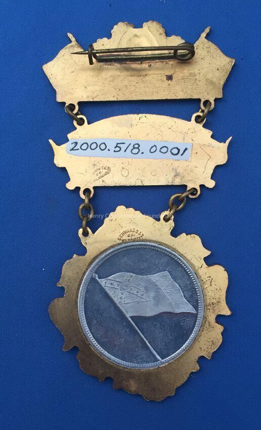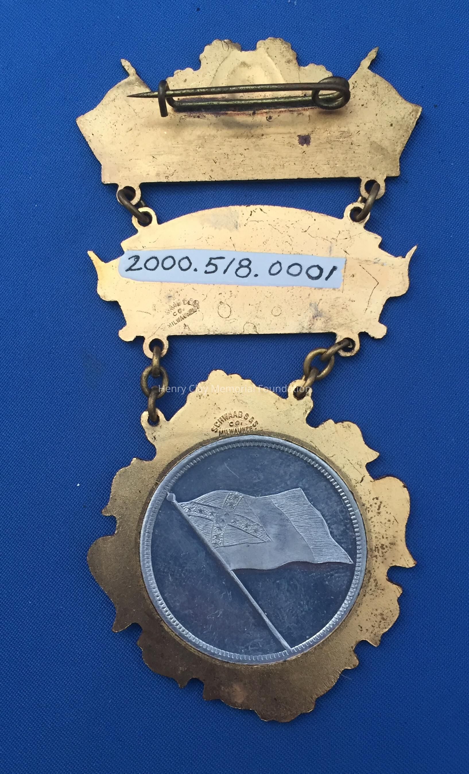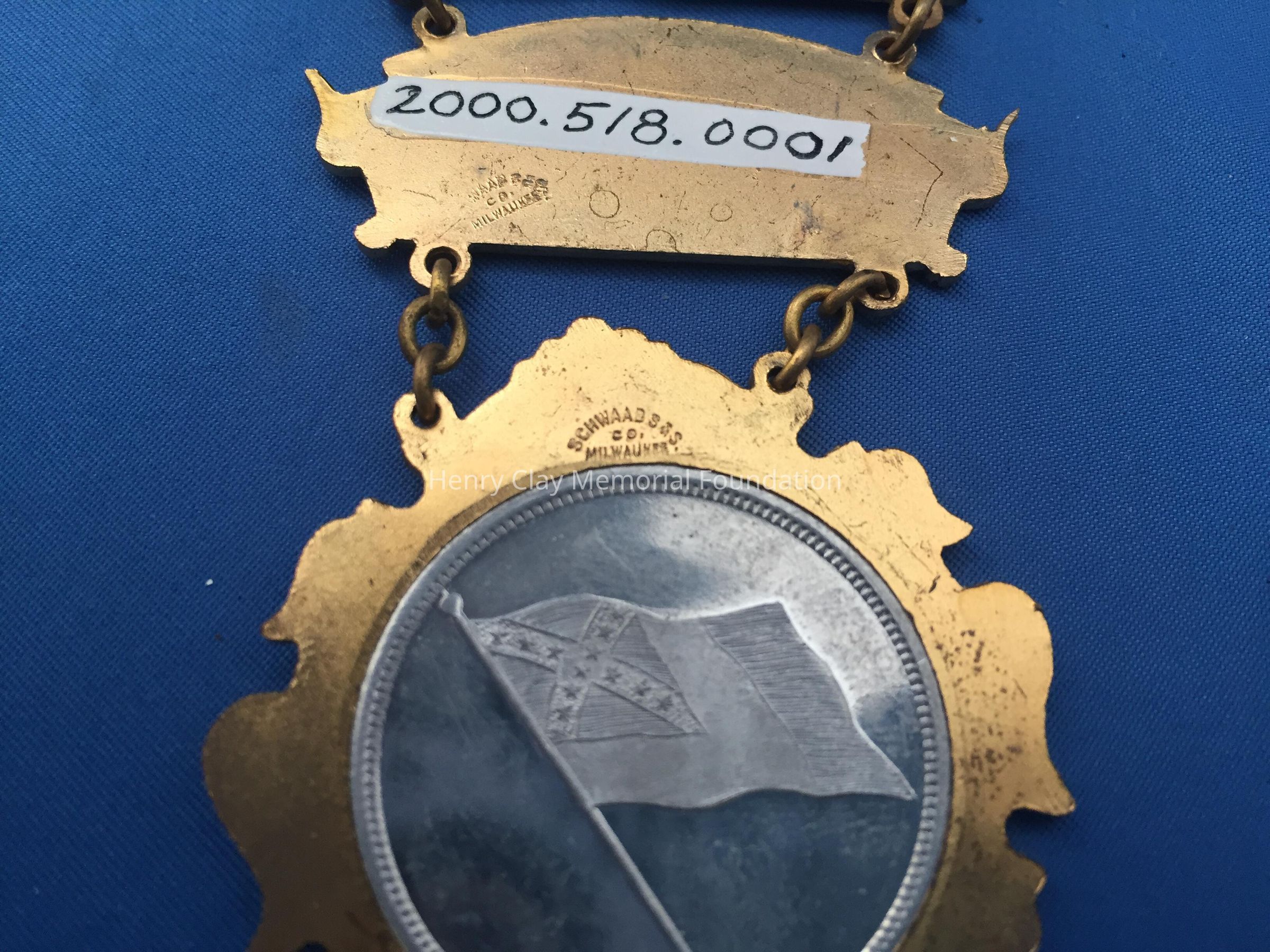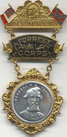 A three-part metal connected by chain links. The top part is gold-color metal with enamelled confederate flags, the national flag, and battle flag flanking an image of "GENERAL R. E. LEE" above the word, "MEMBER." The reverse of this section has a simple pin-clasp. The middle part is gold-colored metal in the shape of a banner with a black enamelled background and the raised letters, "FORREST / CAVALRY / CORPS." The bottom section is gold-colored metal, diamond-shaped with scroll design around perimeter and a silver double-sided coin or medalet in the center. On the front is a raised image identifying, "GENERAL N. B. FORREST." On the reverse is a raised image of a confederate flag. On the reverse of the middle and bottom part, the manufacturer is identified, "Schwaab S & S / Co. / Milwaukee."Dimensions