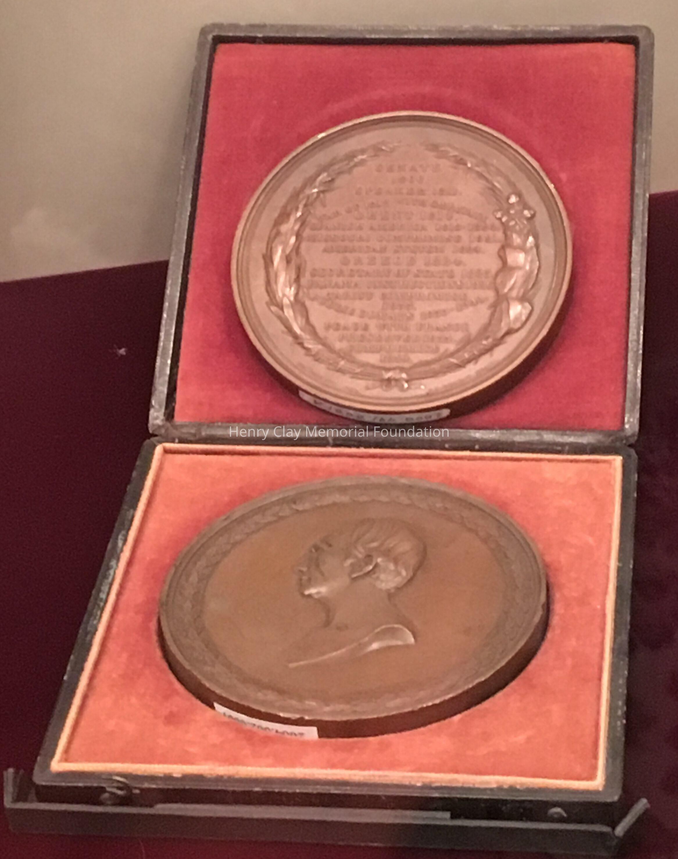 A Henry Clay bronze medal in a case inlaid with pink velvet. The obverse of the medal displays the accomplishments of Henry Clay inside a wreath of plant leaves. On the reverse is the bust of Henry Clay.Material
