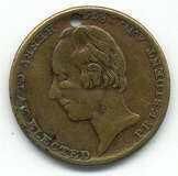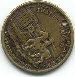 A brass campaign medalet. One side shows bust of Henry Clay and legend "Henry Clay Elected Preseident A.D. 1844." Reverse shows boy on horse or mule back in front of a mill and says "The Mill Boy of the Slashes inaugurated March 4th 1845." There is hole at top for a ribbon.