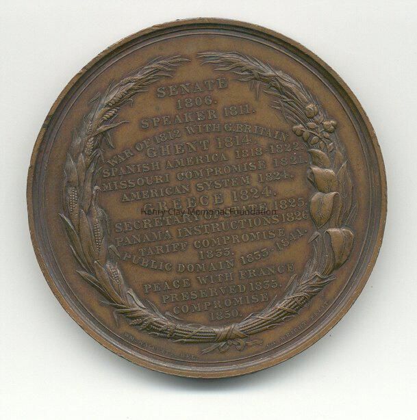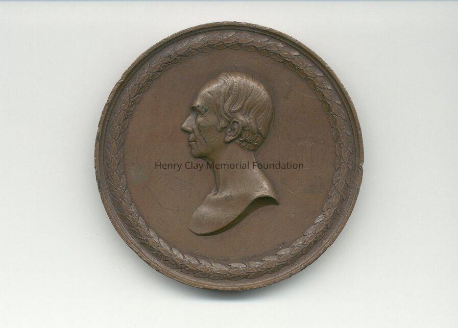 Medal bearing bust of Henry Clay on one side and list of his accomplishments on the other. The bust side shows a bust of Henry Clay facing left with a ring of laurel leaves around perimeter. Medal is stamped beneath bust and above laurel: "D.D. Jones Del. C.C. Wright Fecit." Other side of the medal has a list of accomplishments surrounded by a wreath of corn shocks bound at the bottom with a ribbon. This side of the medal is stamped: "WM. Walcott Del. C.C. Wright Fecit."