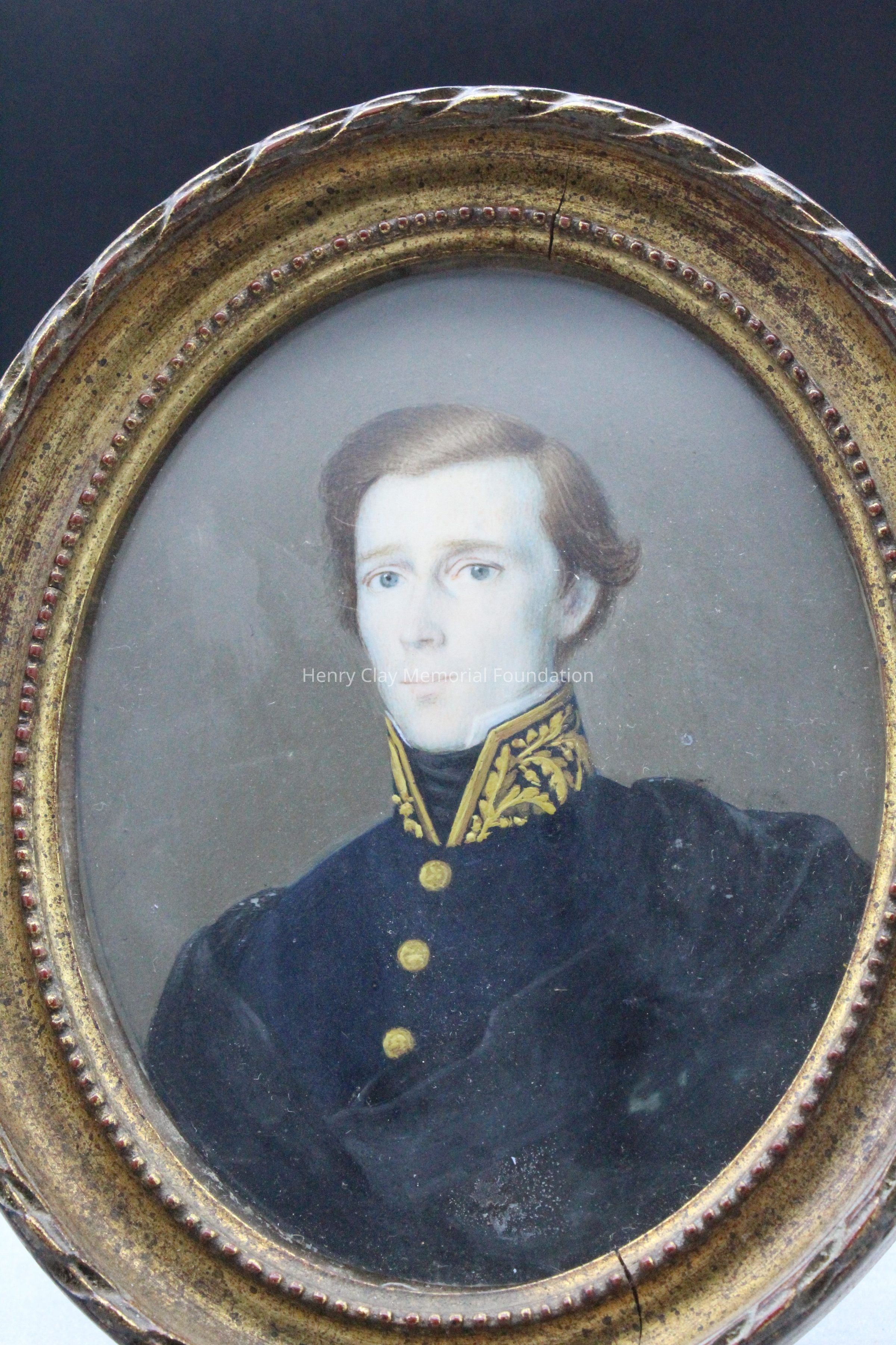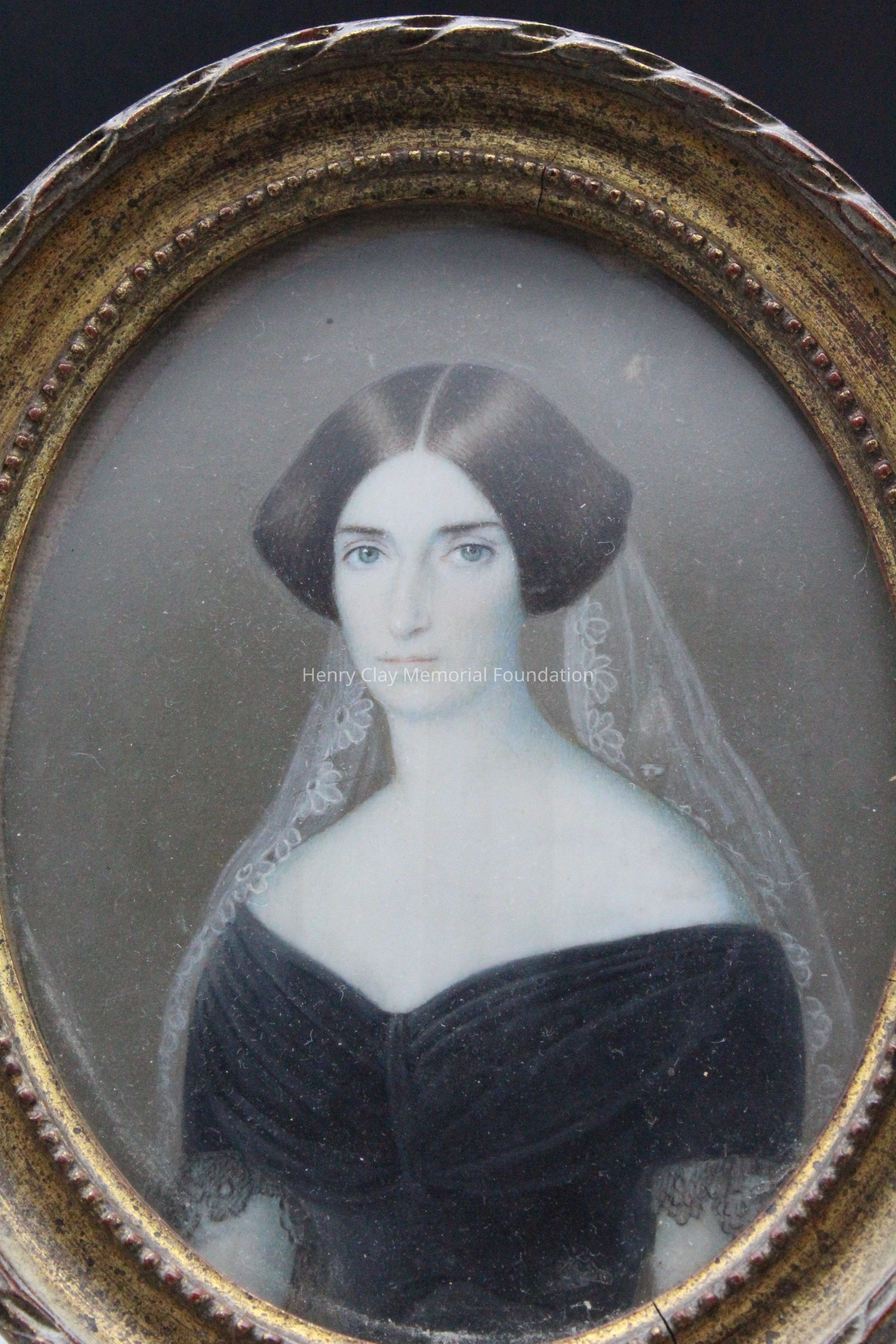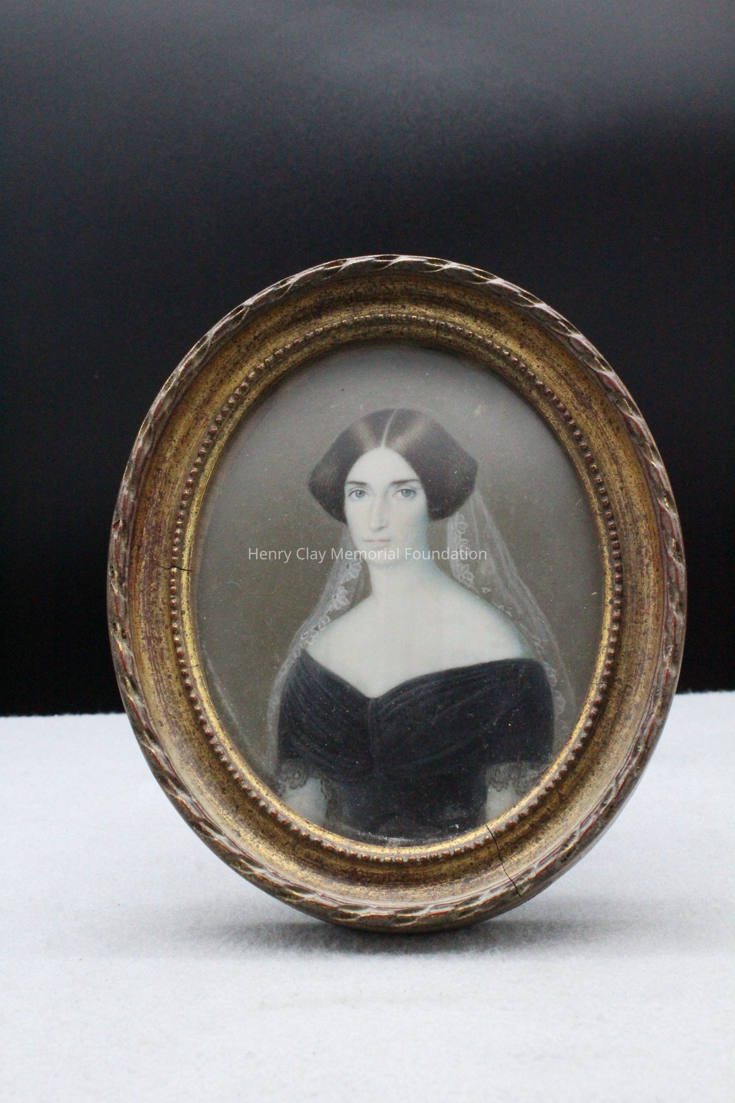 A pair of portrait miniatures. One is of a man in a black coat over a blue jacket with gold floral design on the standing collar and 3 gold or brass buttons down the front. The man is wearing a black cravat. He has blue eyes and reddish-brown hair parted to the right. The other is of a woman in a black dress that comes to a v over her bosom. The sleeves are short and end in lace. The woman's hair is dark brown, parted in the middle, and pulled up in the back where a lace veil is hung and drapes down around the woman's shoulders. The portraits are framed in gold frames with a beaded inner molding and a ribbon twisted outer molding. The backs of the frames have wire easels to stand them up.