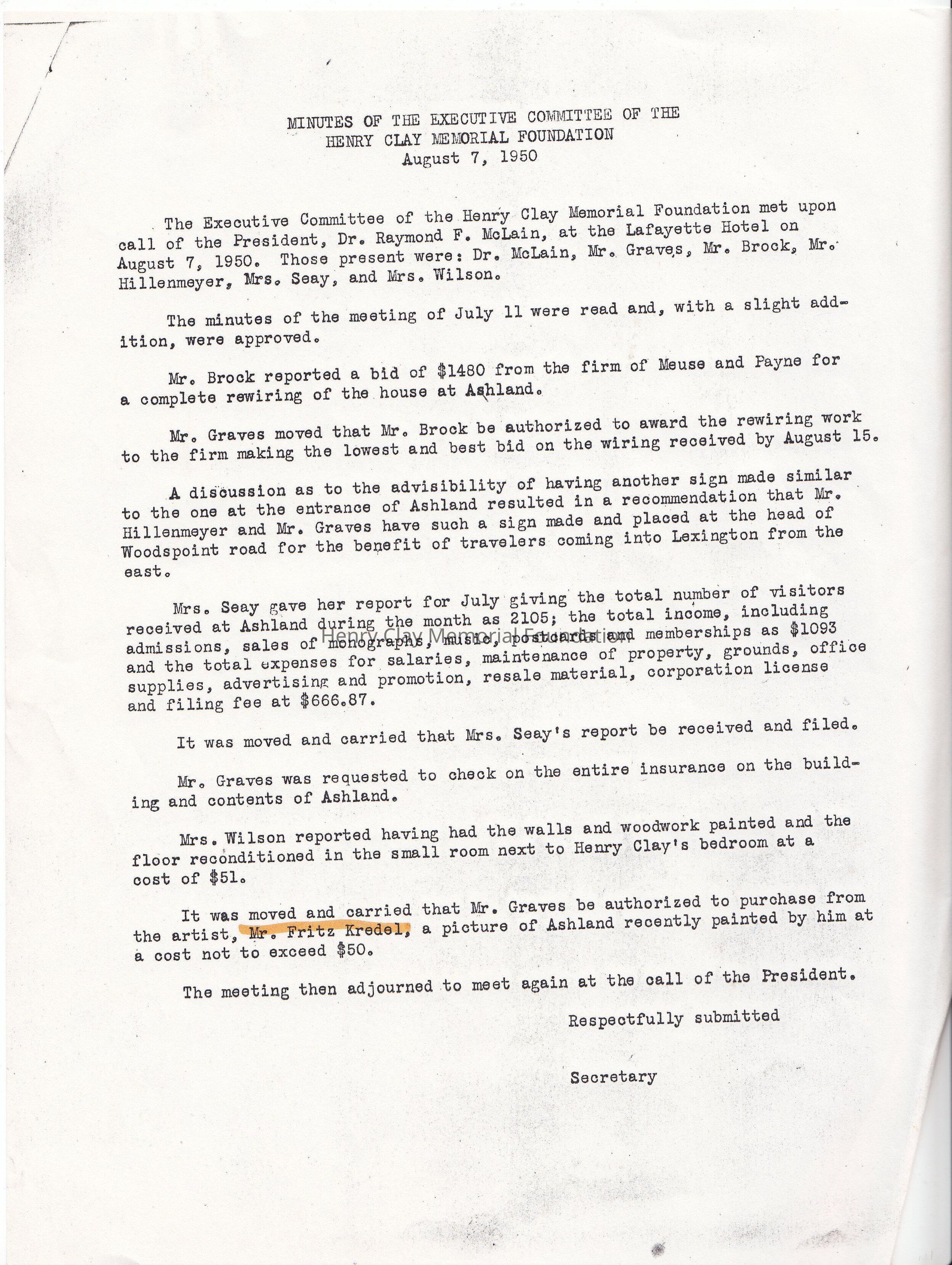 a: ter containing the Henry Clay Memorial Foudation minutes of August 7, 1950.