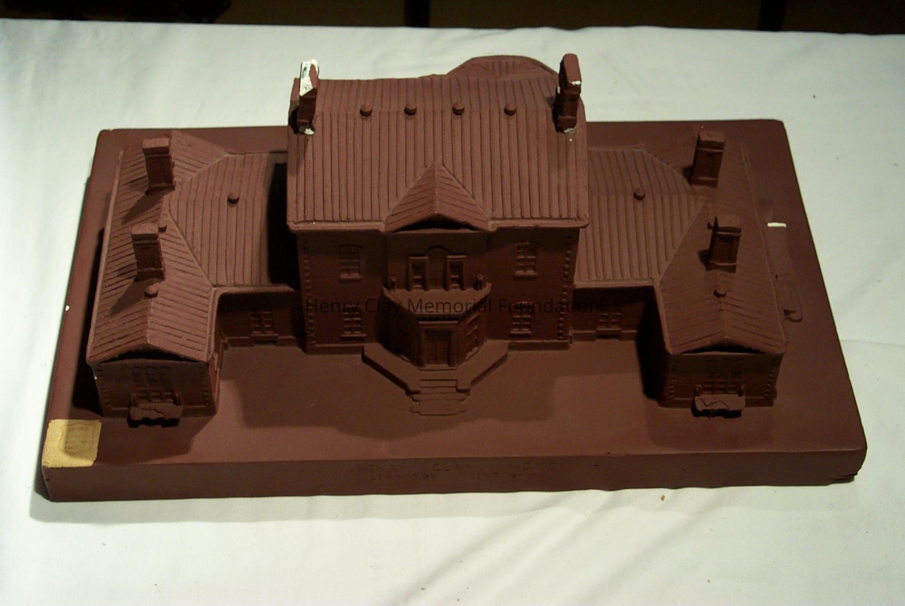 A plaster model, painted maroon, of the main house at Ashland. A stenciled shield on the left corner of the modell (left unpainted) reads "WPA" with other indecipherable text.