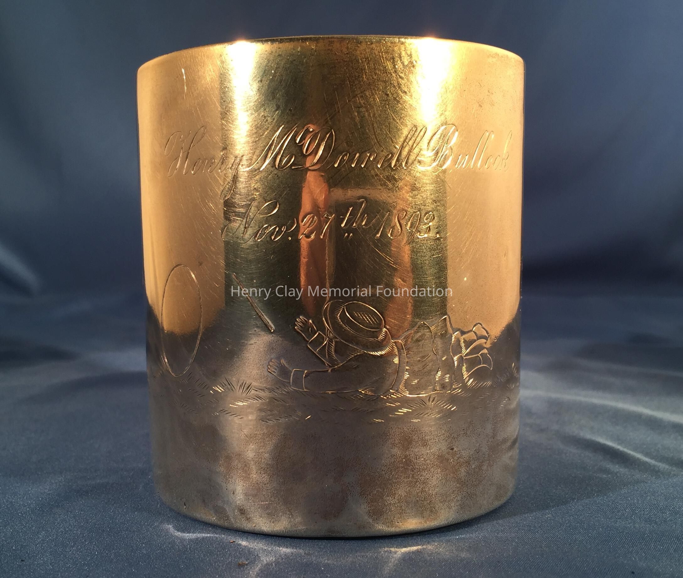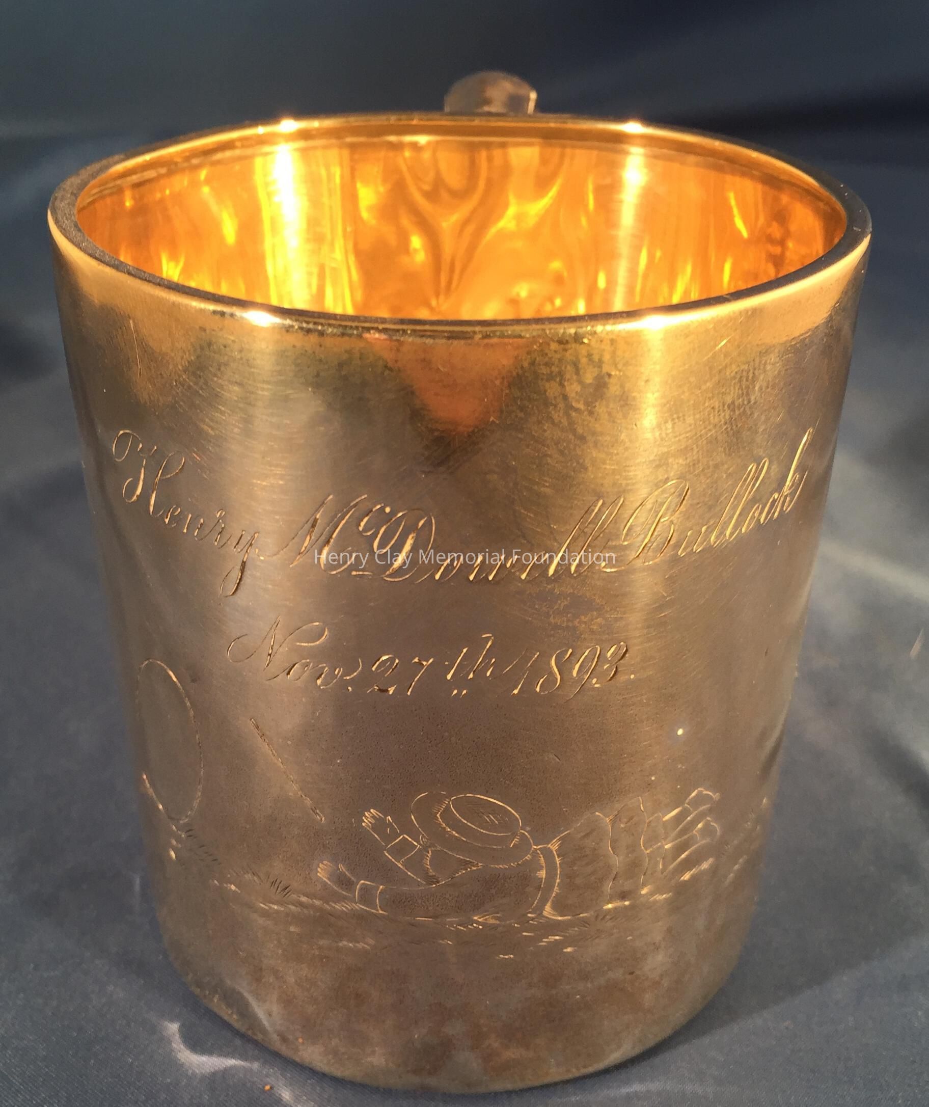 Child's mug; engraved "Henry McDowell Bullock / Nov 27th 1893." Depicts children playing harps. Stamped "Sterling / 333" on bottom.
