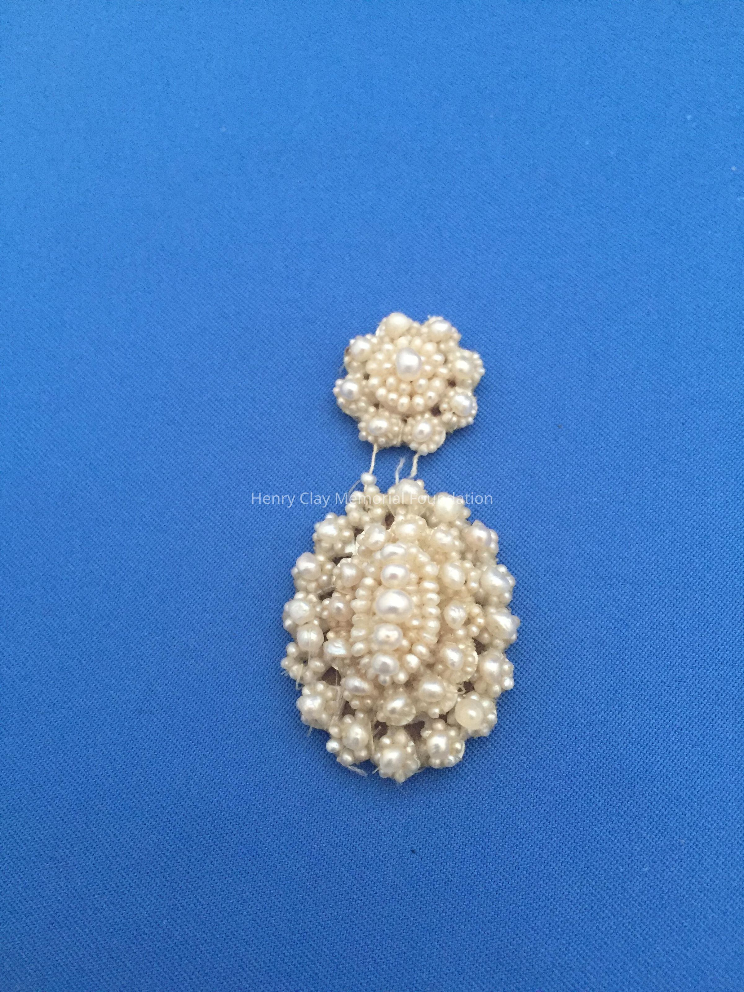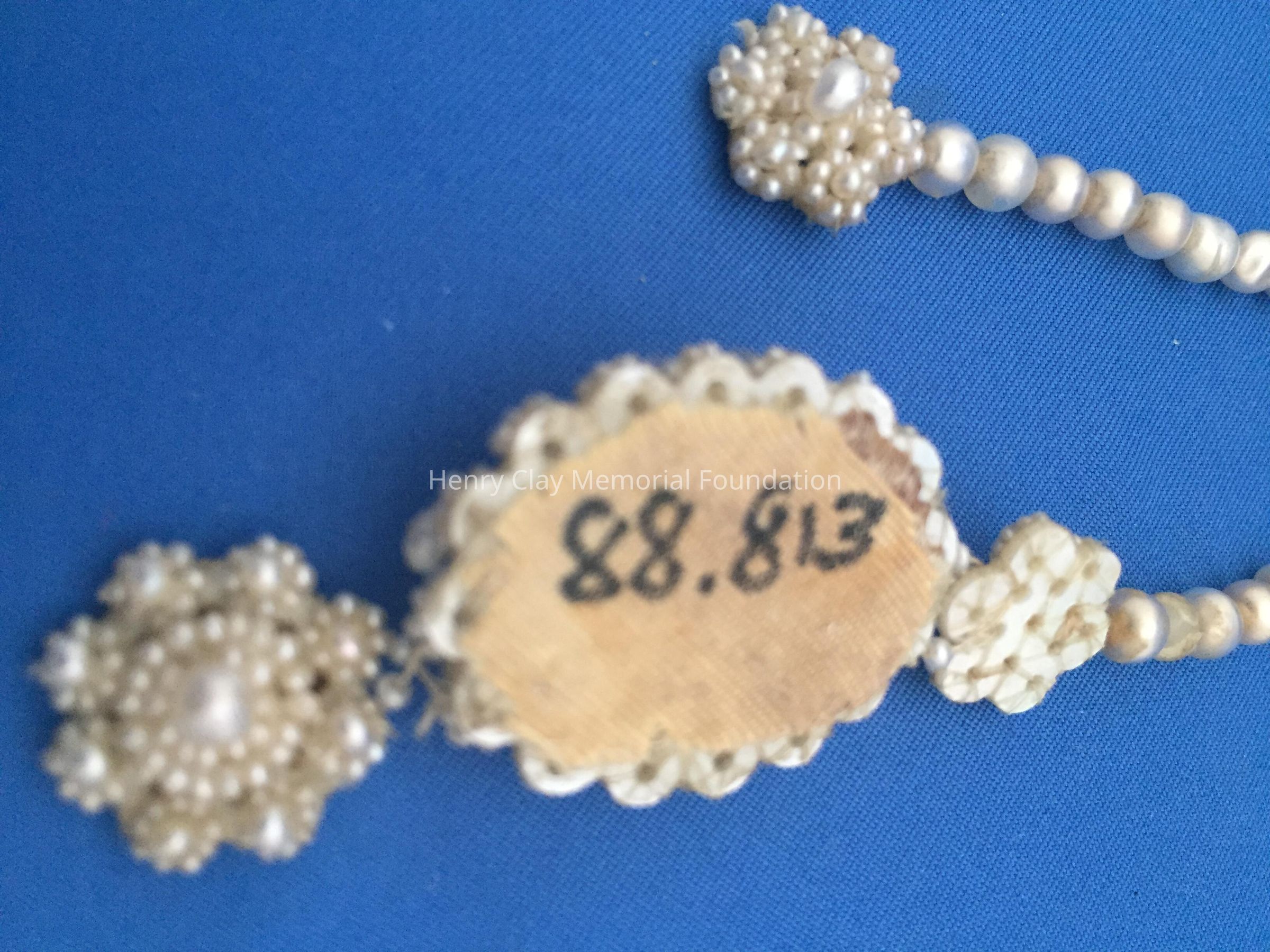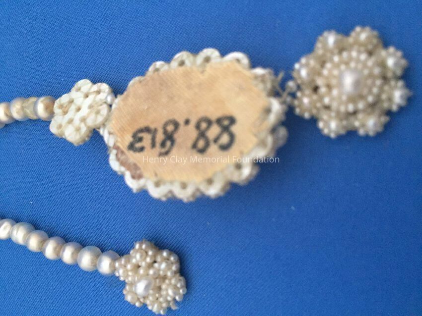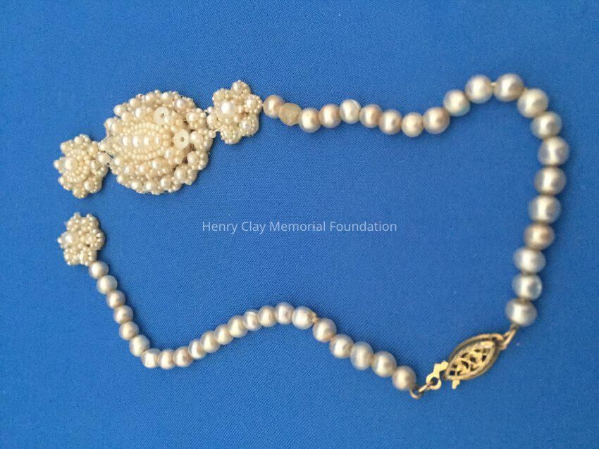 Approximately 13.25" long with 7 clusters of pearls on a string of pearls with a gold clasp.