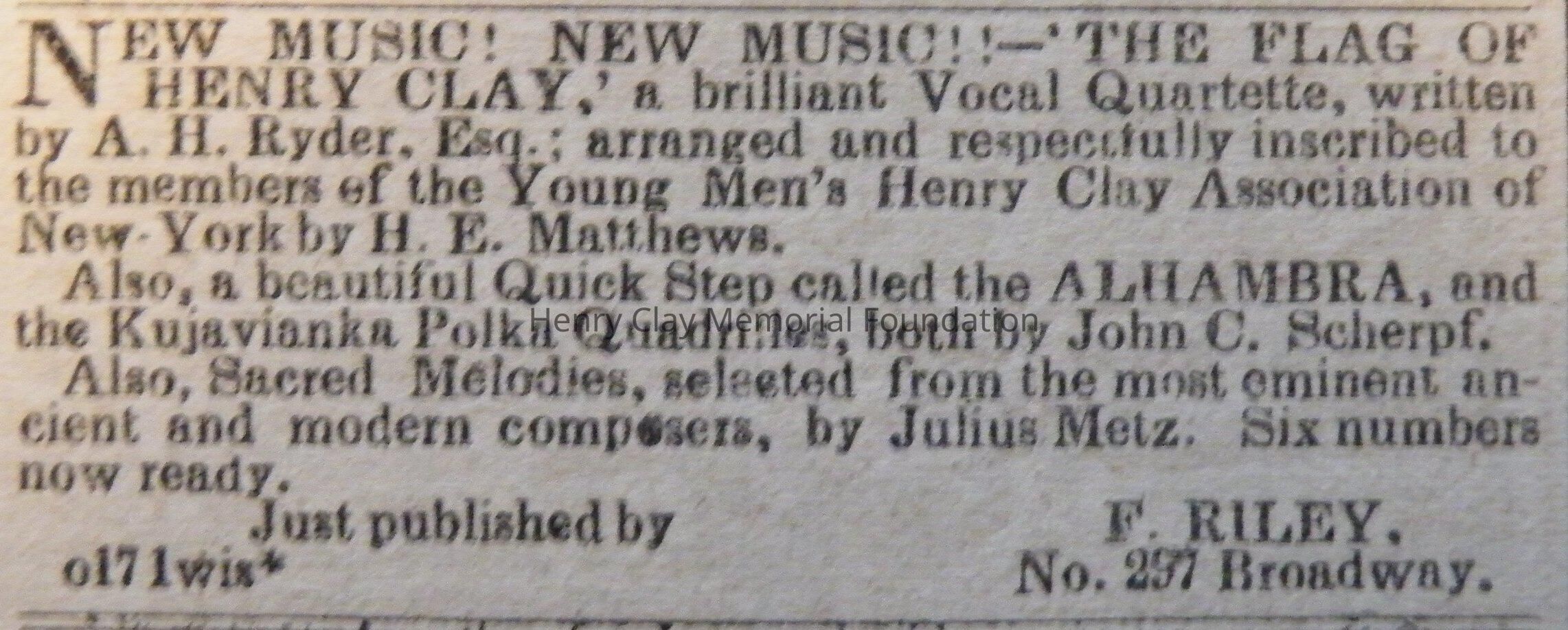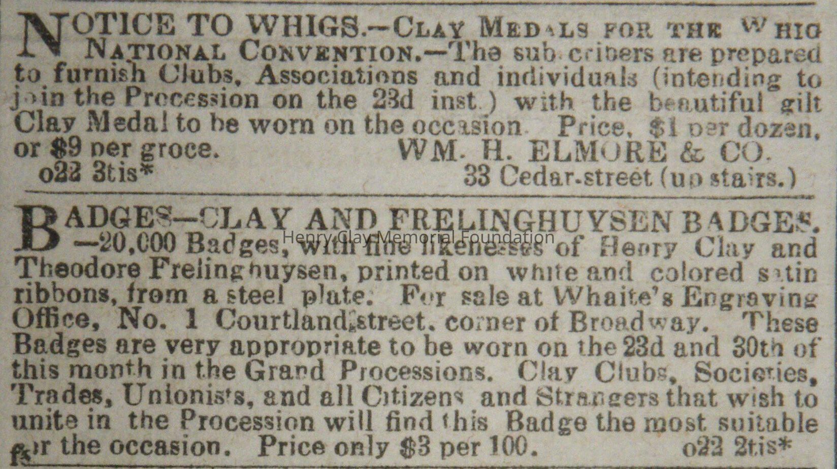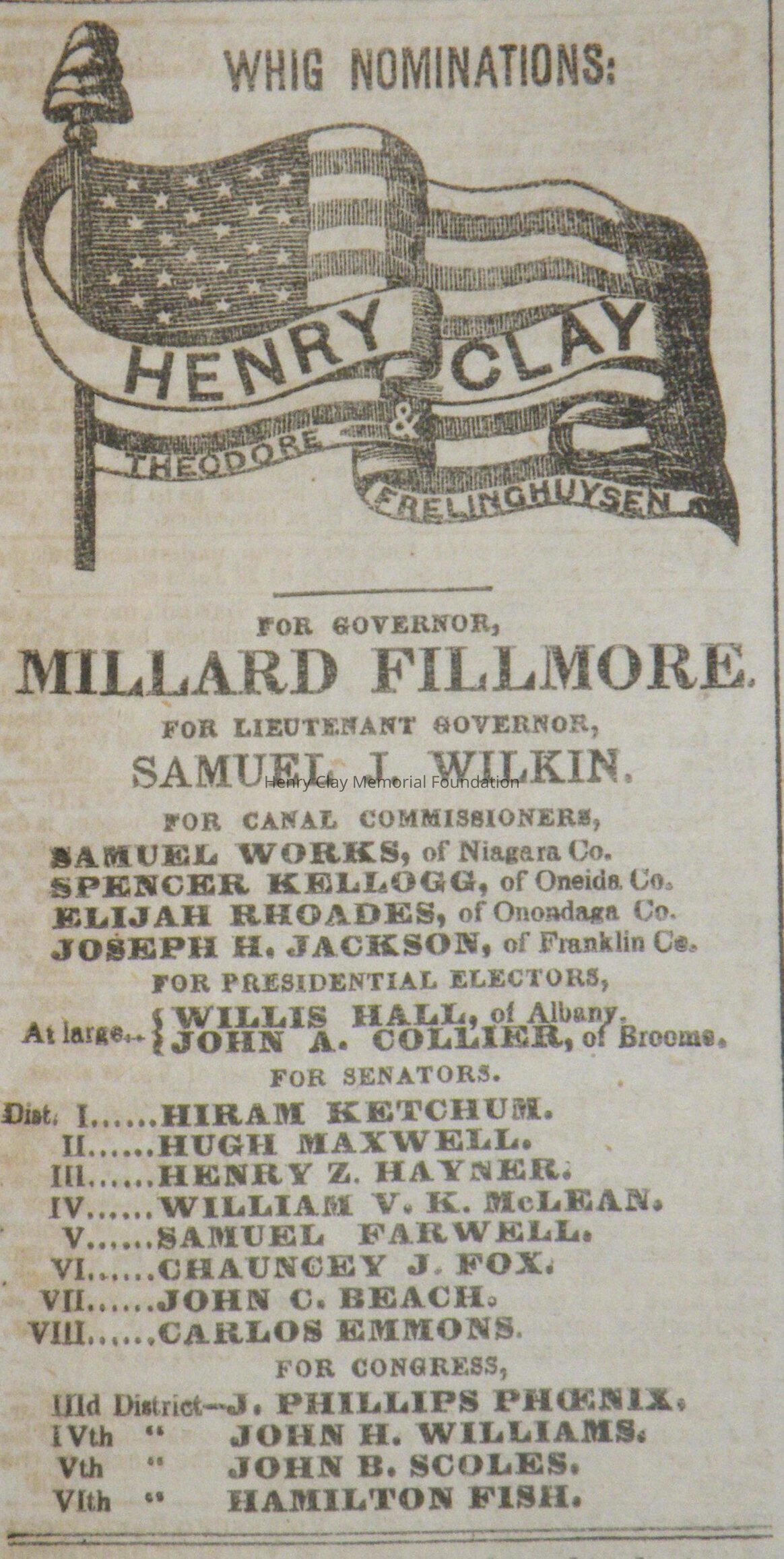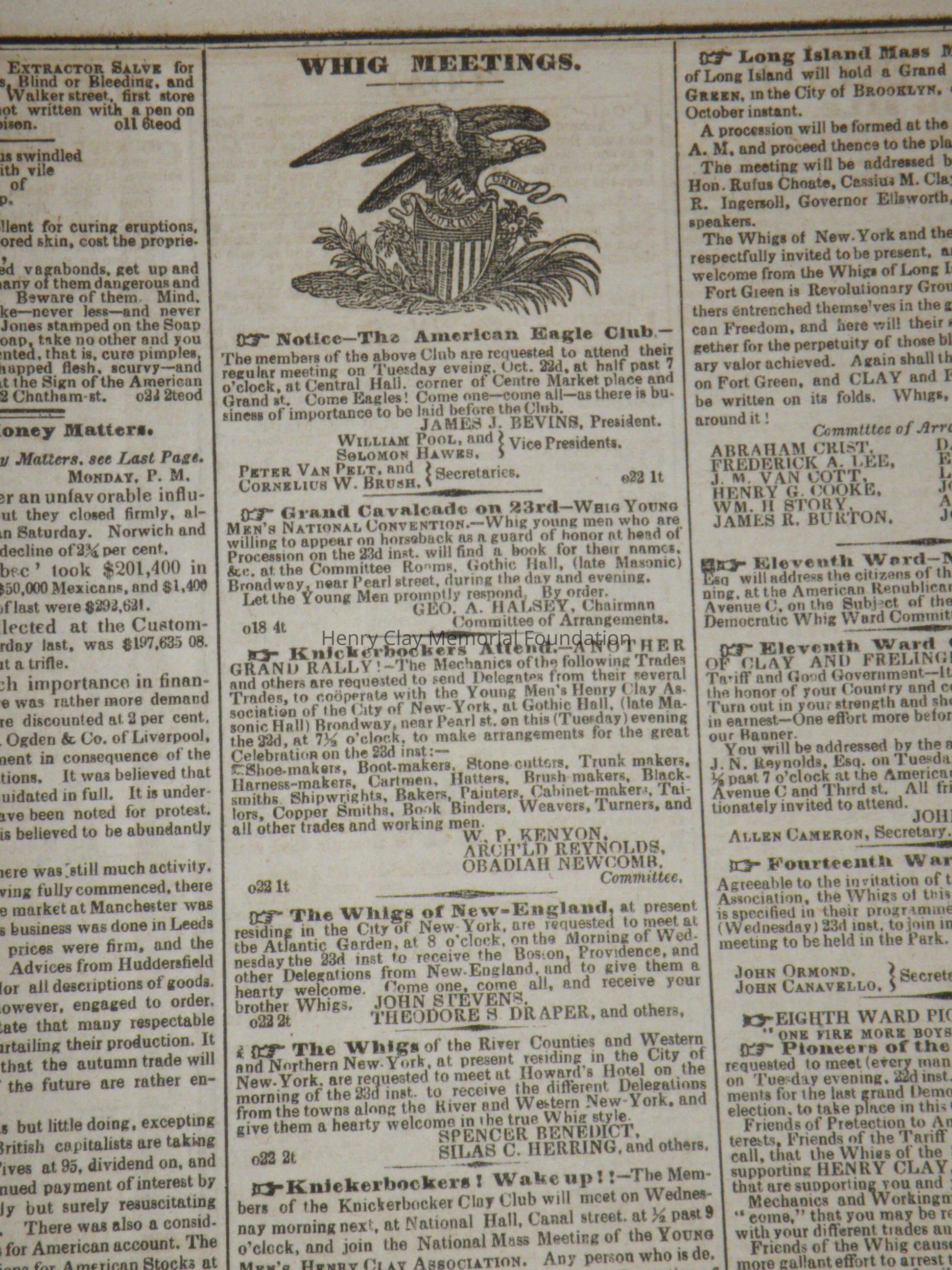 A newspaper containing the Whig Ballot for the state of New York (including Henry Clay for President, Theodore Freylinghuysen for Vice Preseident, Milliard Fillmore for Governor, Etc.), a version of the Old Coon cartoon, ads for two types of campaign memorabilia, and a number of other articles relating to Clay and New York Whig activities to get him elected president.