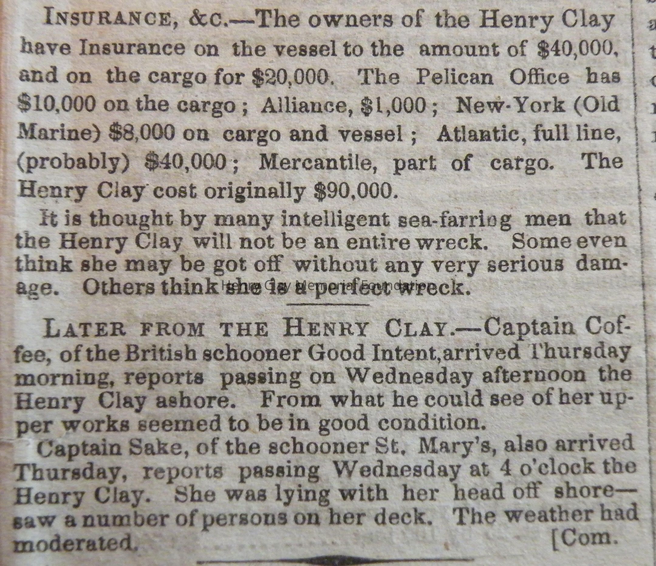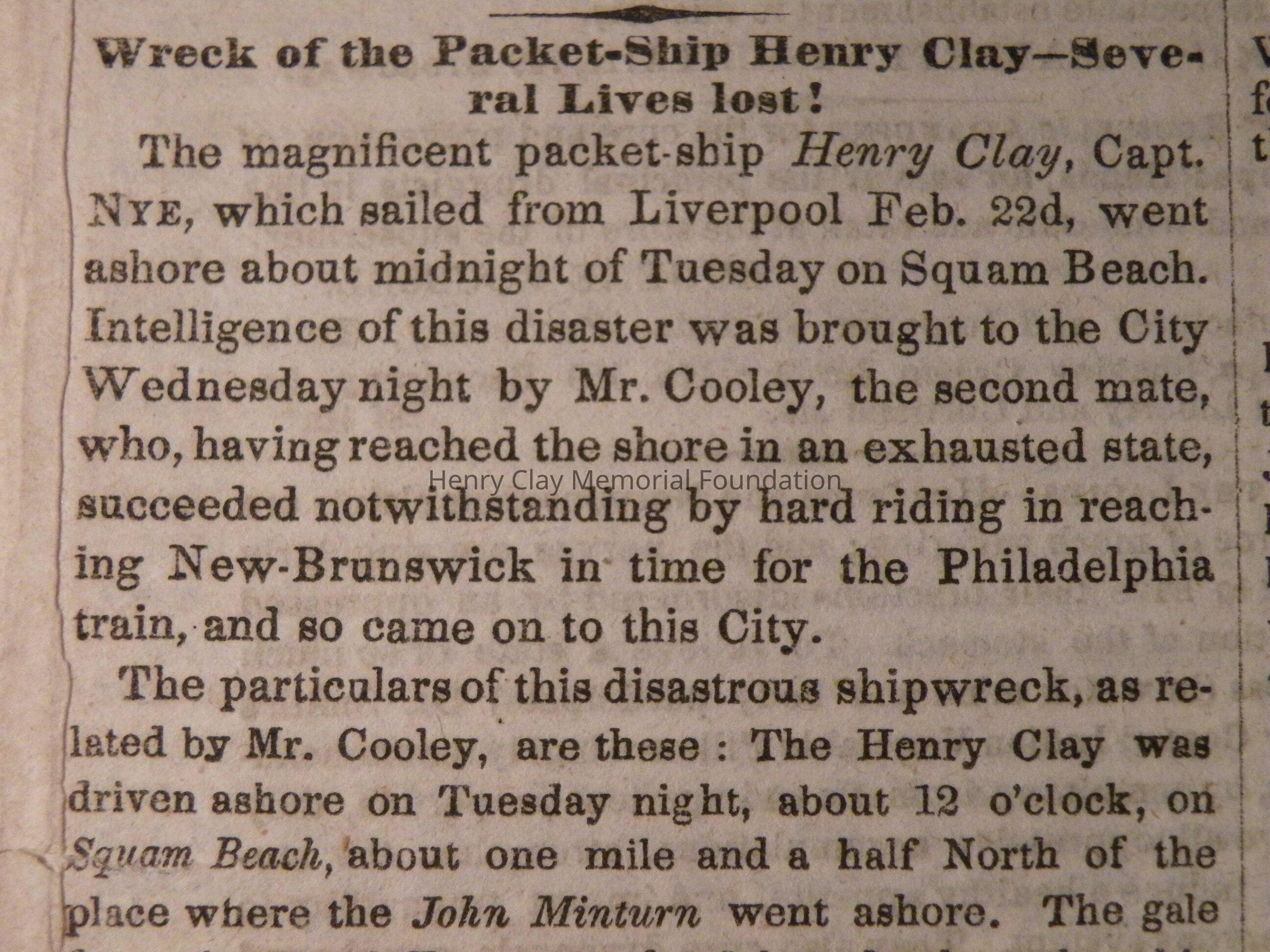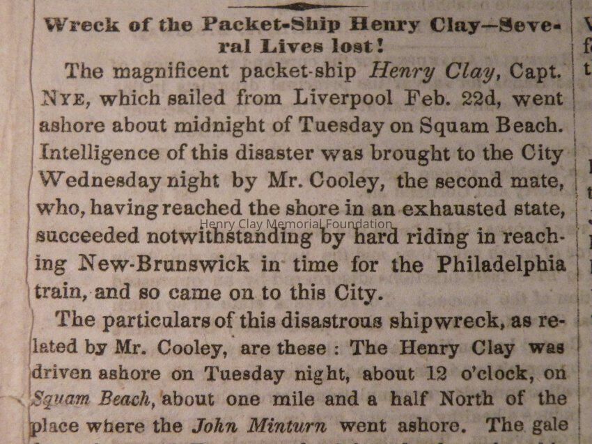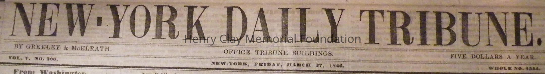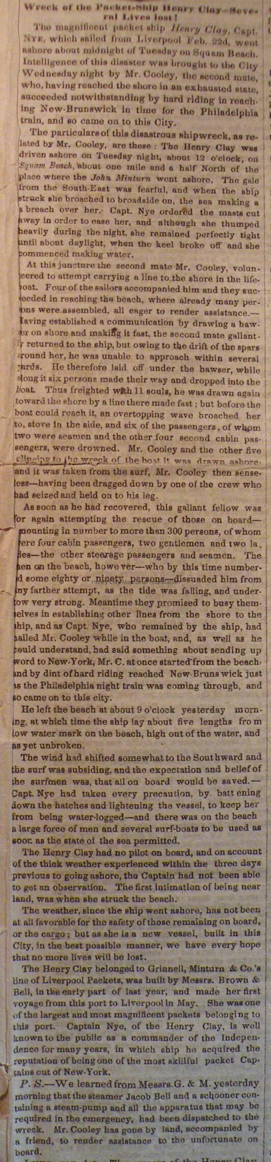 A copy of the New York Daily Tribune dated March 27, 1846 and containing an article about the wreck of the packet ship Henry Clay at Squam Beach, NJ.