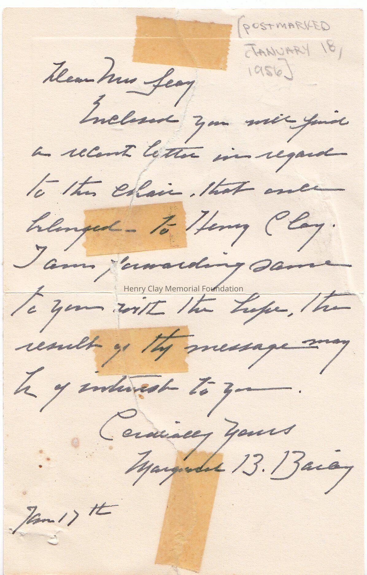 The note is hard to read, and it pertains to a letter that belonged to Henry Clay. A newer note on the top right corner state " Postamarked January 18, 1956"