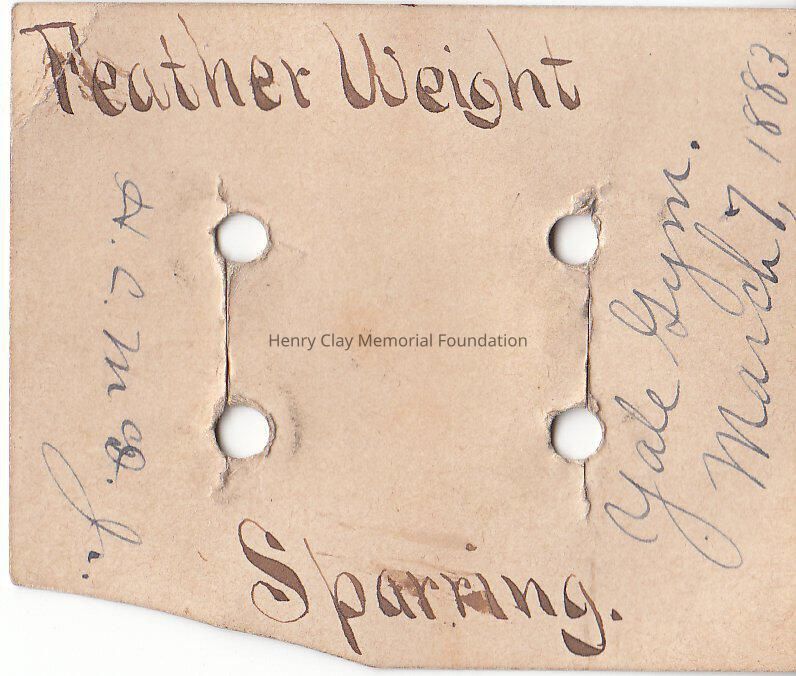 A small piece of paper with 4 holes. On the perimeter handwritten notes " Feather weight, Sparring in one handwriting, and " H.C.M.D Jr" , "Yale (....) March 7 1883" in another handwriting and pen.