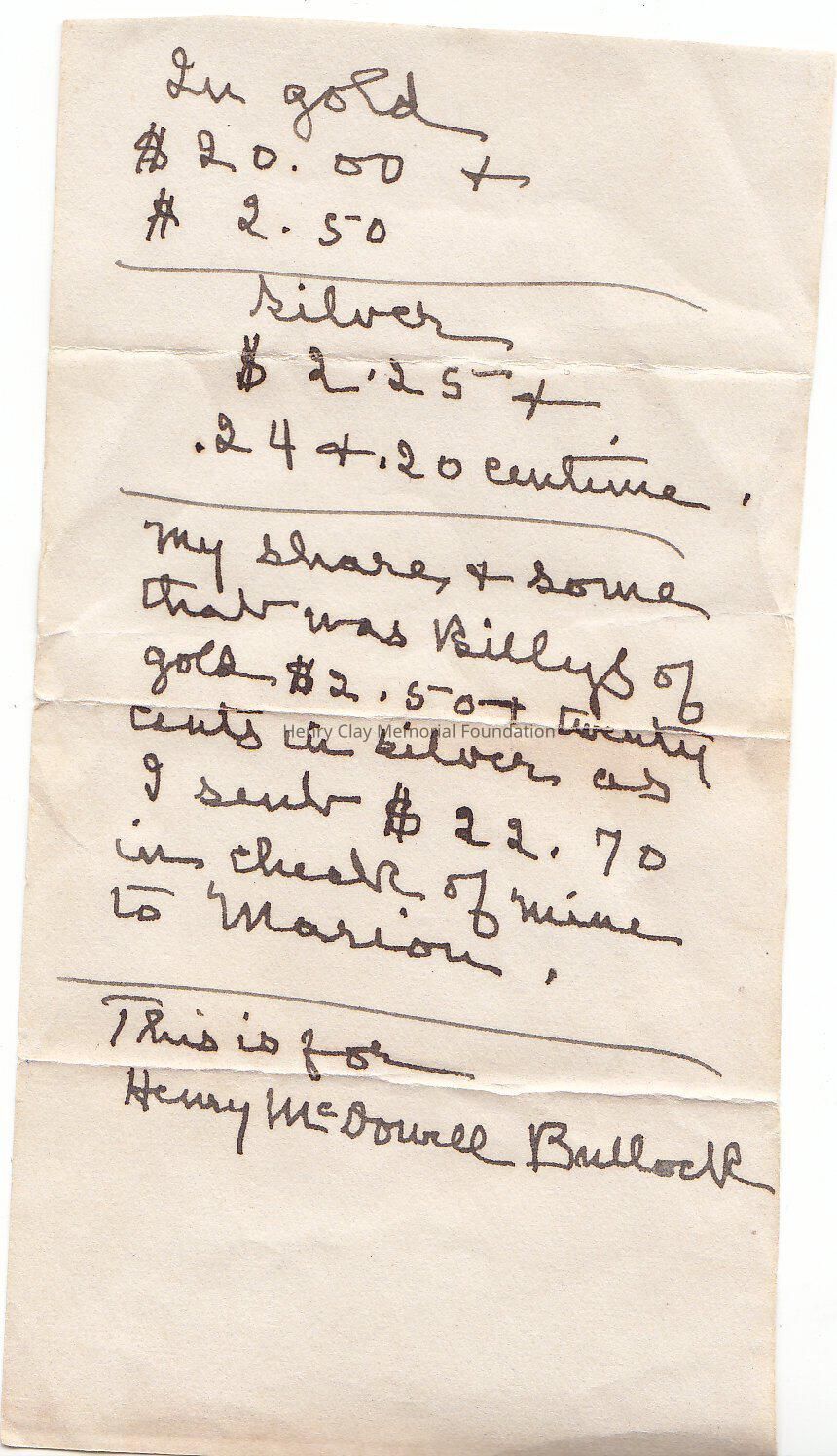 " Lu gold $20.00+ $2.50-------Silver $2.25+24+.20 centime-------my share + some that was Fillys(?) % gold $ 2.50 + twenty cents in silver as I sent $22.70 in check of mine to Marion. --------This is for Henry McDowell Bullock"