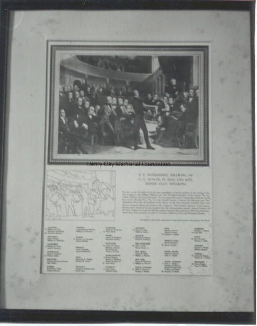 A crude reproduction print of Rothermel's painting of Clay speaking to the Senate. Below print are numbered silhouettes of the figures shown in the print, which are identified by name at the bottom. A paragraph to the right of the silhouettes reads in part, "The key on the left labels 25 of the more prominent of the 62 members of the Seante in the 31st Congress . . .." Below the paragraph is printed, "Presented by the Great American Group of Insurance Companies, New York." In a wooden black frame.