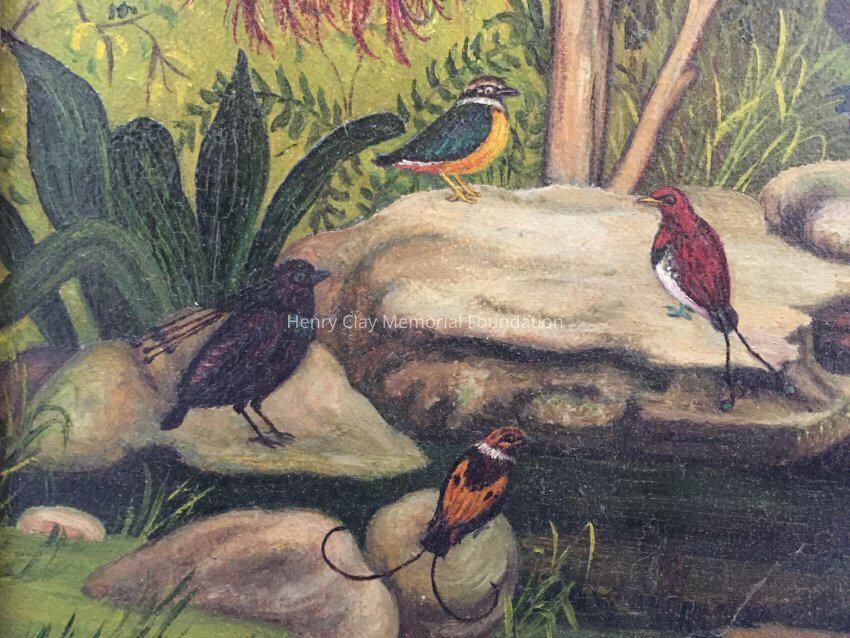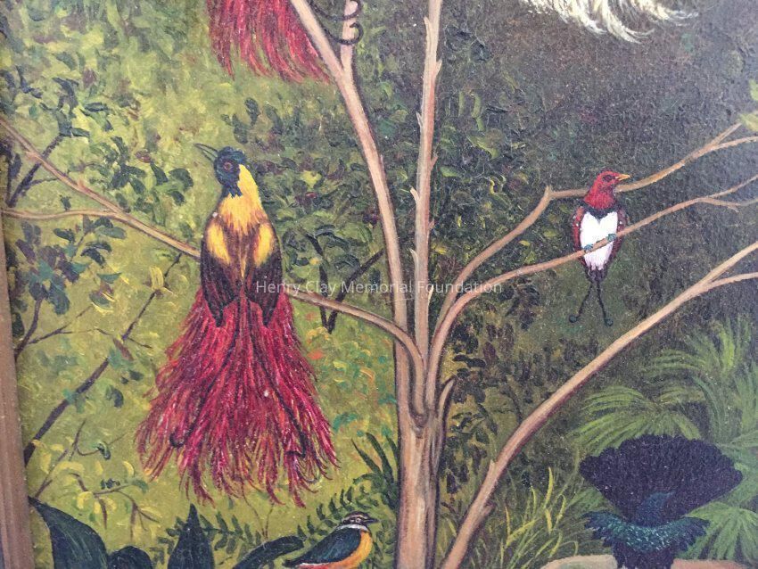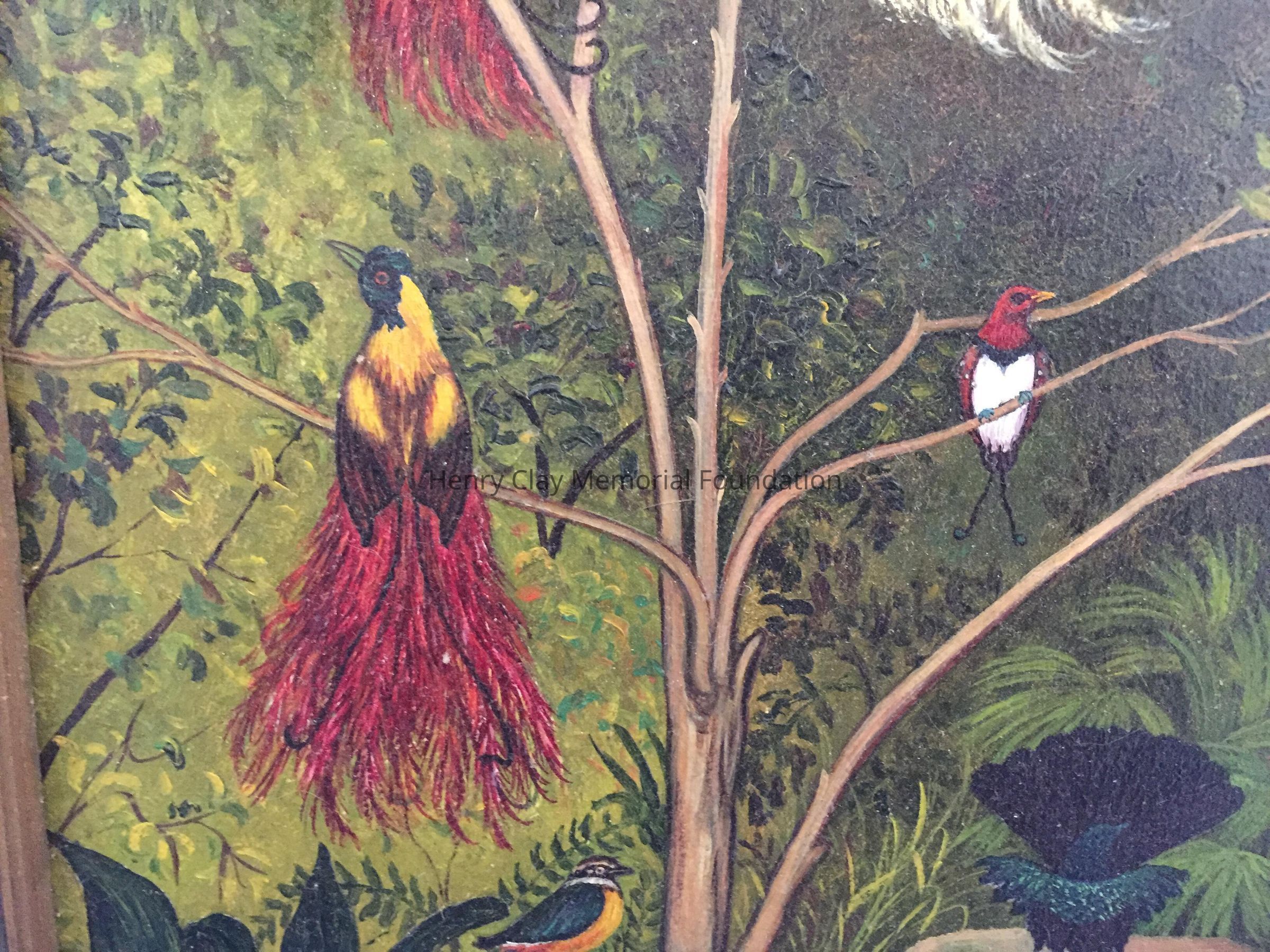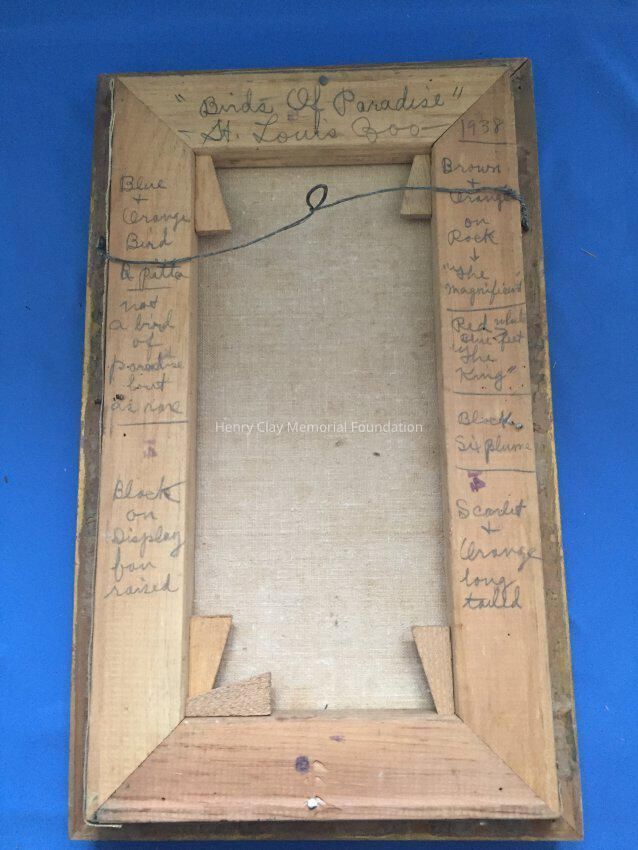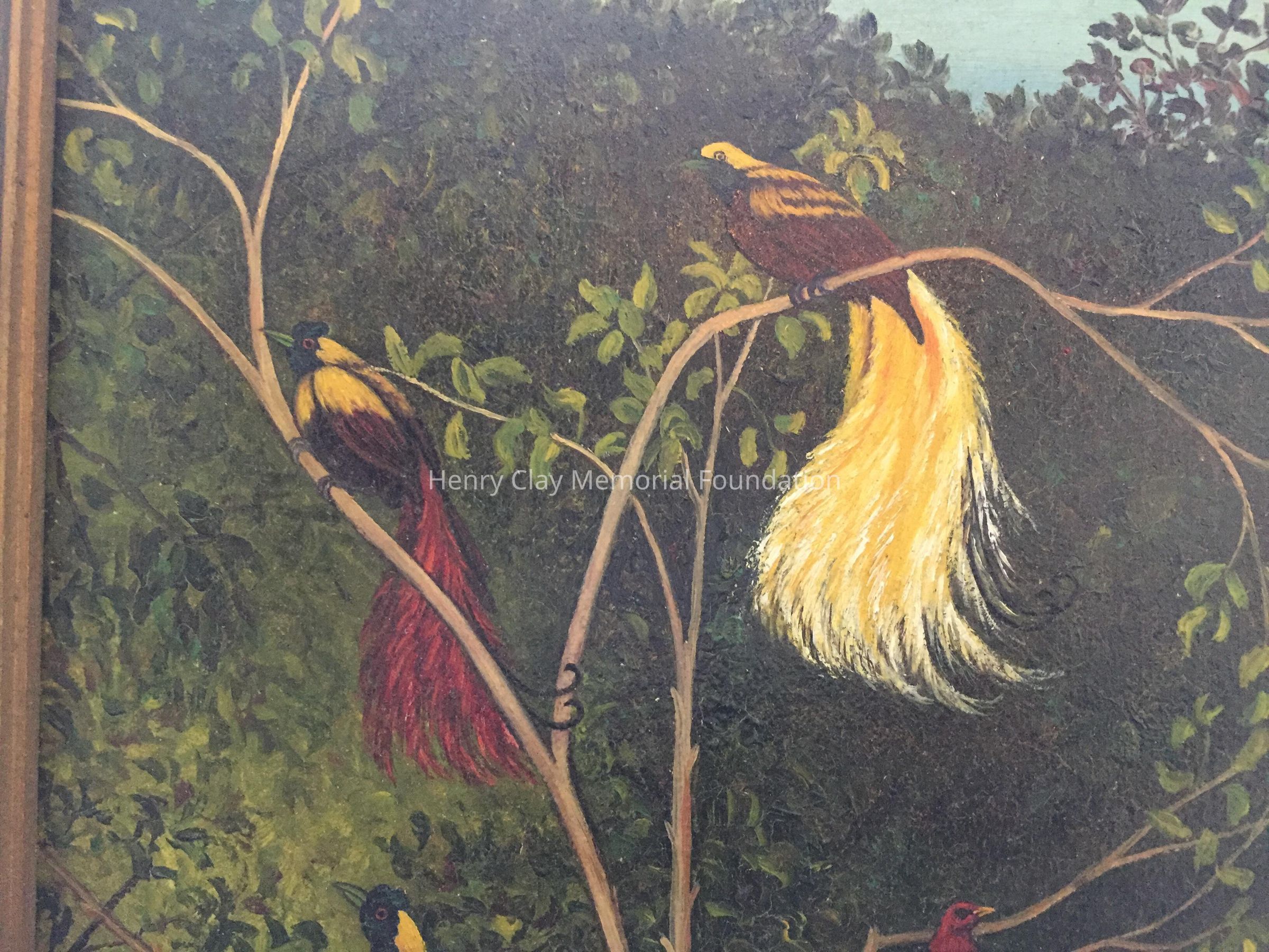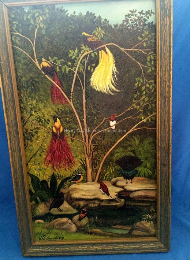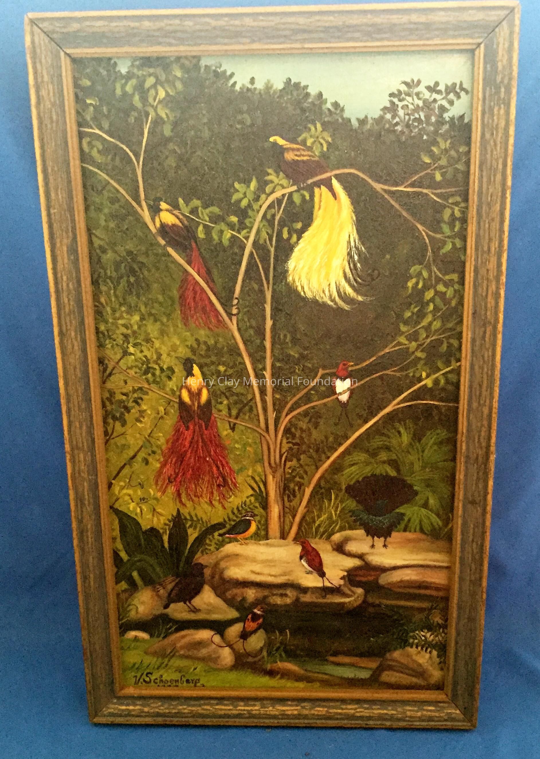 The painting is titled "Birds of Paradise' from the St. Louis Zoo." The notes on the back of the frame tell about the birds. There are very vibrant colors used in the painting such as yellows and reds in contrast to the dark greens of the forest. Painted by V. Schoenberg.