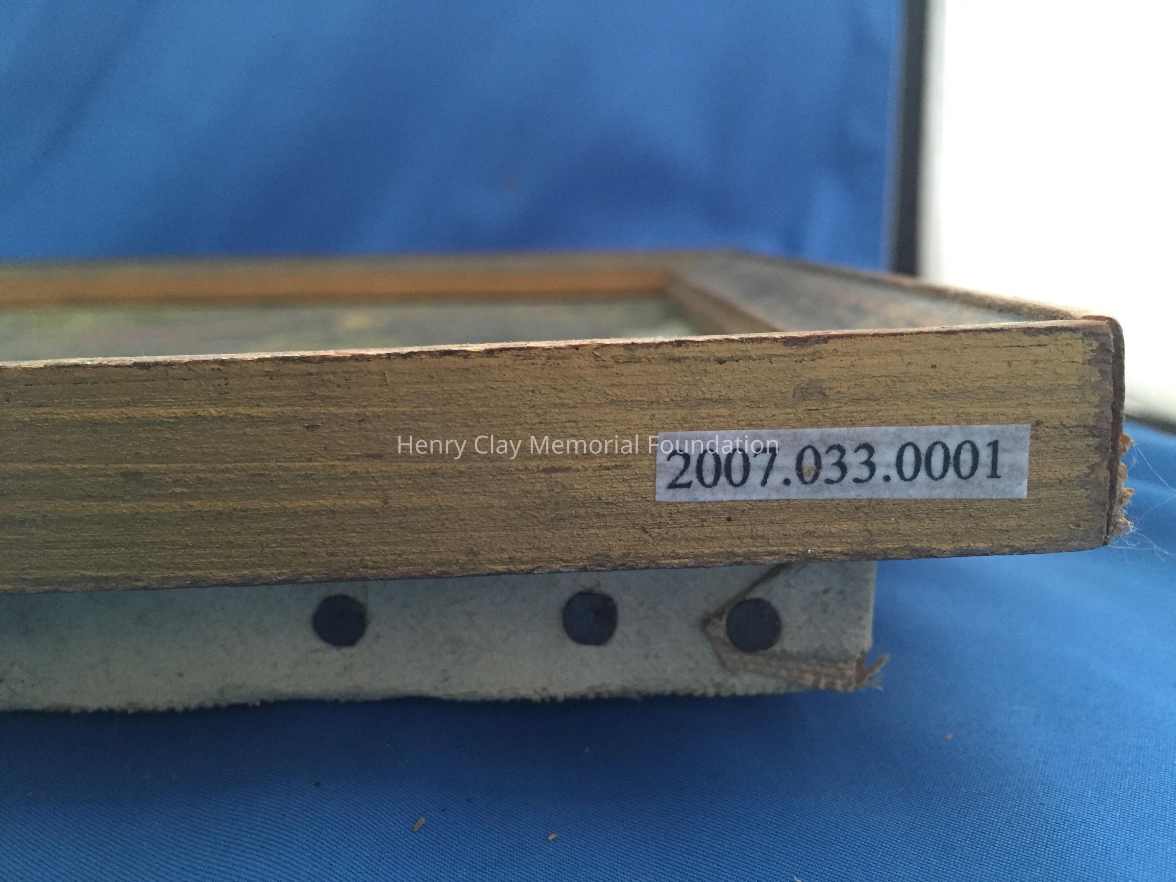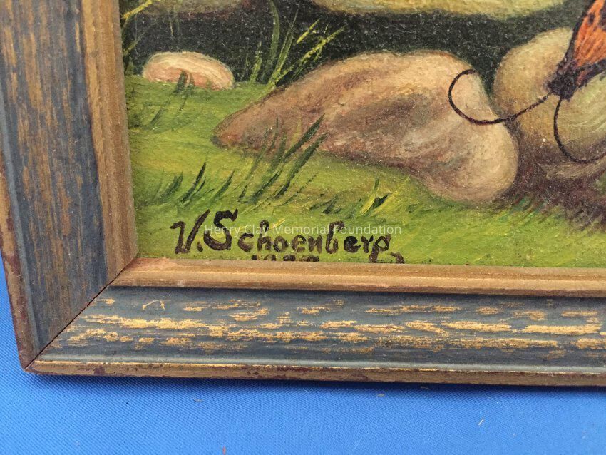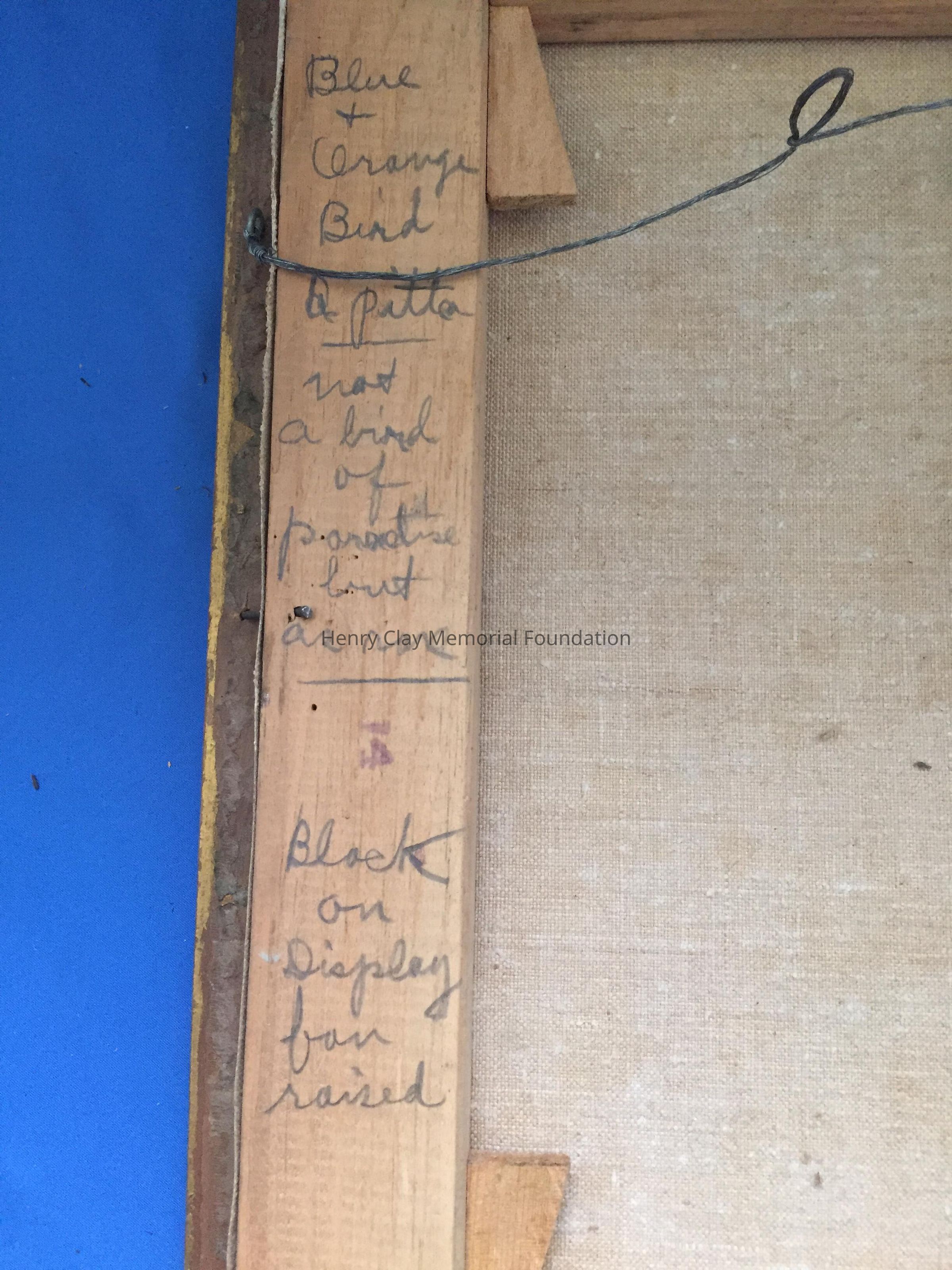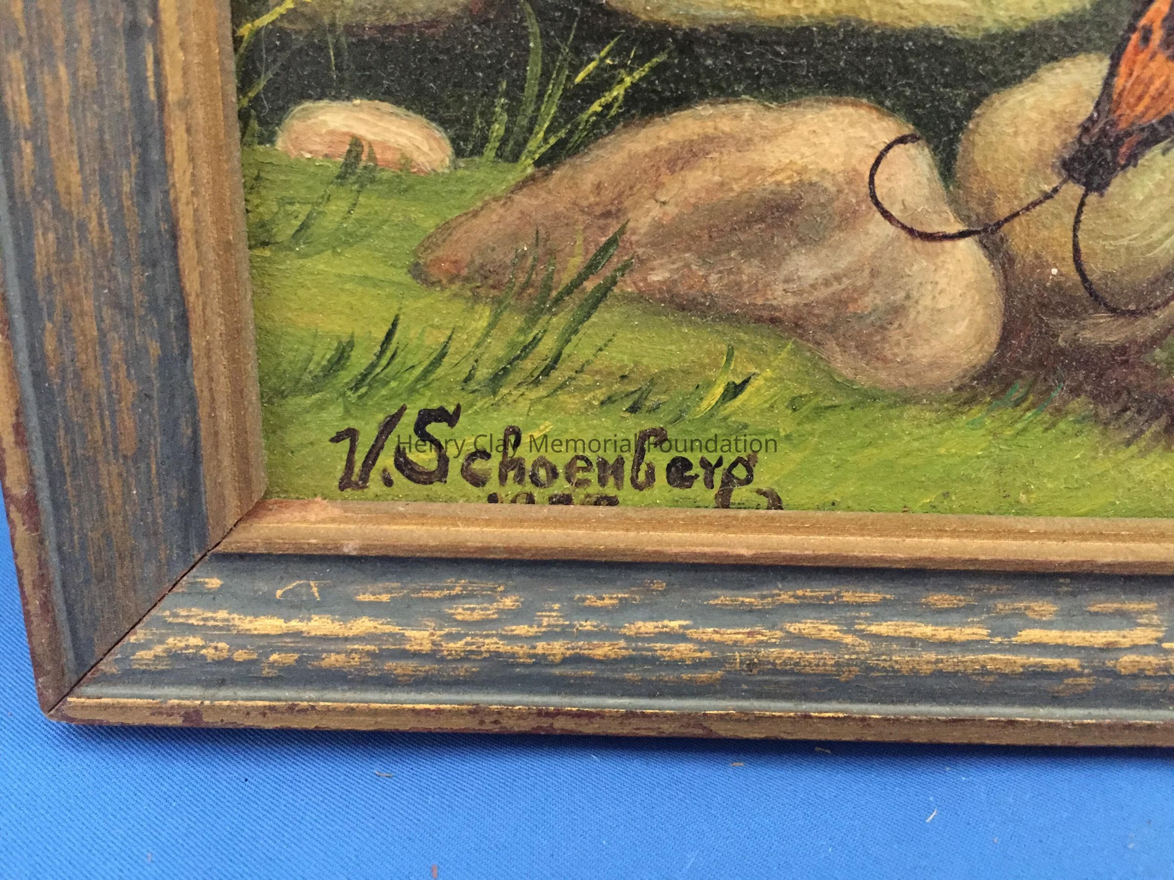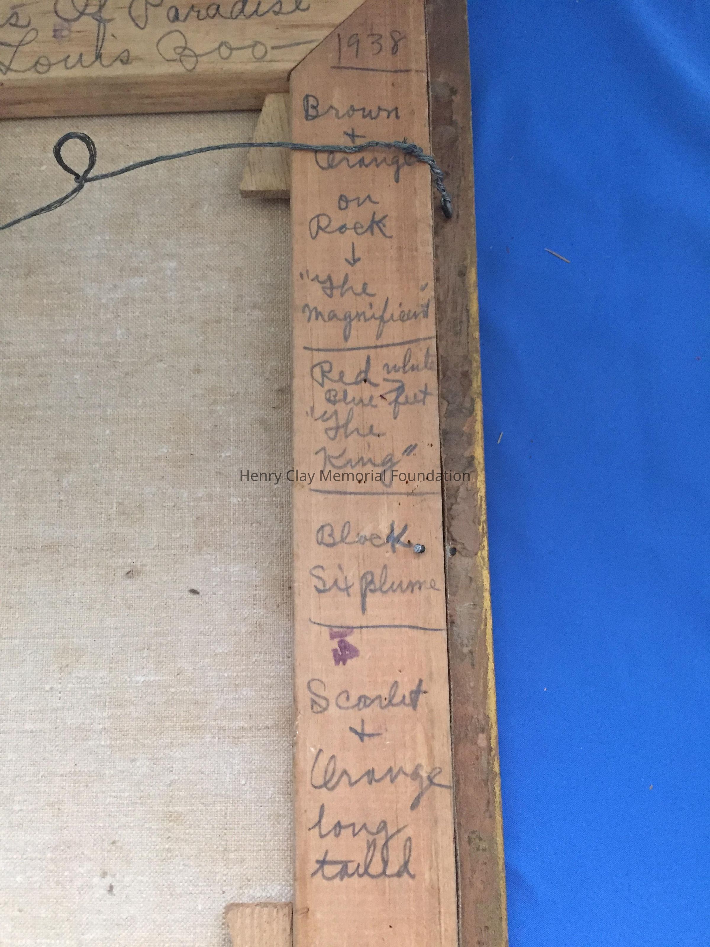 The painting is titled "Birds of Paradise' from the St. Louis Zoo." The notes on the back of the frame tell about the birds. There are very vibrant colors used in the painting such as yellows and reds in contrast to the dark greens of the forest. Painted by V. Schoenberg.