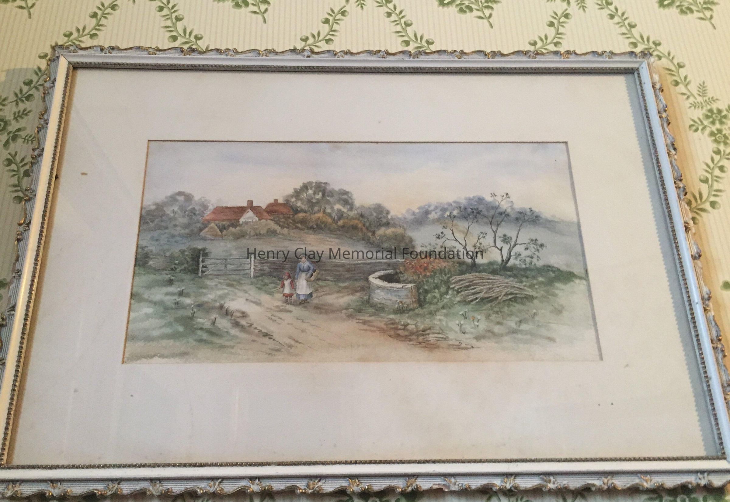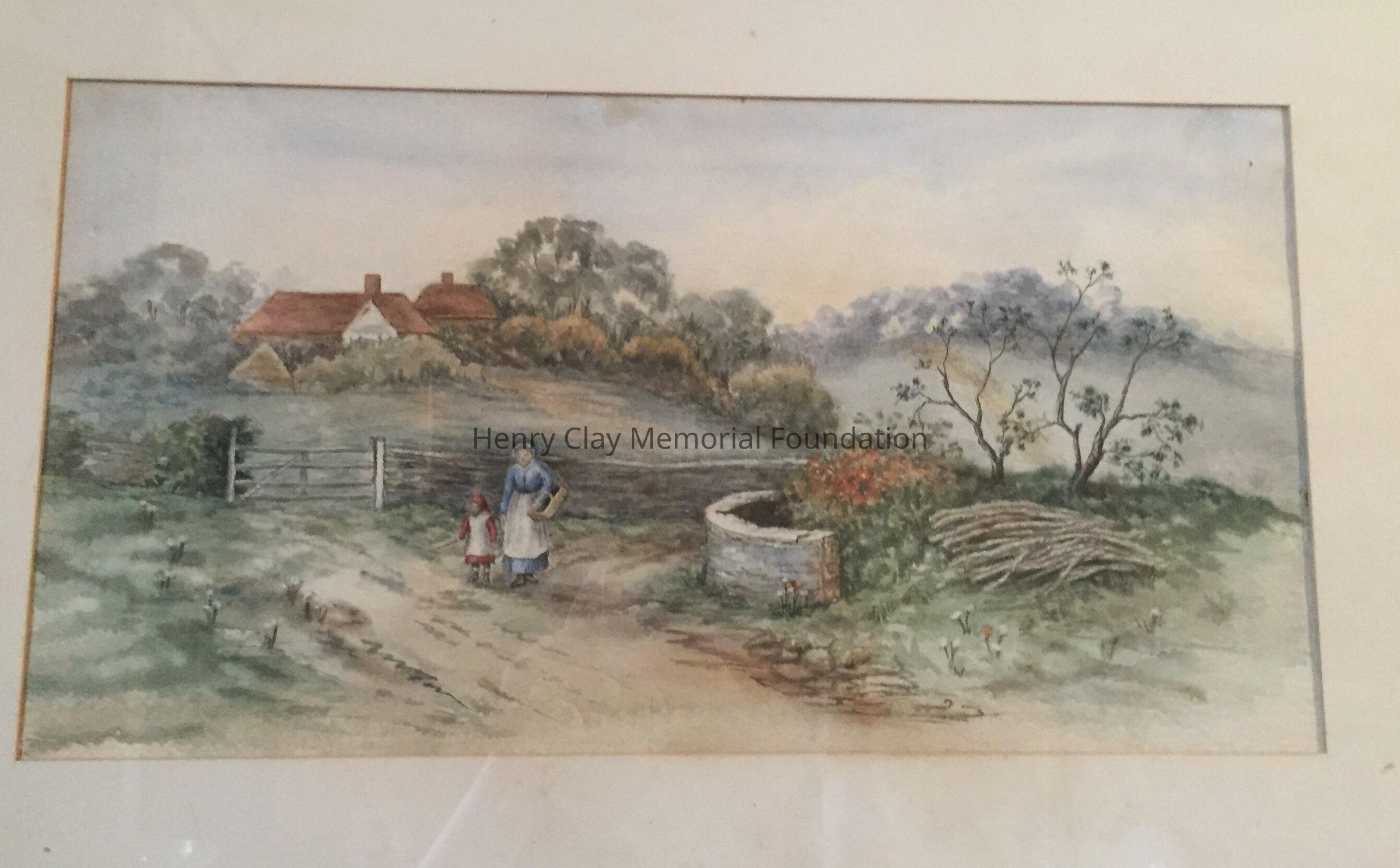 Country scene: house in background, woman and child, watercolor.