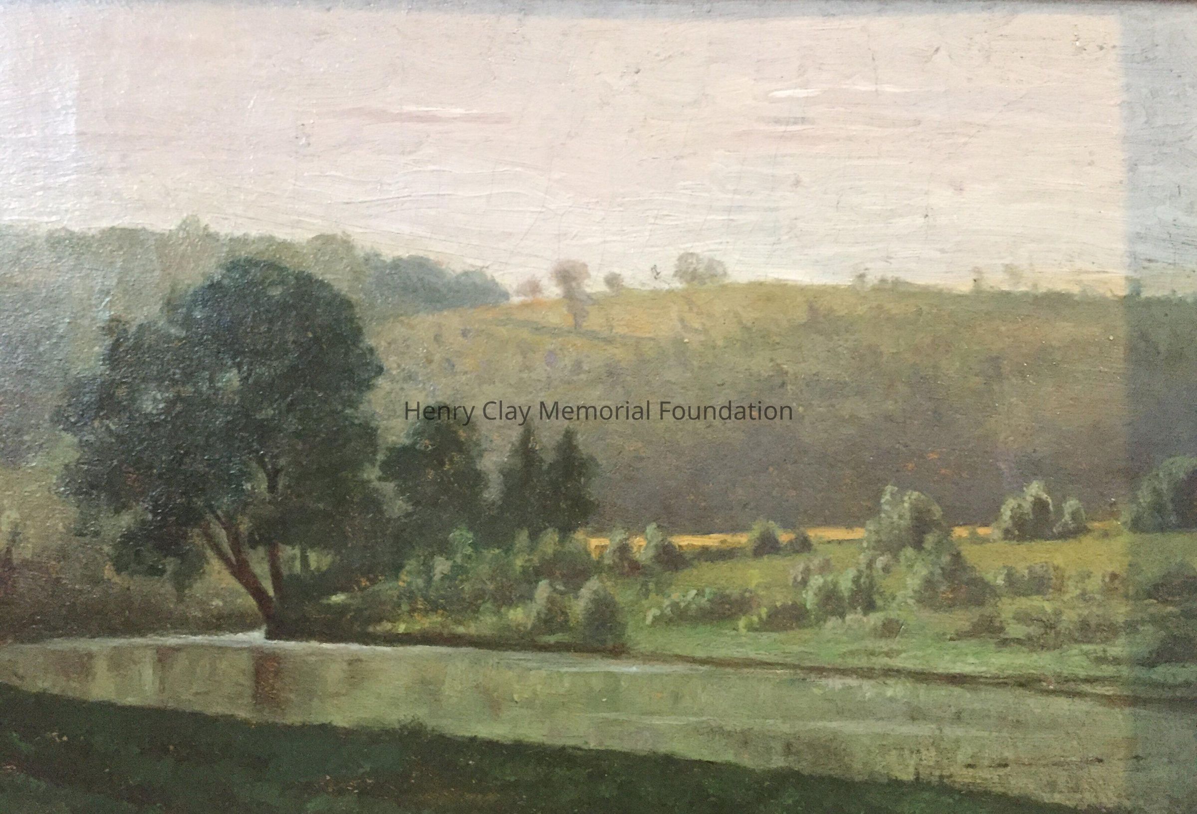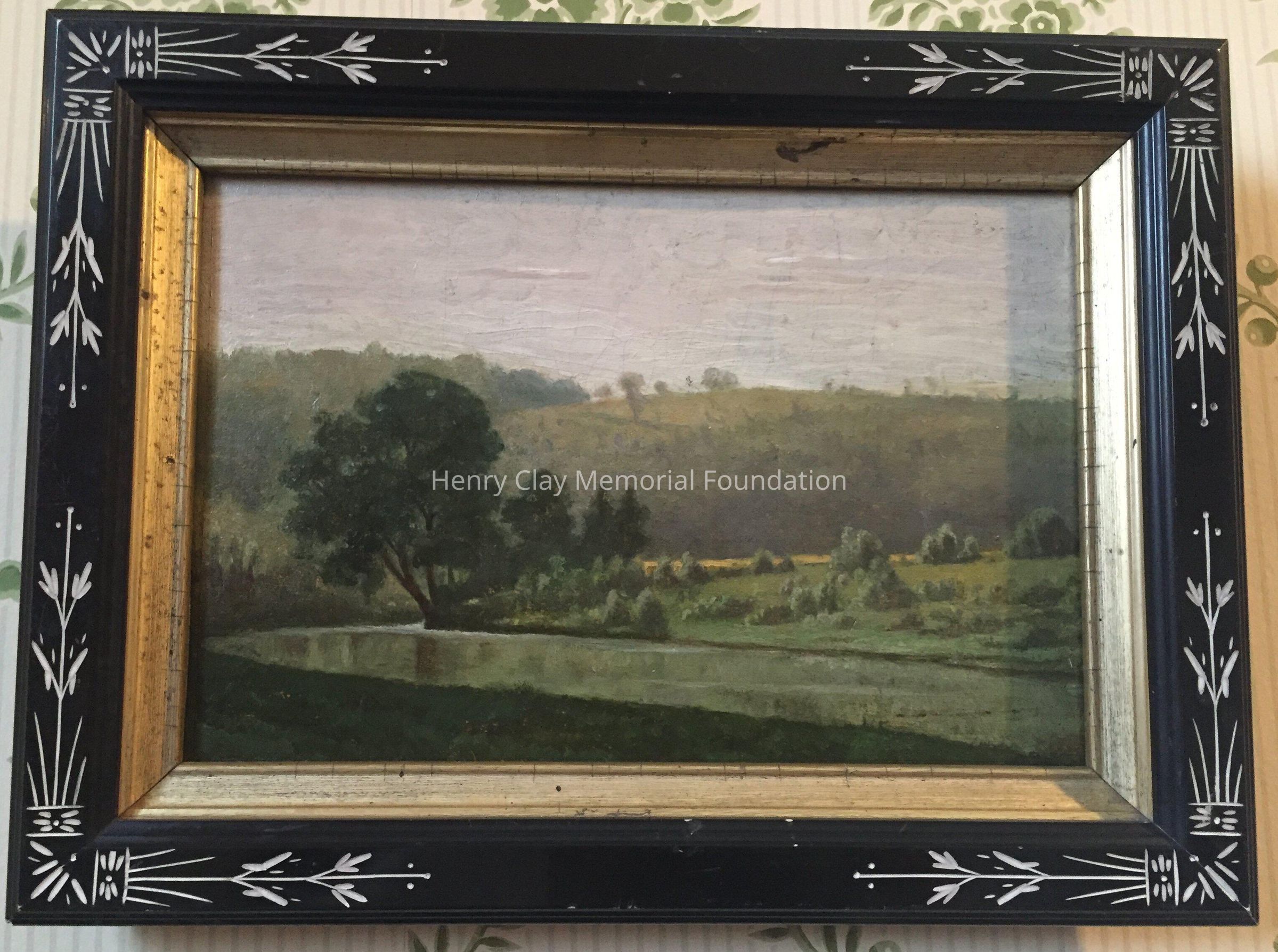 Colorful landscape, painted primarily in shades of green, showing fields on rolling hills, trees. Unsigned. In black Eastlake-style wooden frame with white incised decoration and gilt inner lip.