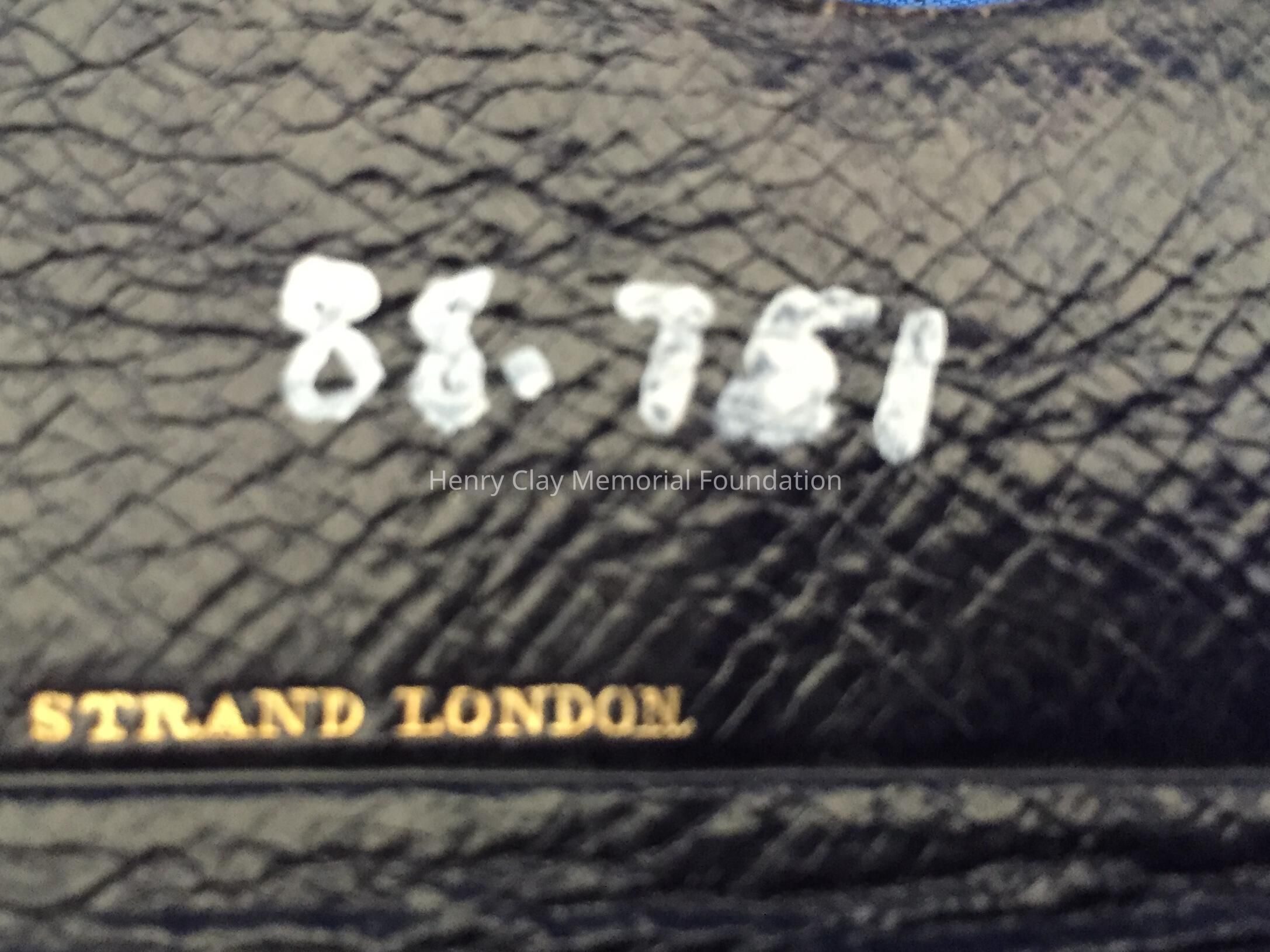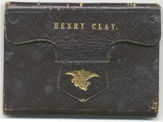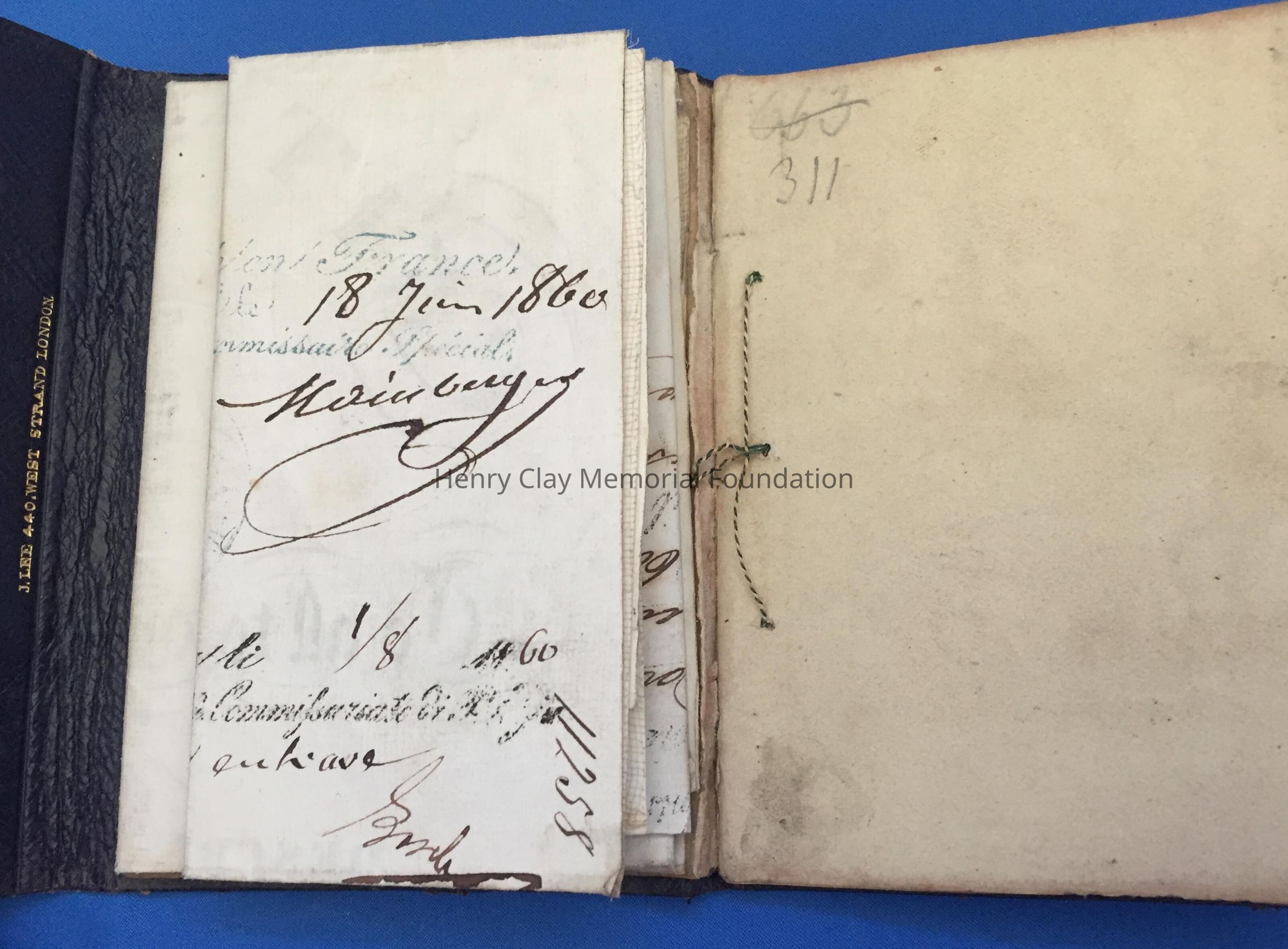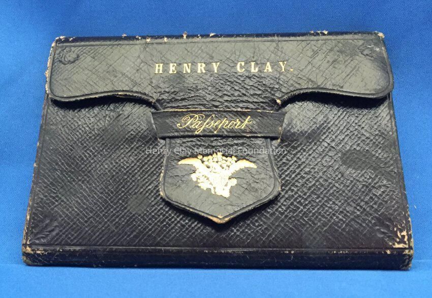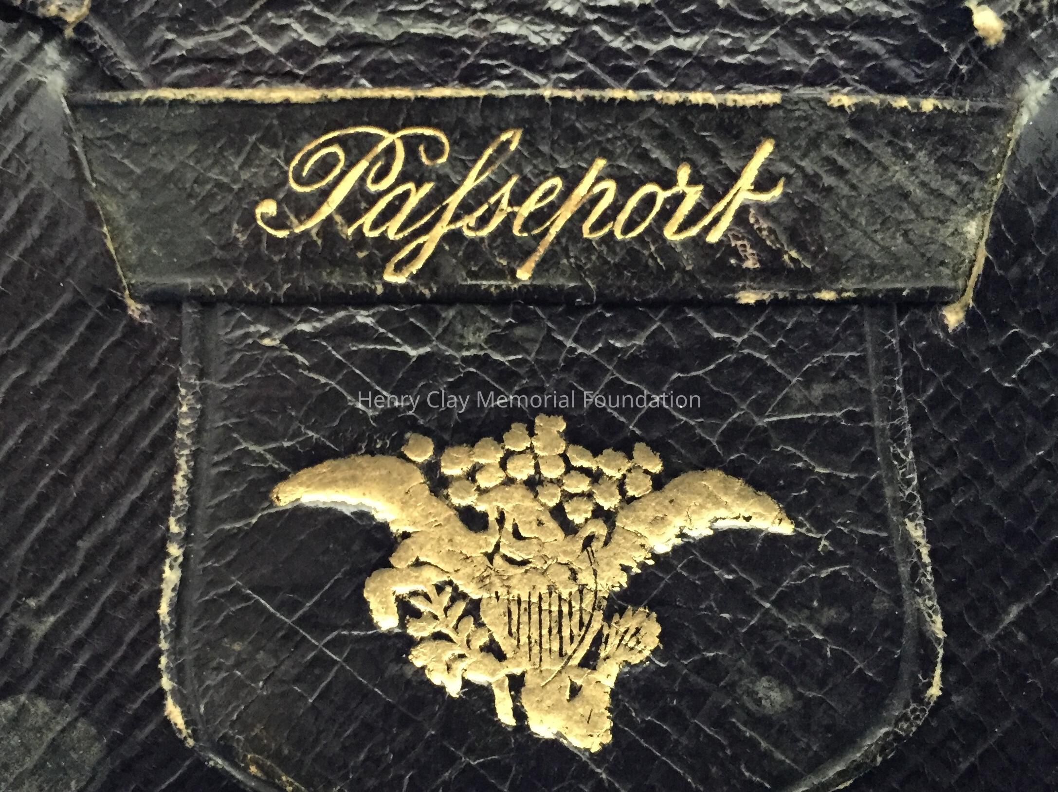 April 27, 1860 passport to Henry Clay aged 26 years. Bound in black leather with "Henry Clay." and an eagle beneath it embossed in gold on the front flap. "Passport" is embossed in gold letters on the flap strap. Inside has folded linen [?] paper document adhered to case with description of bearer and gilded pages with stamps from various countries. Printed in gold on the inside lip, "J. Lee 440, West Strand London."Dimensions