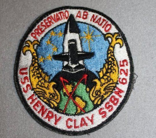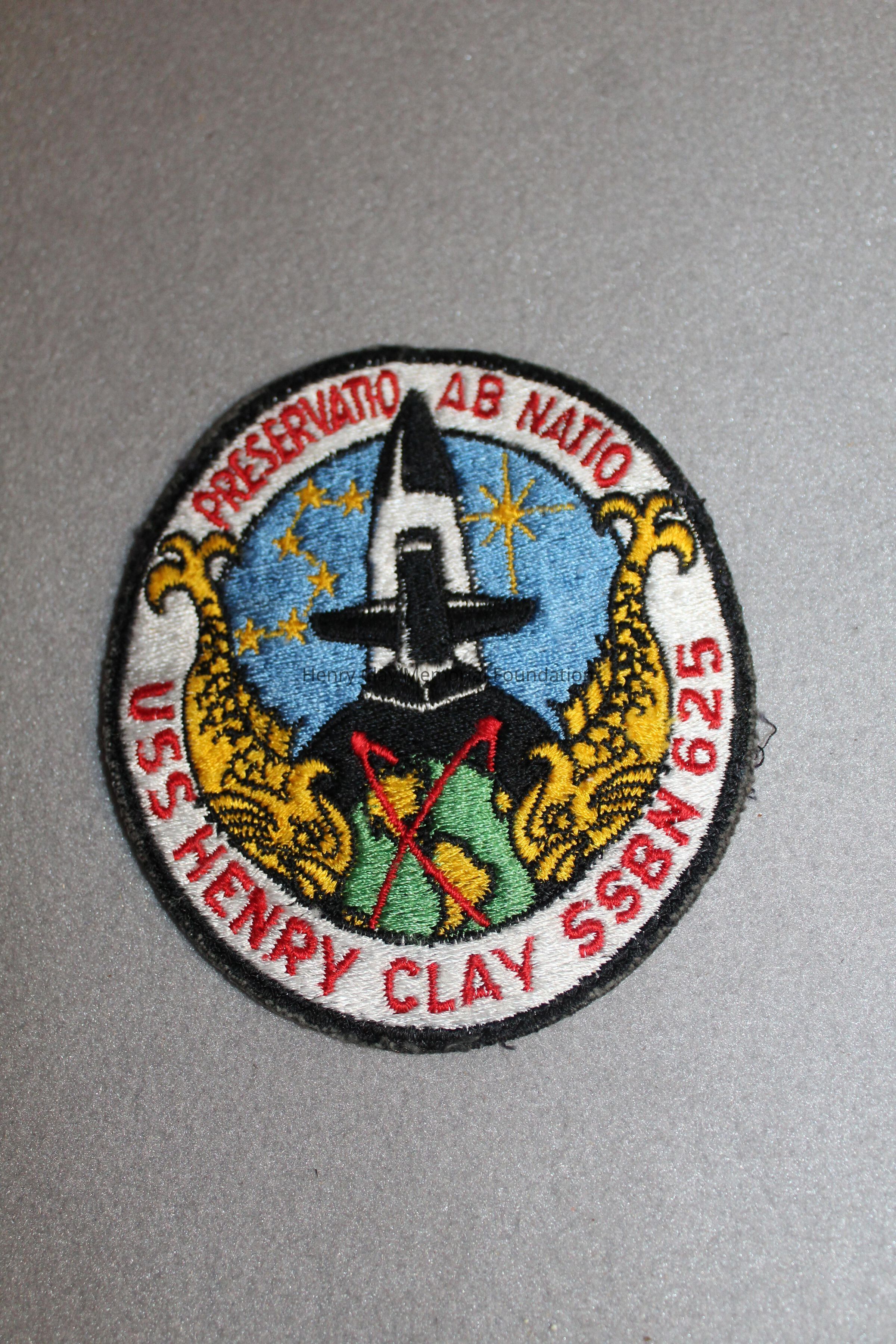 One embroidered shoulder patch. Patch features a front view of a submarine in front of a nuclear missle between two heraldic dolphins. At the bottom front is a globe surrounded by atomic particles. The whole is surrounded by a white band with the words "Preservio ad Natio" at the top and "USS Henry Clay SSBN 625" at the bottom. Patch is in color. the missile is black and white, th esub is black, the dolphins are gold, the globe is green and gold, and lettering is red. The background is blue with a constellation to the left of the missile and a star to the right.