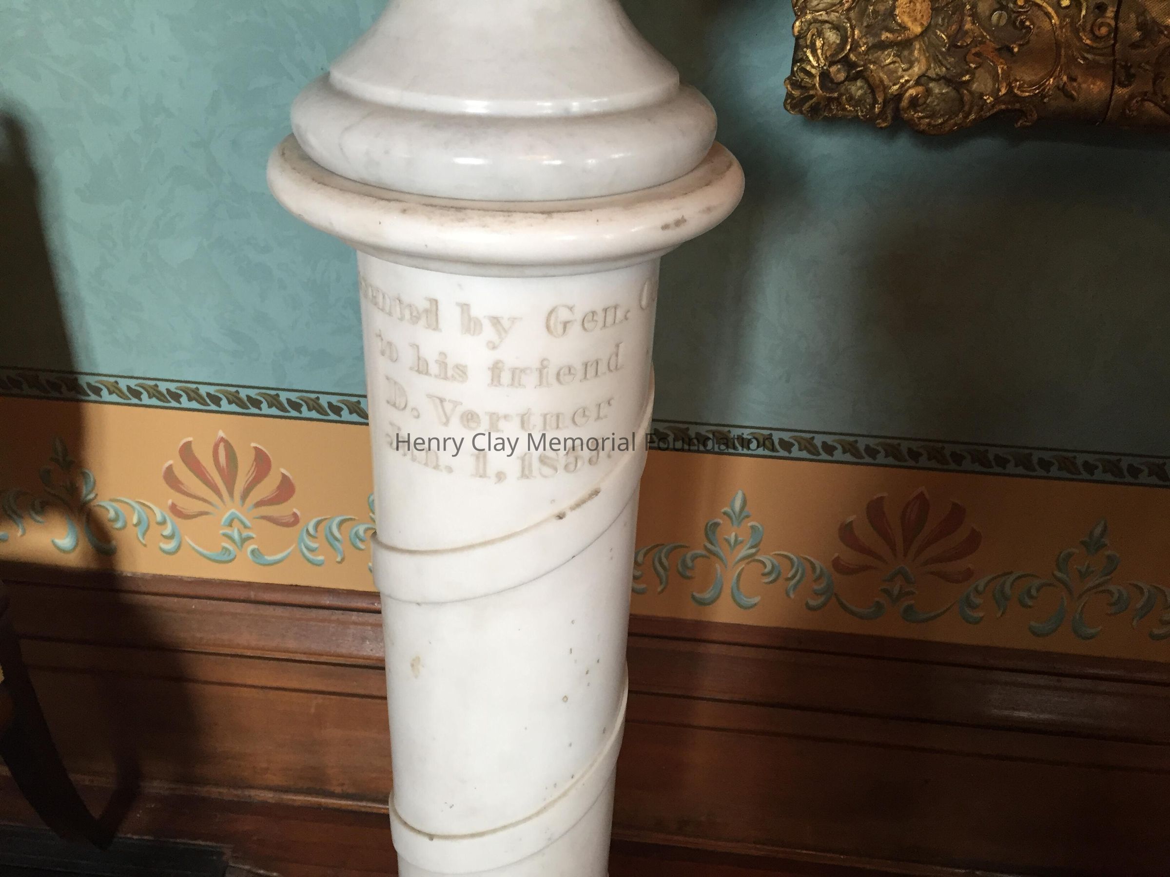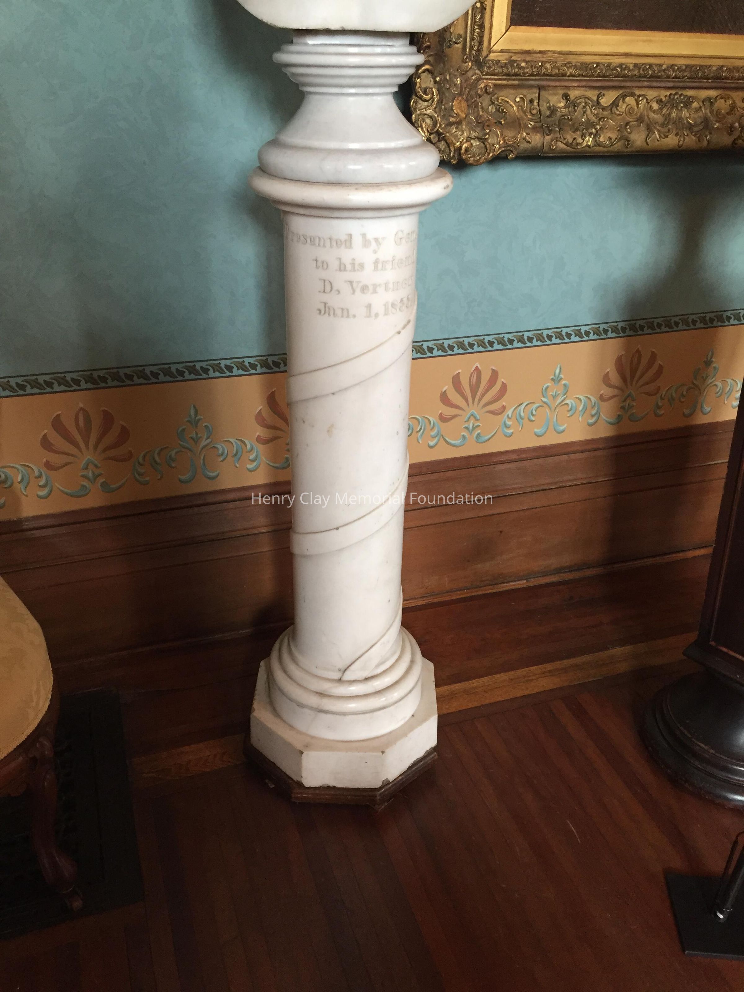 Marble, round, inscribed: "Presented by Gen. Combs to his friend D. Vertner"; also inscribed "Jan. 1, 1855"; wood base; holds the marble bust of Clay (1988.043 A) by Joel Hart, 1847.