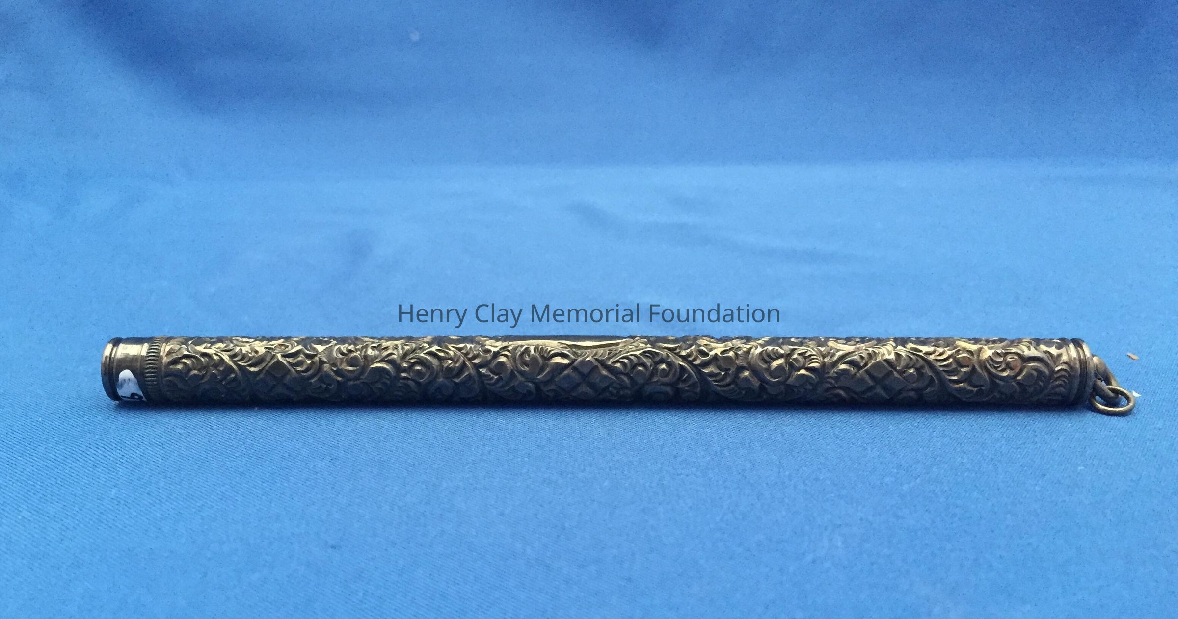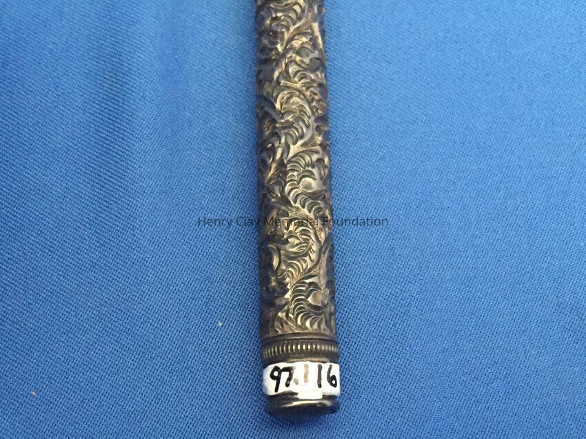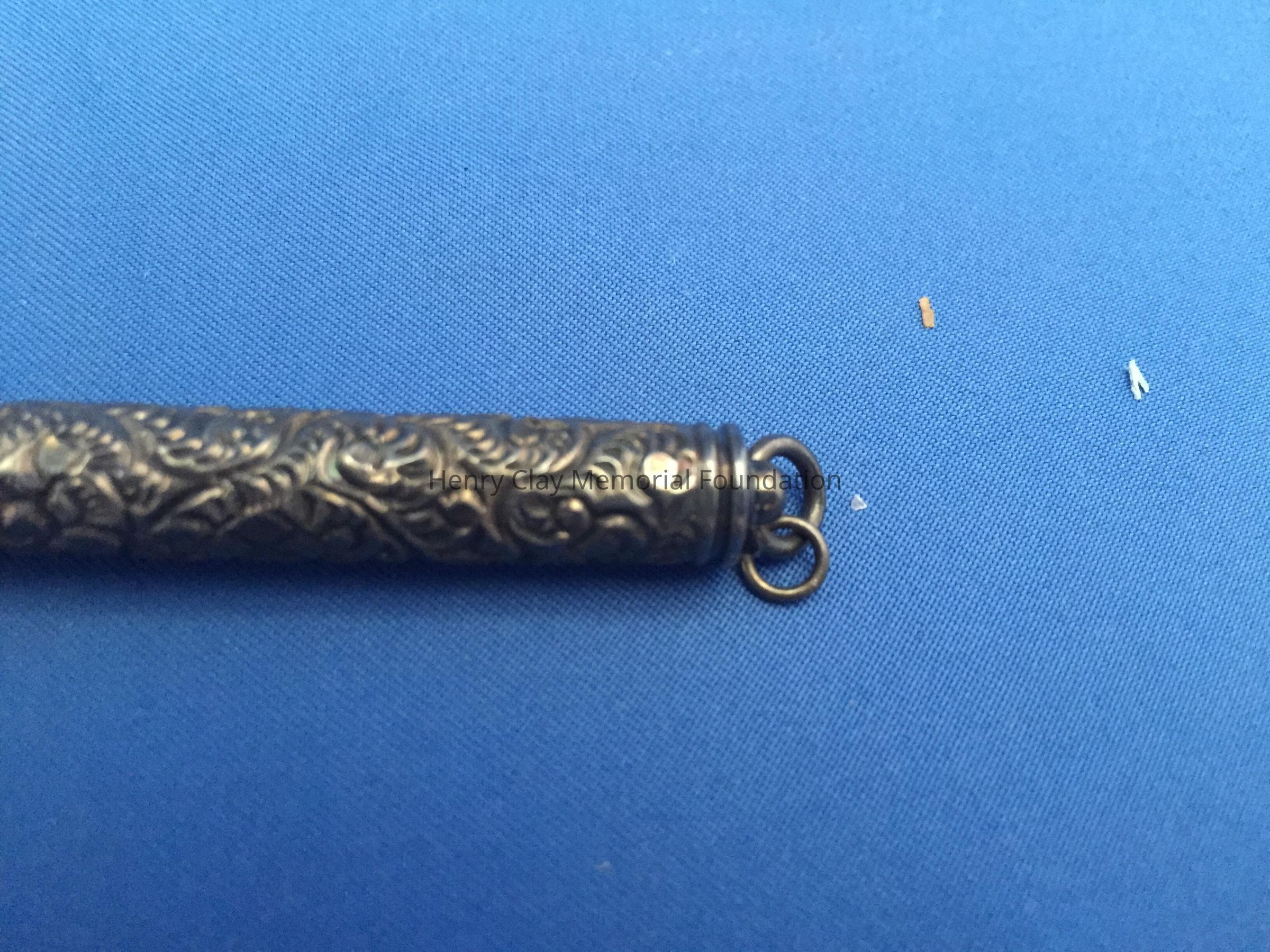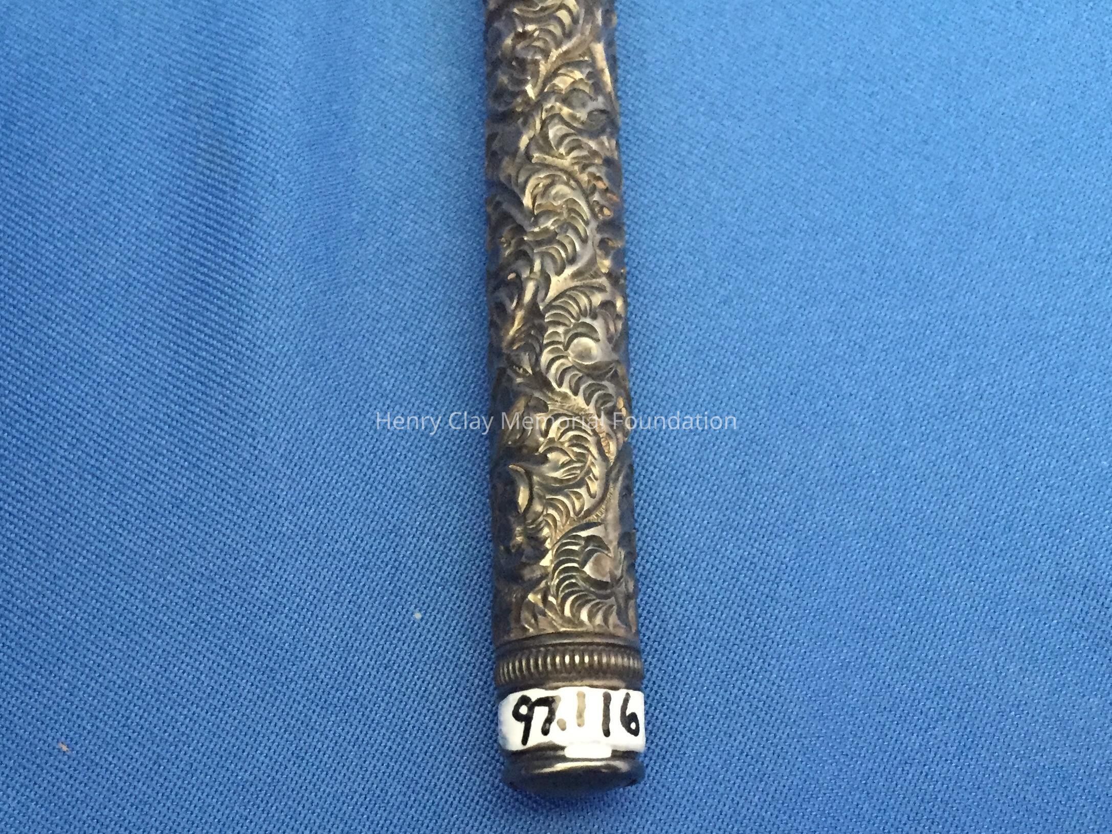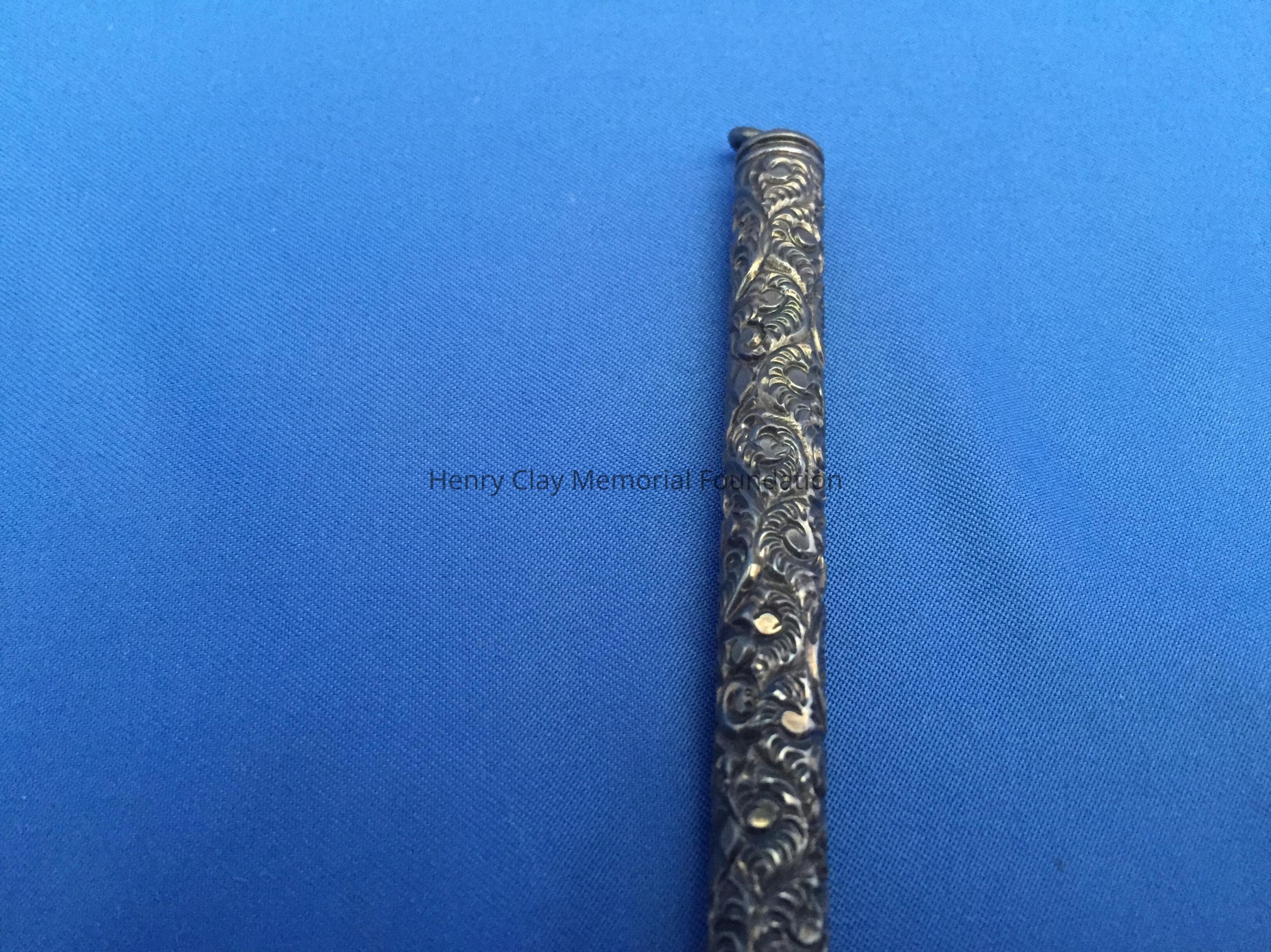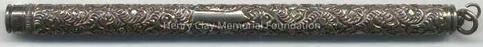 Sterling silver tube. Highly decorated. There is a cartouche on one side, but no inscription is on it. Bottom of the tube has a screw cap.