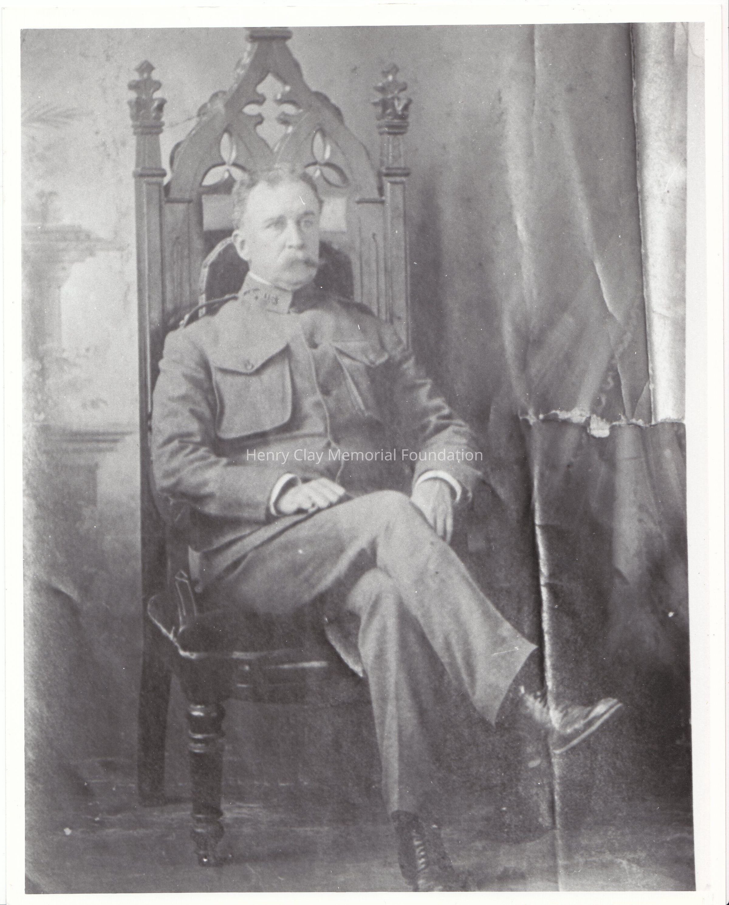 A photocopy on photo paper of a photograph of Charles D. Clay, He is sitting on an elaborate wood chair with what looks like velvet upholster. His legs are crossed, he is wearing an army wool uniform. With U.S and swords pins on his collar during WWI.