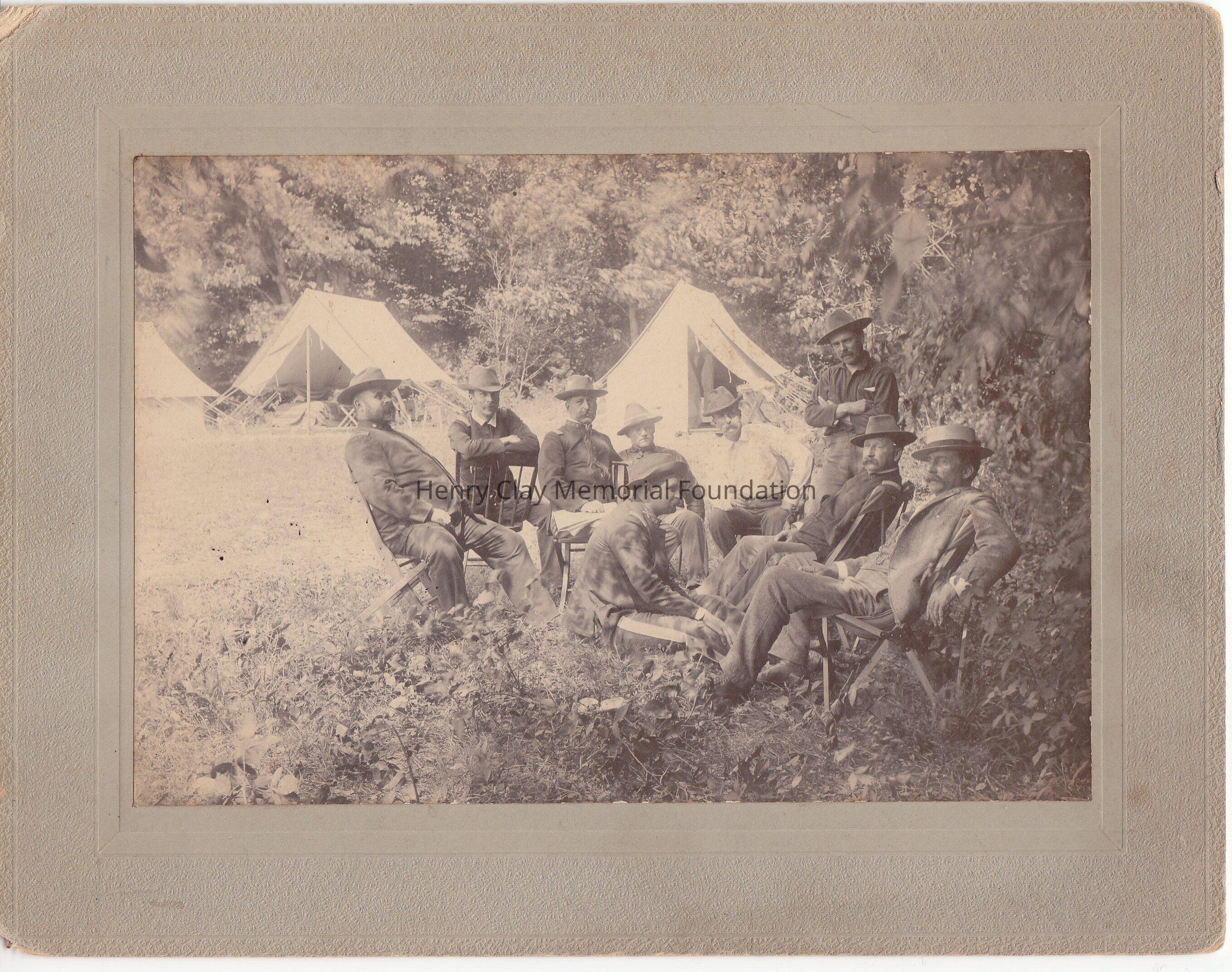 Photograph depicting nine soldiers in an army field. All men are sitting on chairs, but one sitting on the ground and one standing with his arms crossed. Behind them in the background there are 3 military tents. Photograph is placed on a military green cardboard.