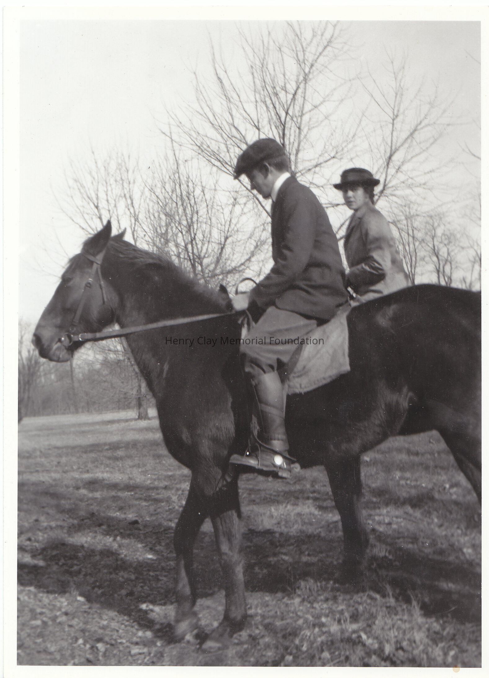 A reprint of a black and white photograph depicting Susan Clay and her brother Charles riding on the Clay farm.