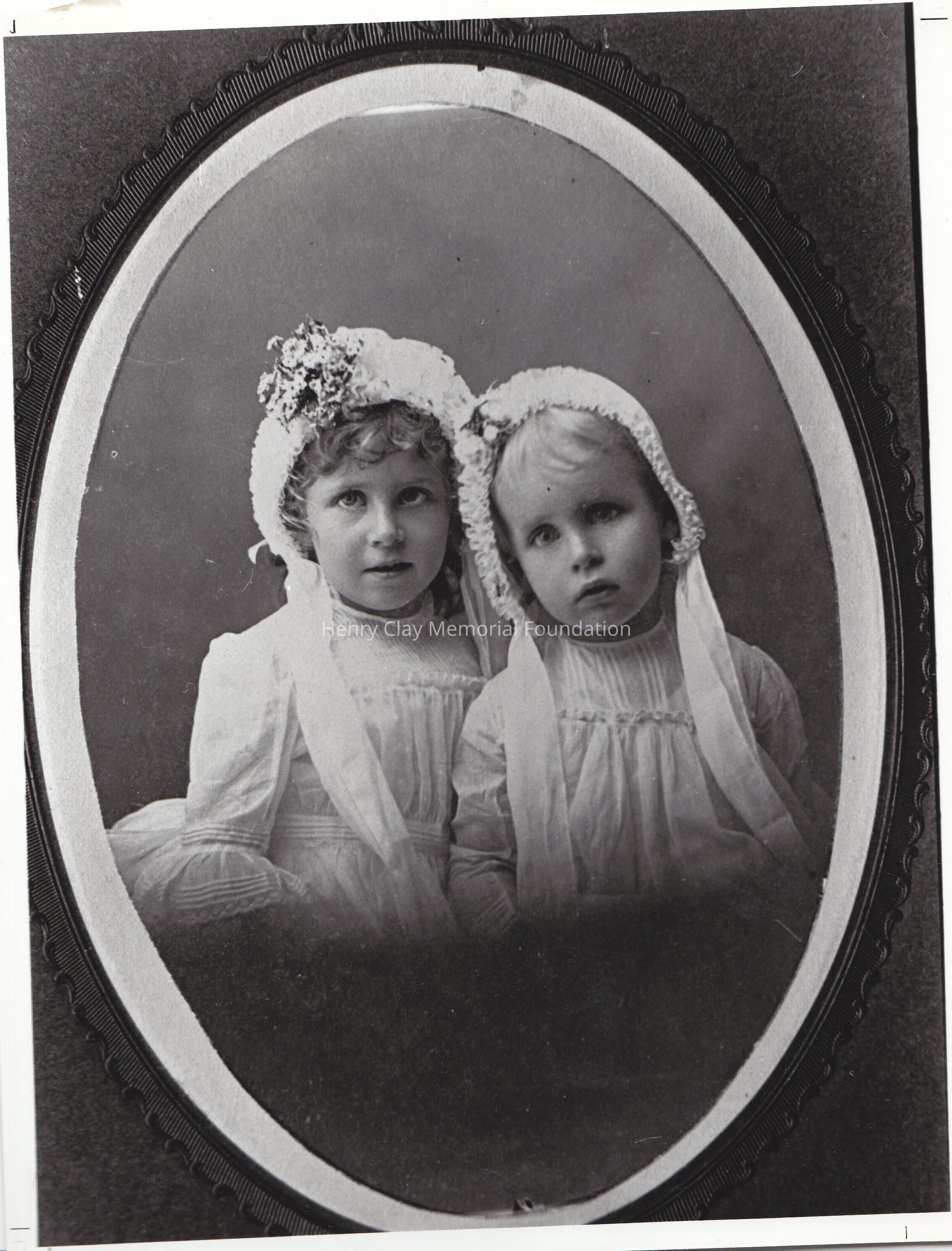 Enlarged copy of a black and white photographs depicting Charlie Clay Jr and Susan Clay Sawitzky. They both are wearing similar dresses, with the only difference of bigger flowers on Susan bonnet.Dimensions