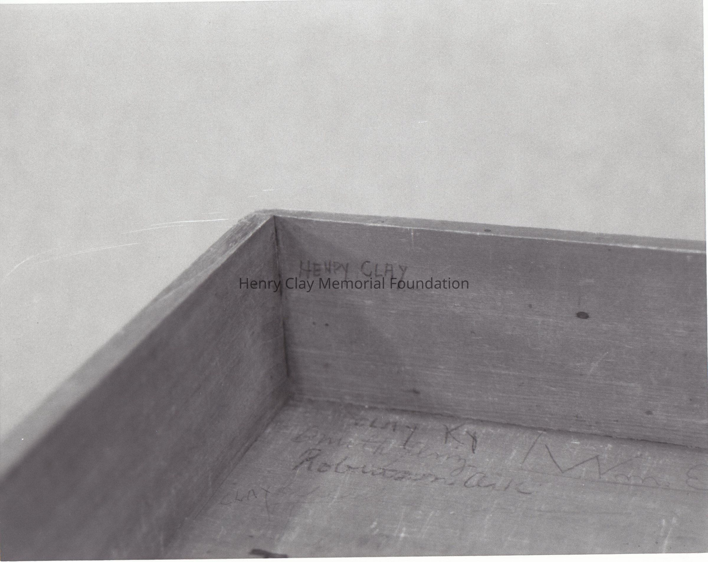 The inside of Henry Clay's senate desk. Inside visible "Henry Clay" in pencil, "Ky", "Clay" and other writings.
