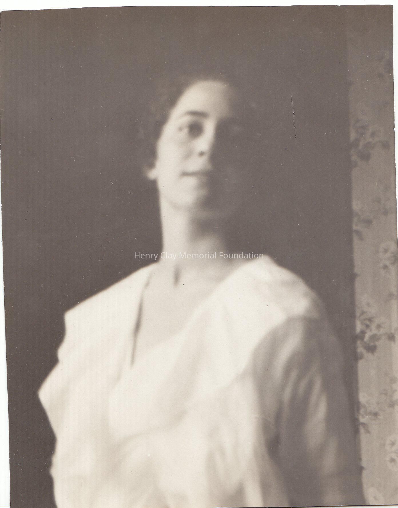 Photograph of Susan aroun 1915. She is standing near a wall covered with floral wallpaper. She is wearing a light colored blouse with ruffles in front. She smiles and look the horizon.Dimensions