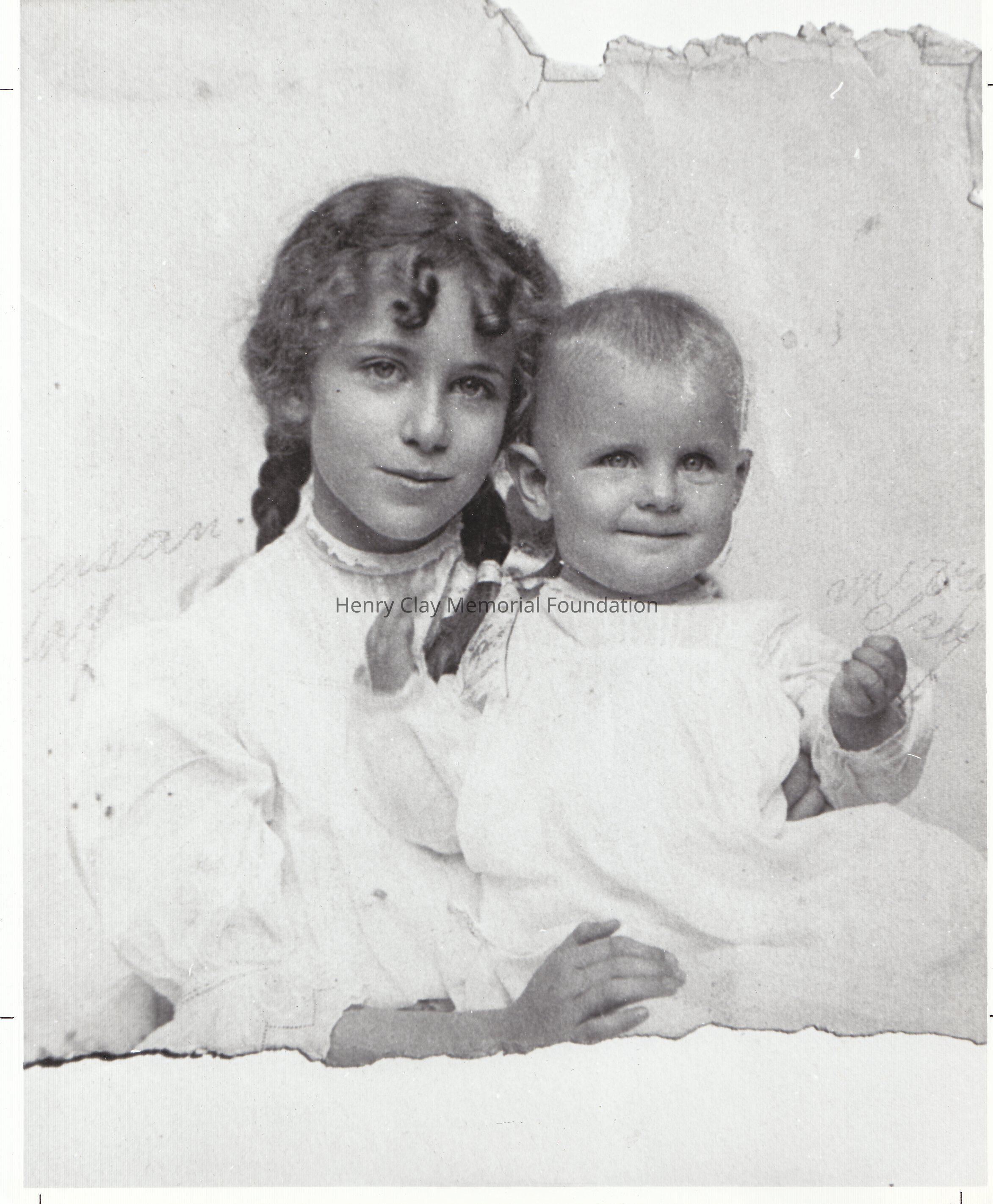 Copy of a black and white photograph of Susan at age 10 and Baby Metzie (Elizabeth). Susan has braided hair, and she is holding a smiling Metzie.
