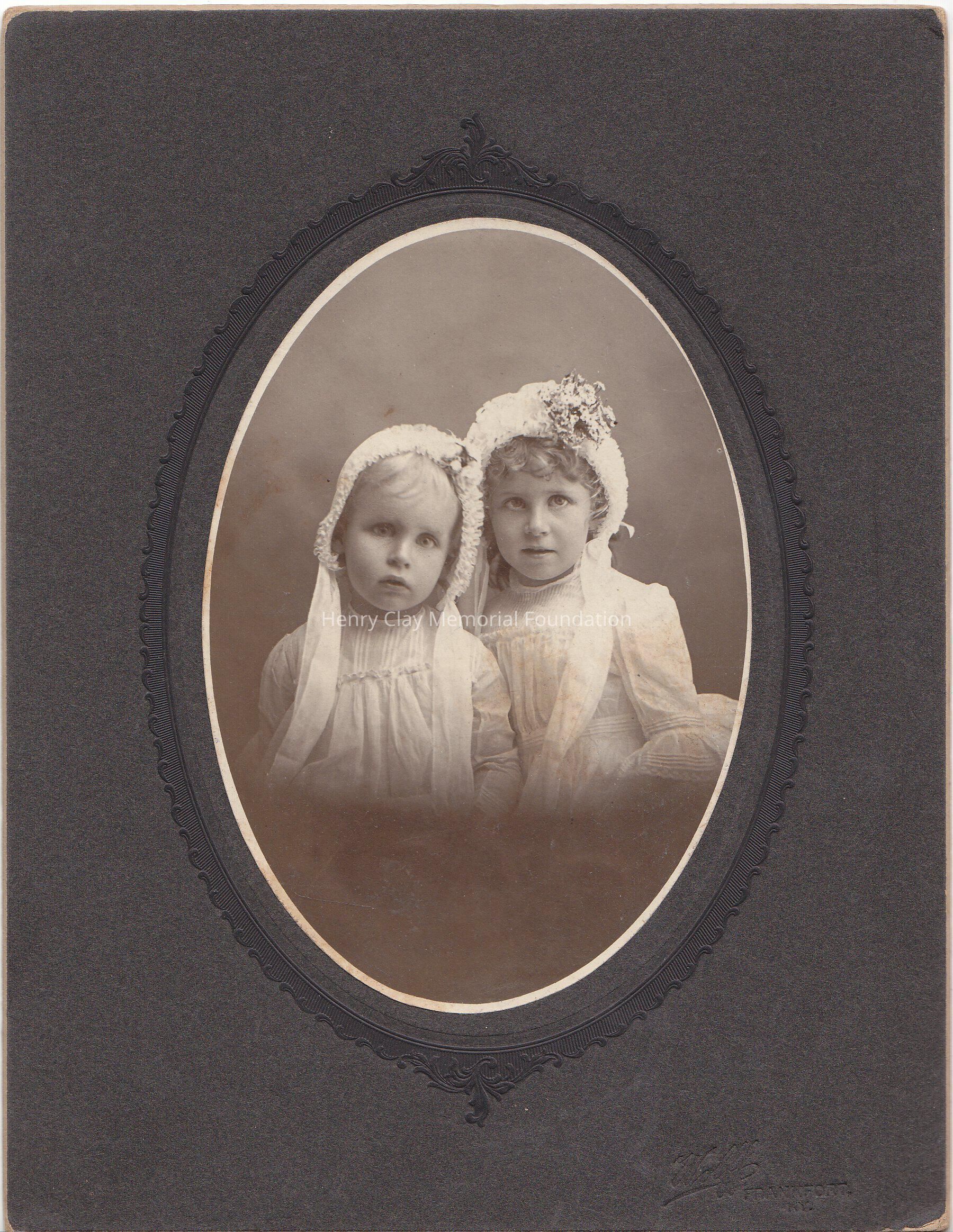 A black and white oval photograph of young Susan and her brother Charlie. Susan is the child with curly hair, and a bonnet with flowers. Charlie is the child on the left. They both wear what seems the same dress and bonnet. The photograph is framed in a dark green cardboar frame by Wolff Frankfort, Ky. The name of the photographer can be seen in the right bottom corner.