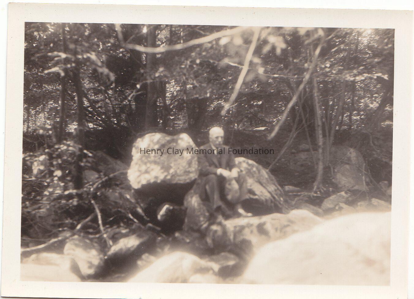 A photograph of Vassili Sawitzky sitting on rocks, in Vermont 1931, as an handwritten note states in the rear of the photograph.