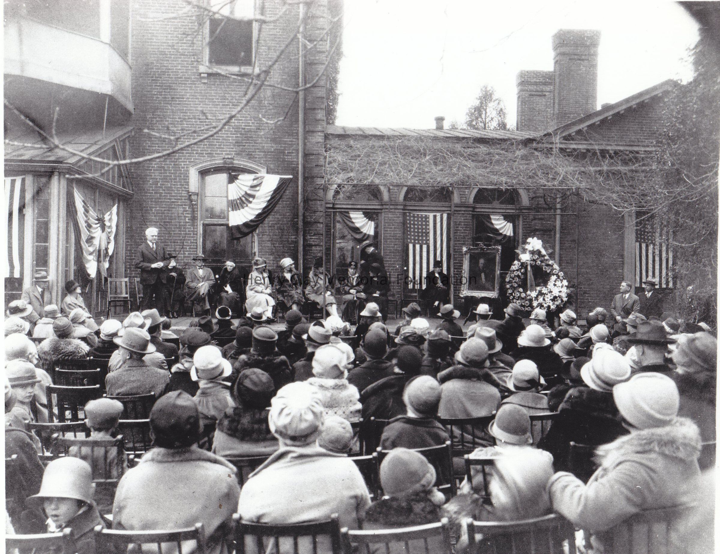 Presentation of George Peter Alexander Healy portrait of Henry Clay, April 12, 1927. The picture was taken in the back side of Ashland, and the painting can be seen on the right next to the wreath of flowers.