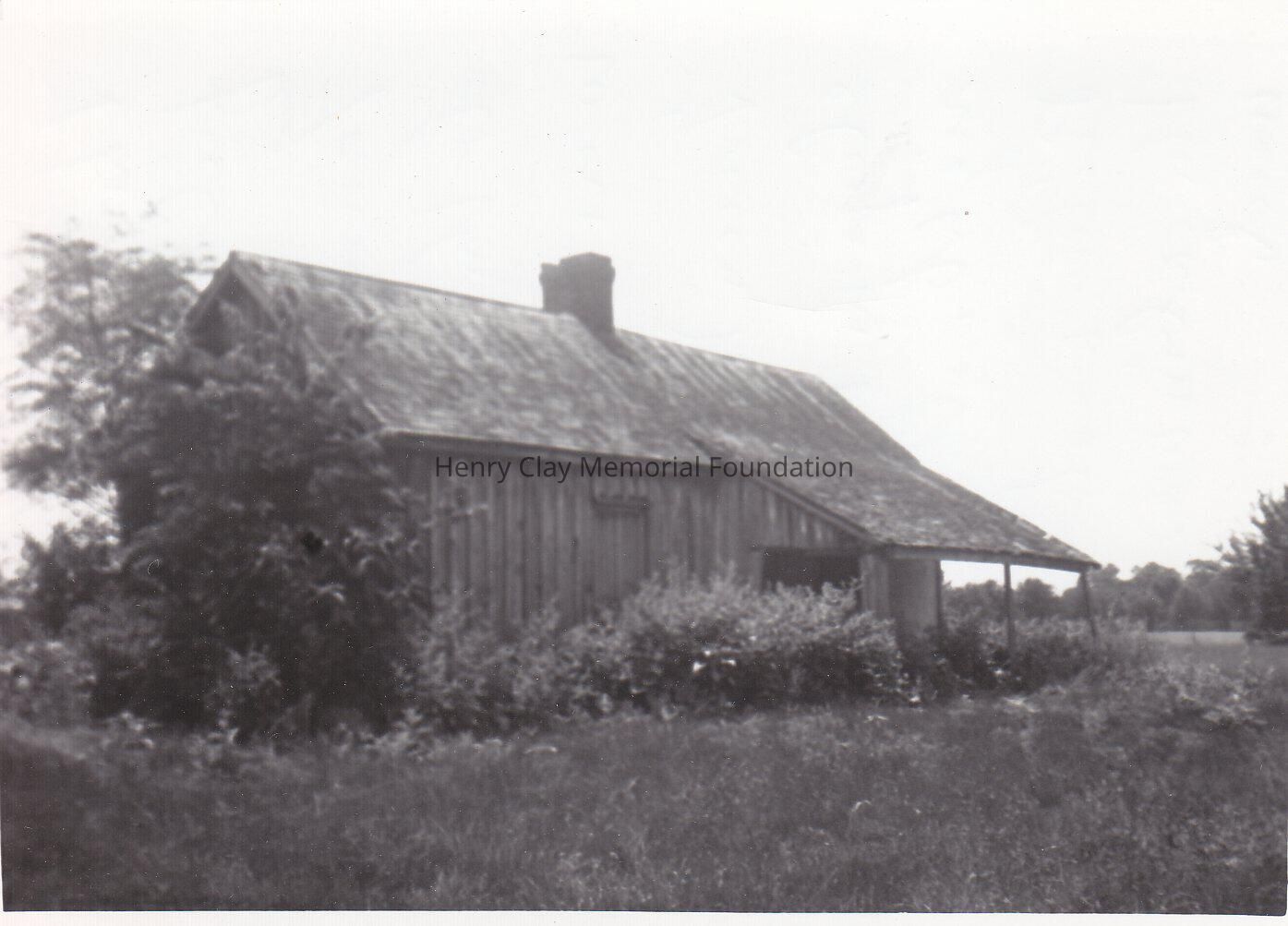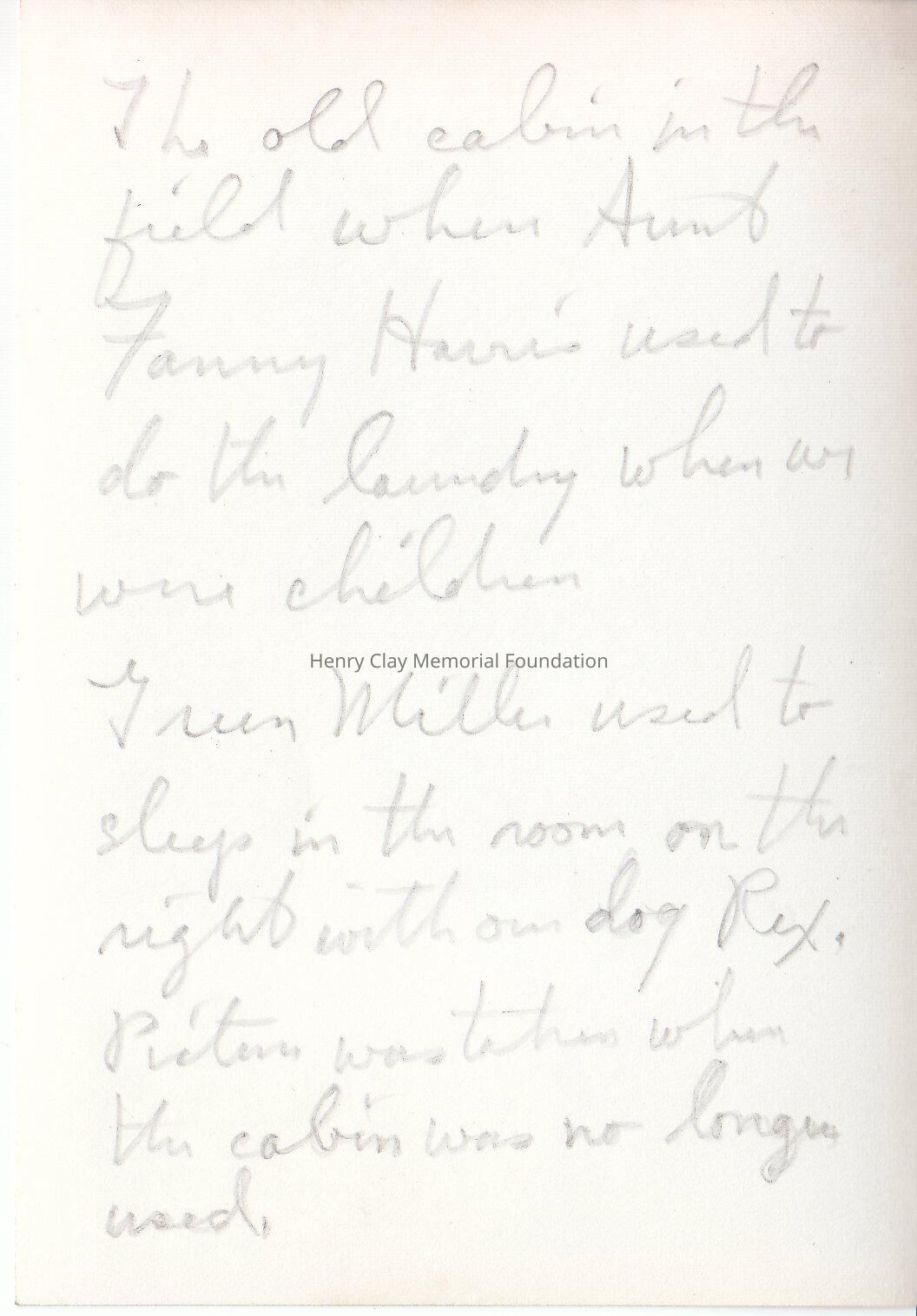 Black and white photograph of an old cabin in a field. In the rear handwritten by Elizabeth Clay Blanford " The old cabin in the field when Aunt Fanny Harris used to do the laundry when we were children. Irene (?) Miller used to sleep in the room on the night with our dog Rex. Picture was taken when the cabin was no longer used"Dimensions