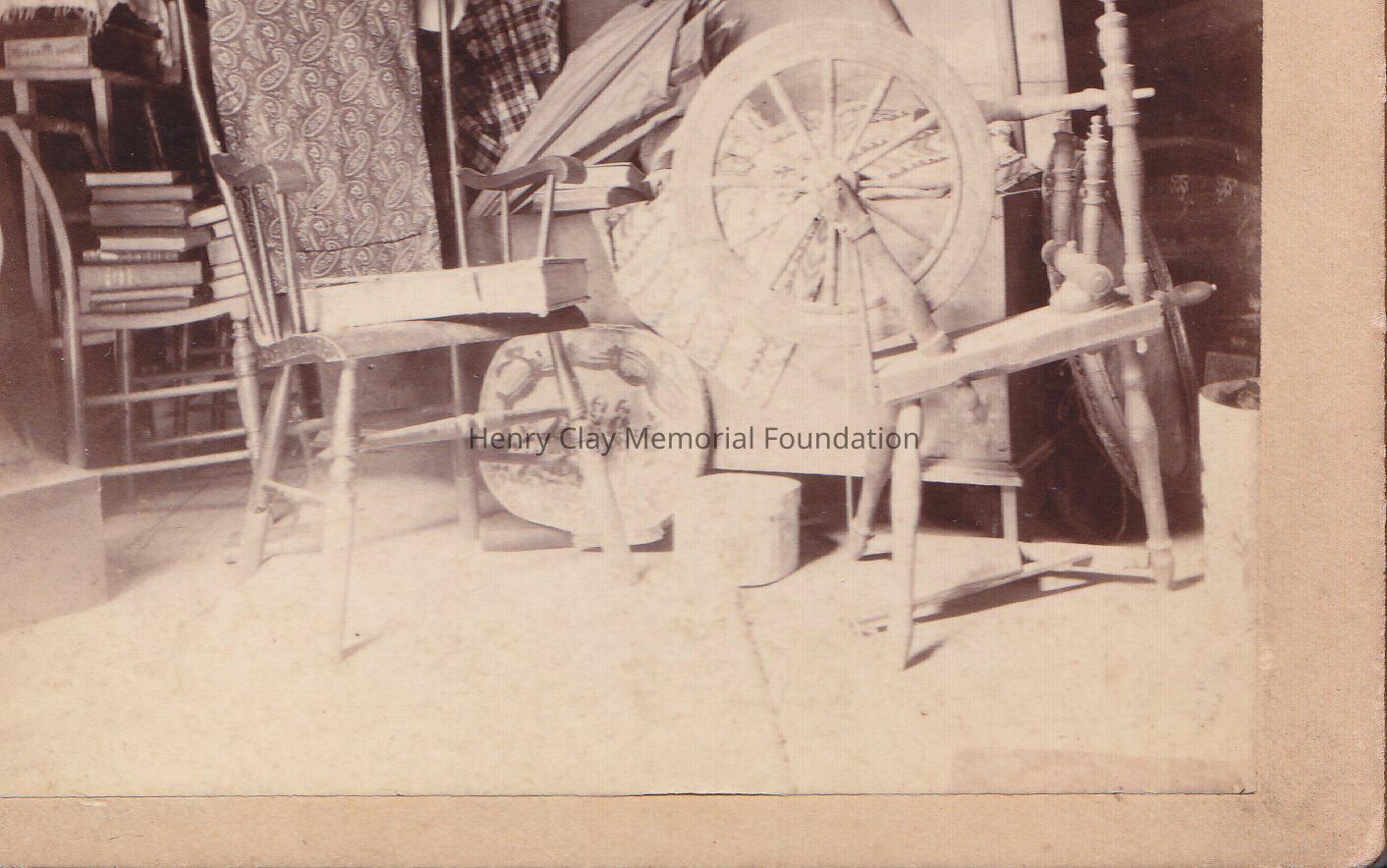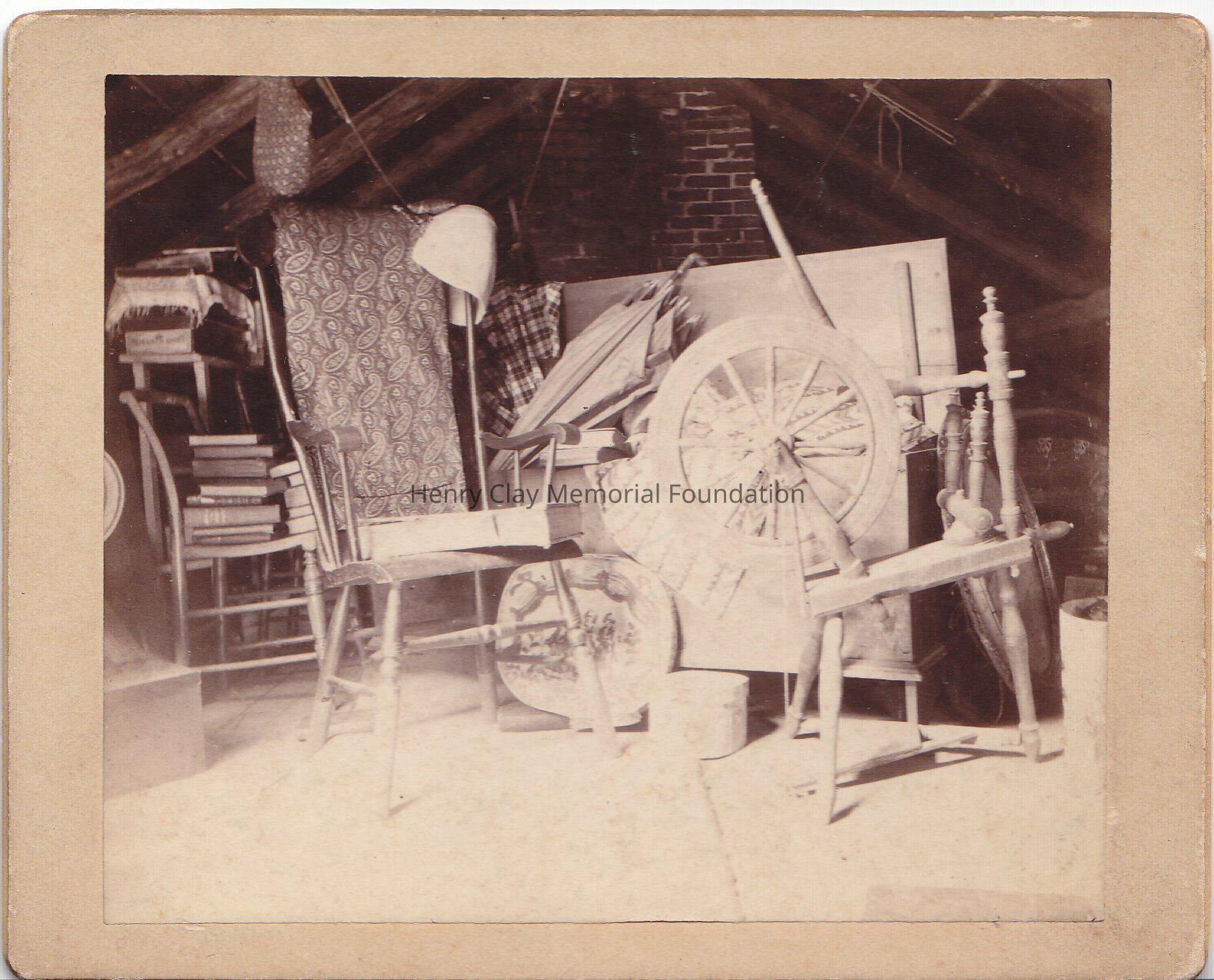 A black and white photograph possibly of the attic above the kitchen wing of the original keepers cottage. Visible the miscellaneous collection of items stored in the attic, inlcuding books, umbrella, chair, fabric, and a spinning wheel, and a trunk.