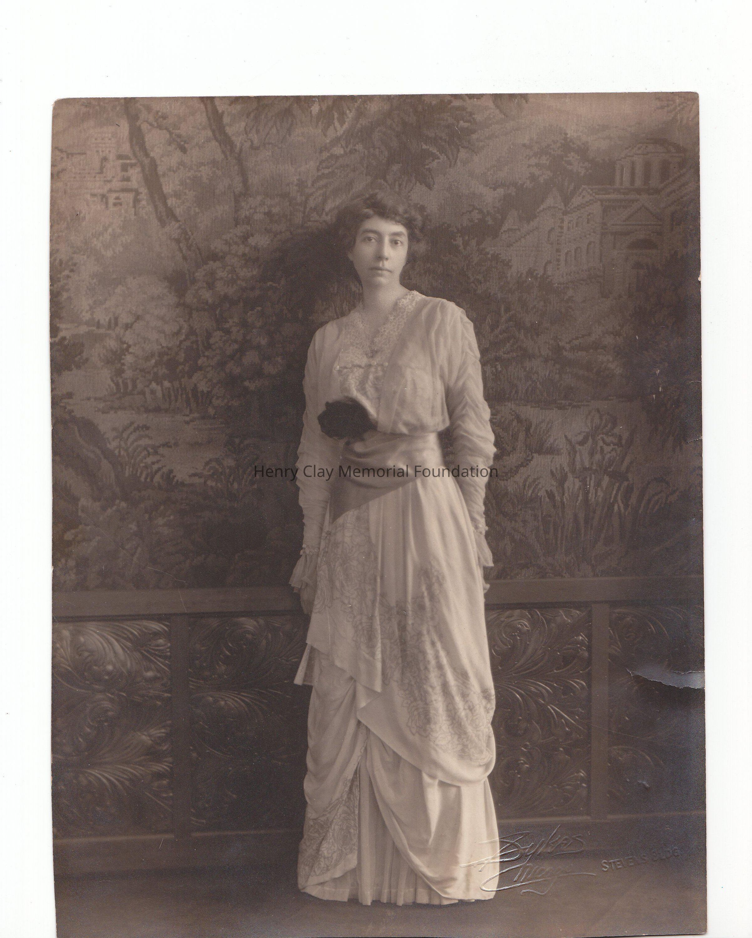 A black and white photograph of a woman with a light colored turn of the century dress, with a flower pattern o the skirt, lace bodice, a wide asymmetrical silk belt, with a big flower.